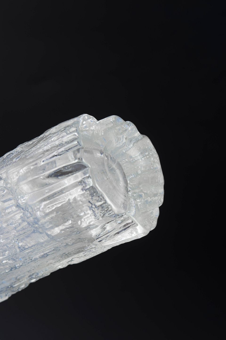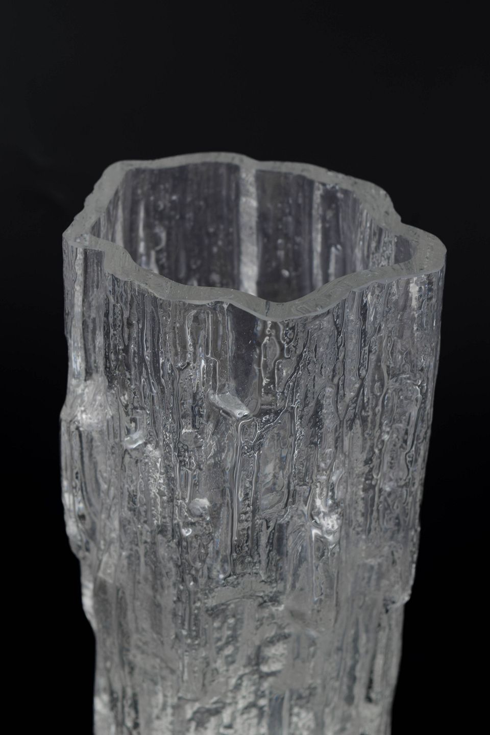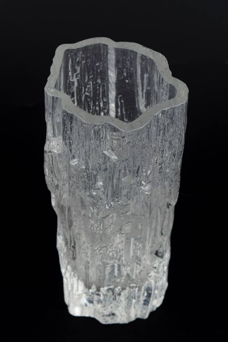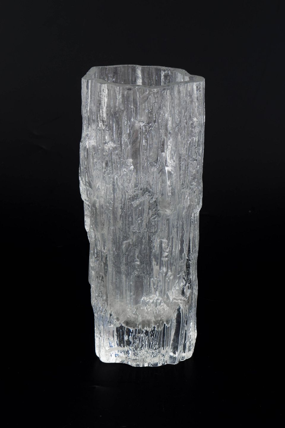 Tapio Wirkkala for Iittala, vase.Clear glass vase with a pronounced ice-textured surface and vertical relief patterns inspired by melting ice. Tall, slender cylindrical form with a slightly irregular rim. Unmarked.