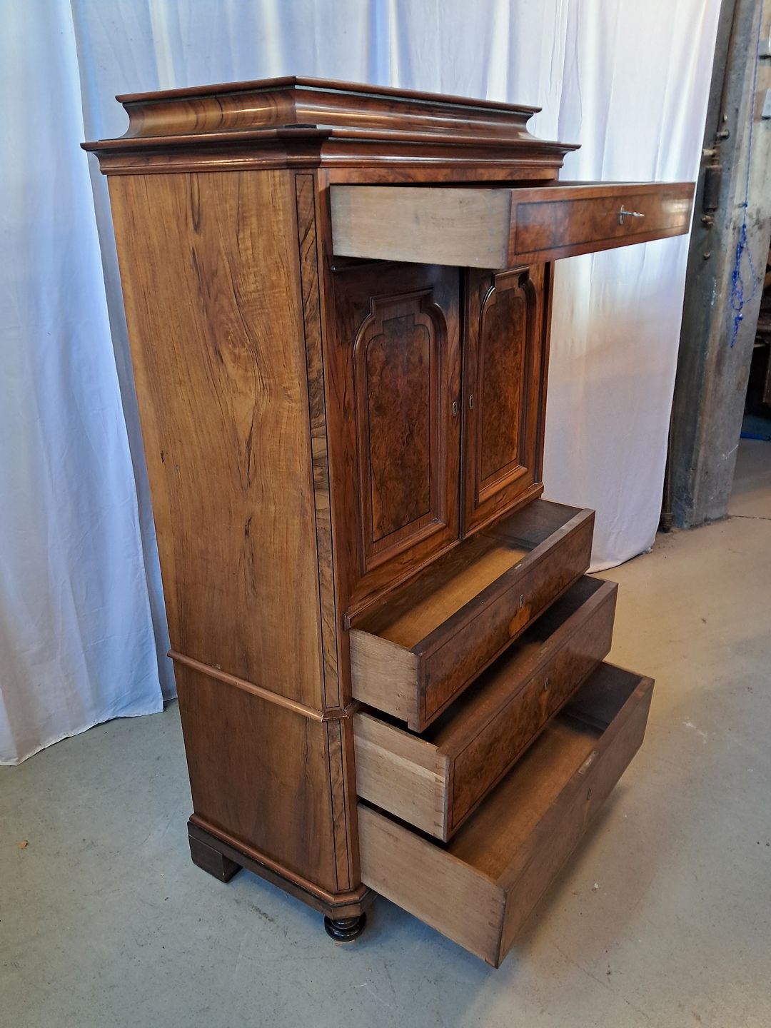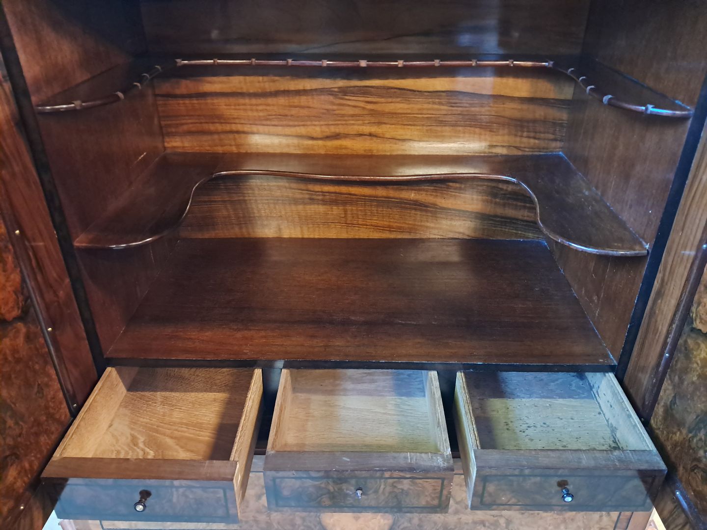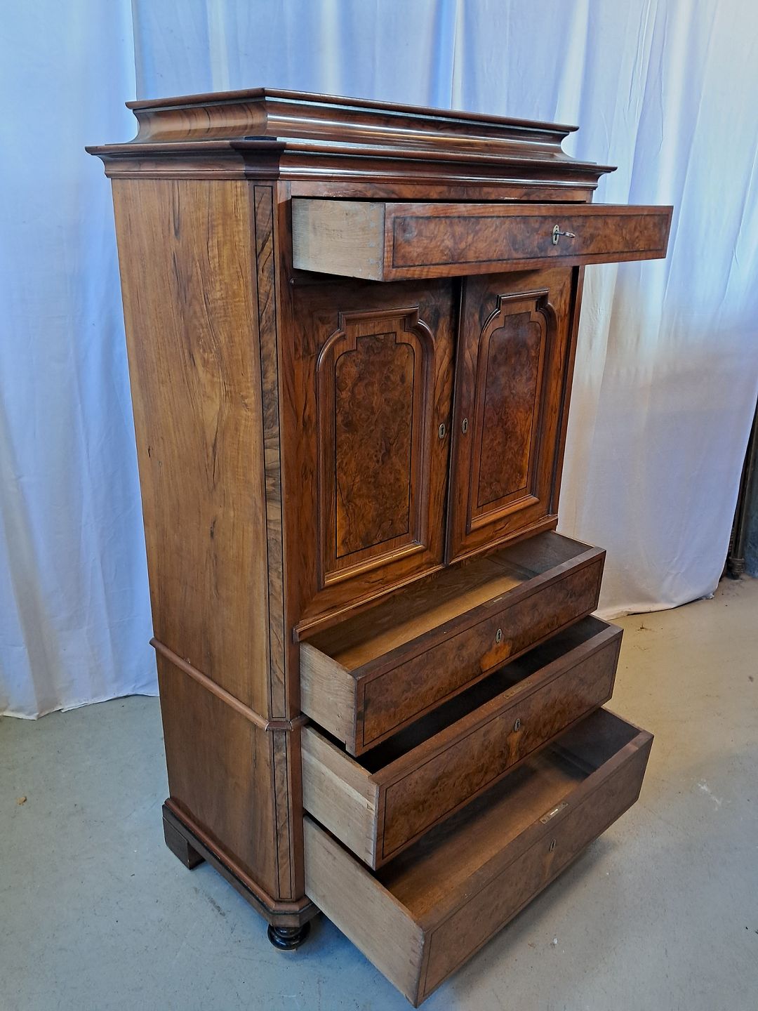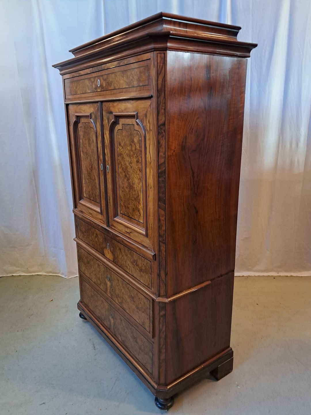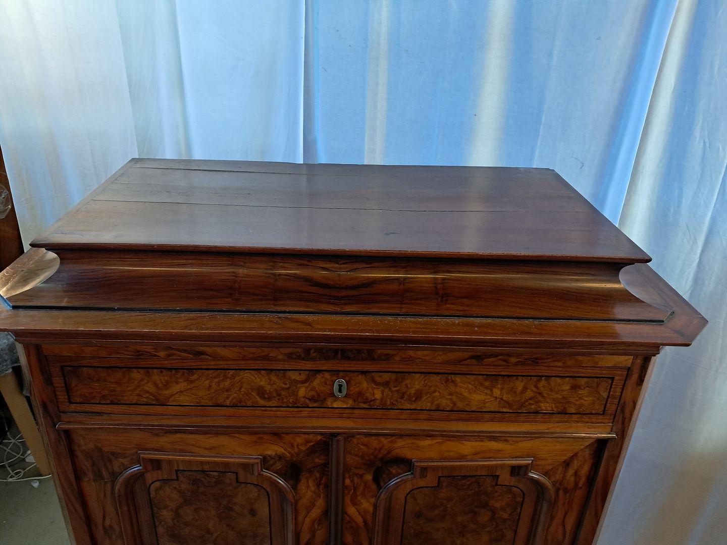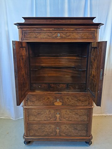 Skab i fineret mahogni og nøderod, fra 1900erne.Det har brugsspor og en defekt liste.(se foto)