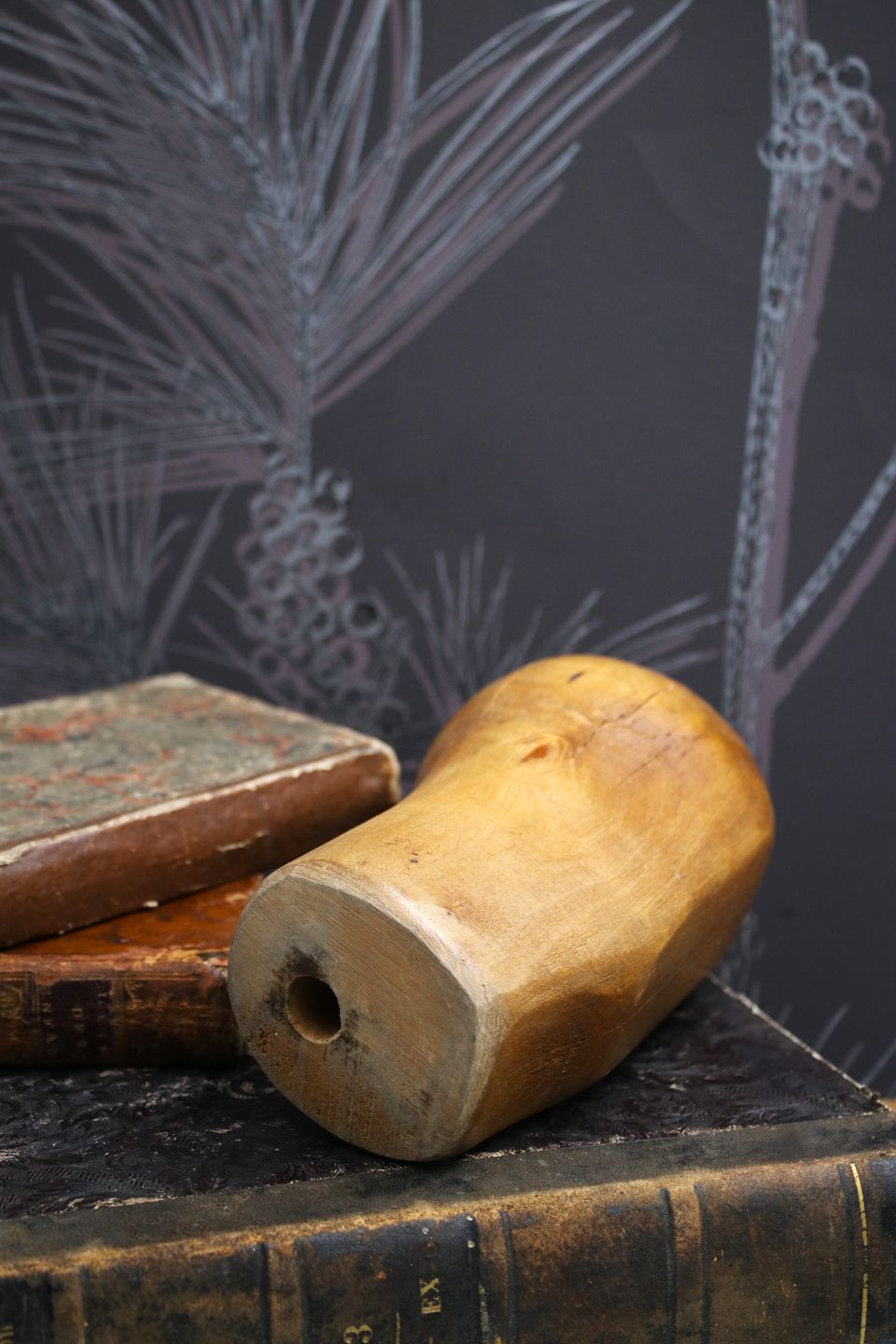 Decorative, antique mini hat head in carved wood with a really nice patina...