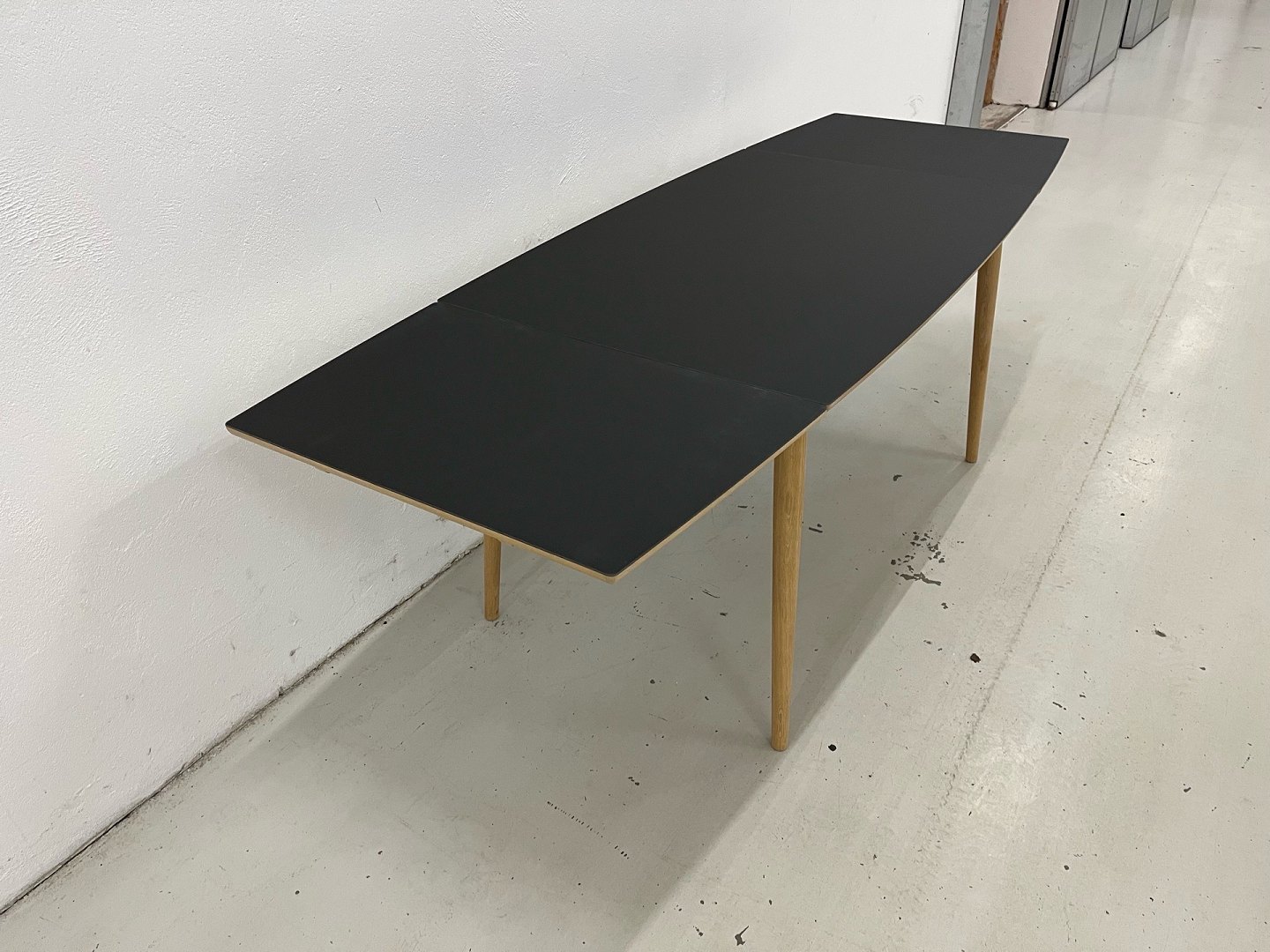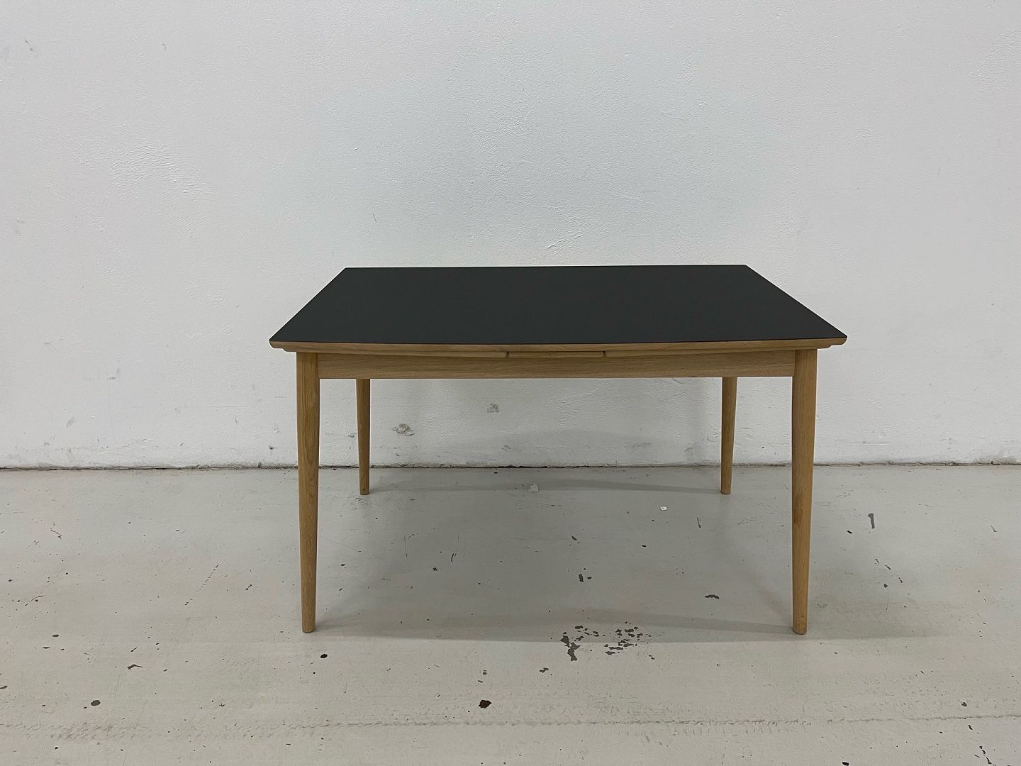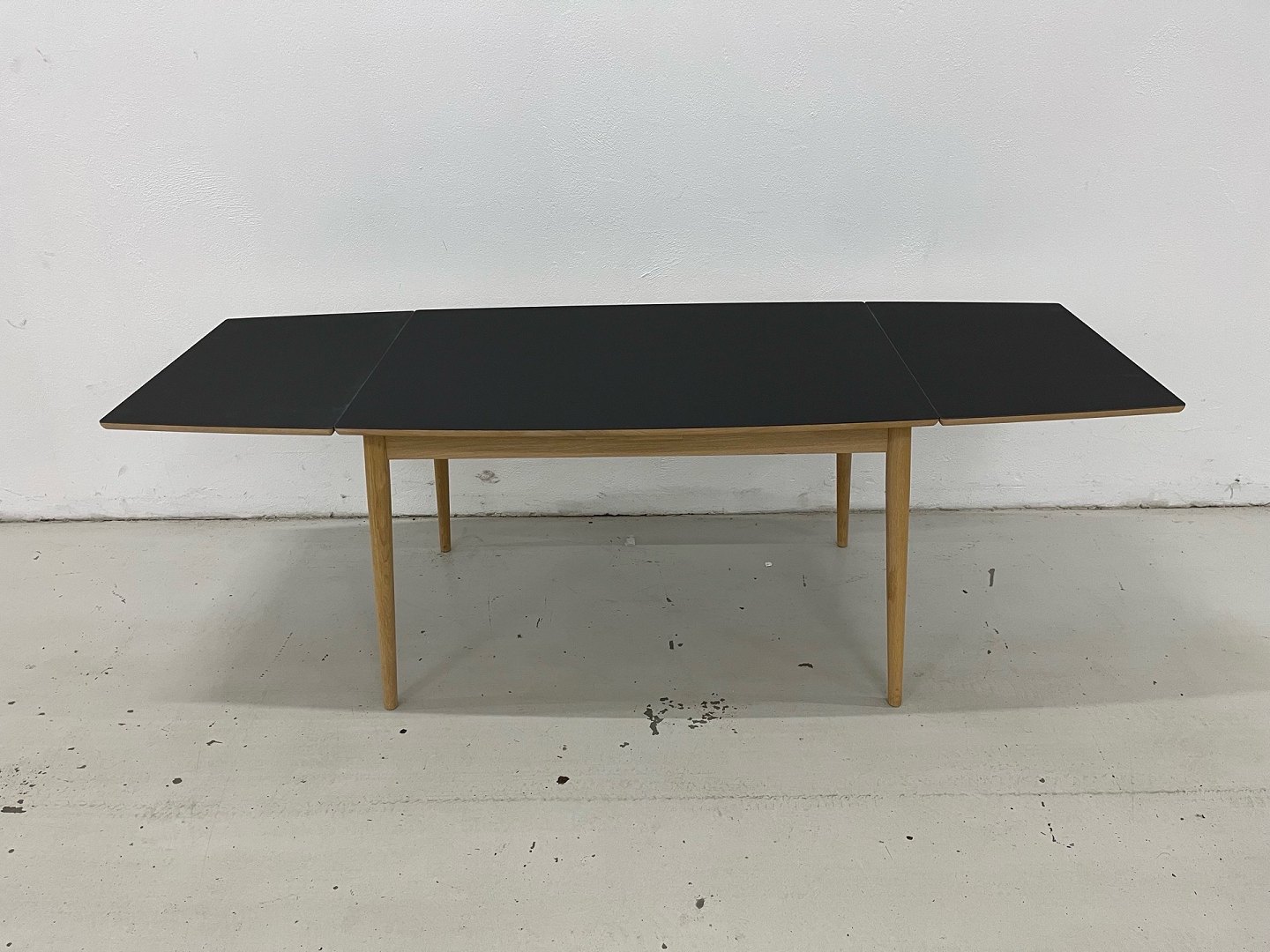 Curve dining table from Pbj Design with 2 x Dutch pull-outs. Tabletop in black linoleum and frame and legs in soap-treated oak. Original new price: DKK 15,999. The table has only been set up for a short period and has subsequently been stored separately in a room. It appears as new with minimal use. Comes from a non-smoking home without pets or children. Continued right of complaint included. Measurements: Length: 122-222 cm Width: 82 cm Height: 75 cm Our concept Professional purchase of newer and used quality furniture Thorough cleaning and treatment with respect for the integrity and durability of the materials Showroom display by prior arrangement Dealer