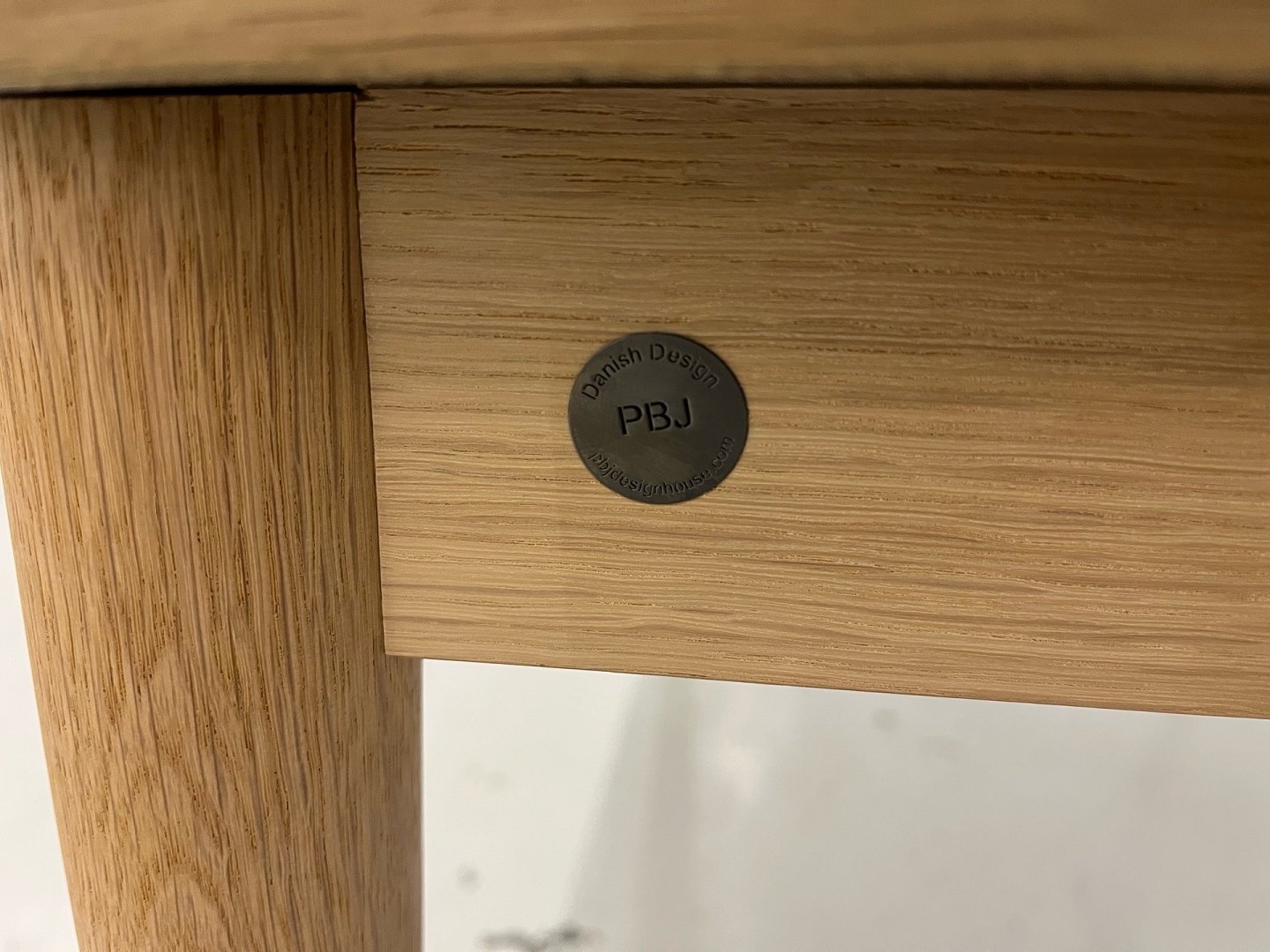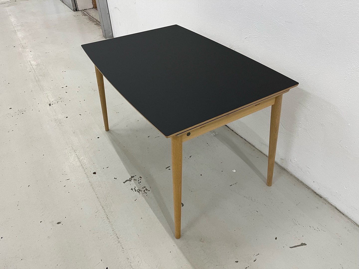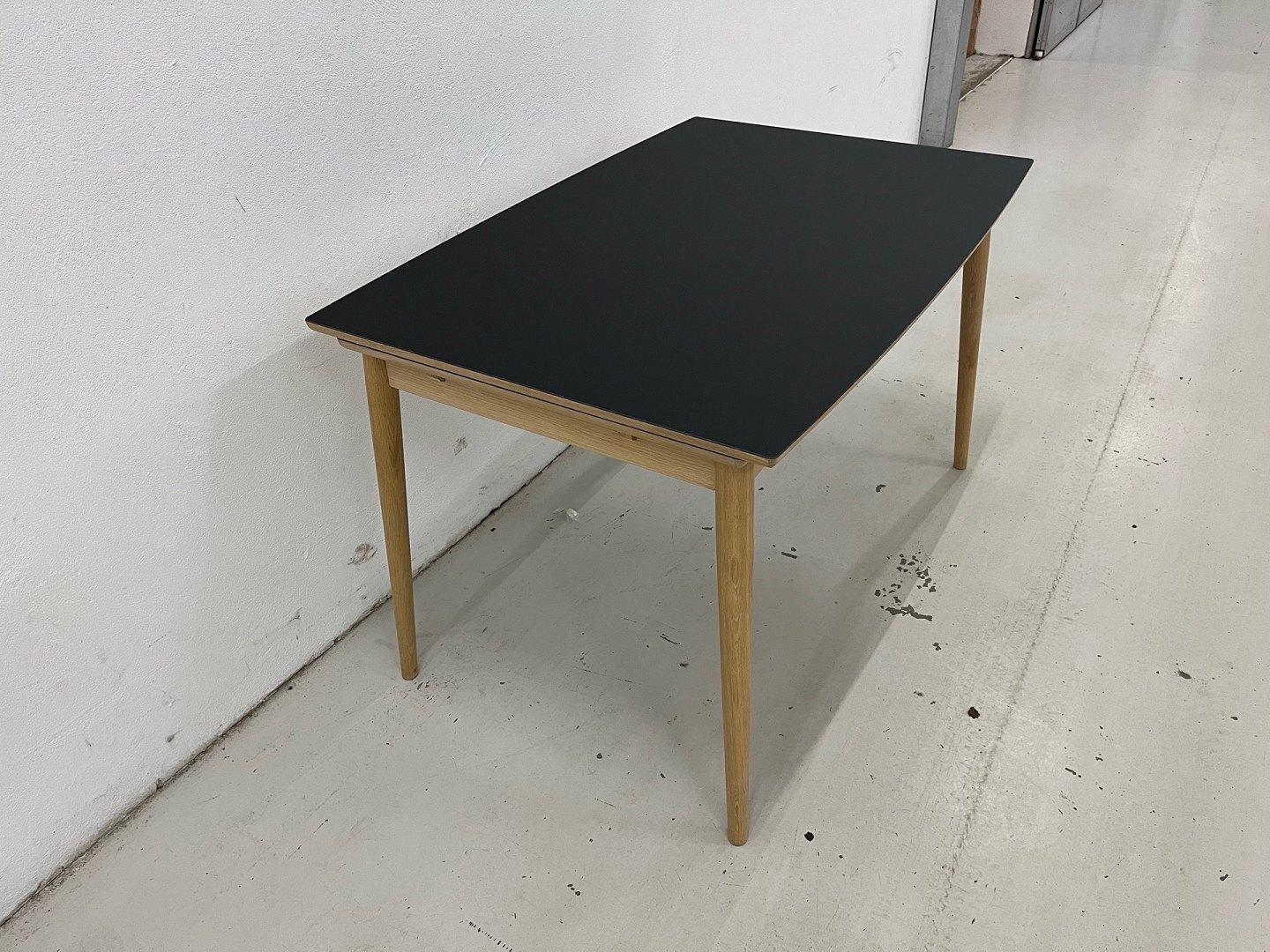 Curve dining table from Pbj Design with 2 x Dutch pull-outs. Tabletop in black linoleum and frame and legs in soap-treated oak. Original new price: DKK 15,999. The table has only been set up for a short period and has subsequently been stored separately in a room. It appears as new with minimal use. Comes from a non-smoking home without pets or children. Continued right of complaint included. Measurements: Length: 122-222 cm Width: 82 cm Height: 75 cm Our concept Professional purchase of newer and used quality furniture Thorough cleaning and treatment with respect for the integrity and durability of the materials Showroom display by prior arrangement Dealer