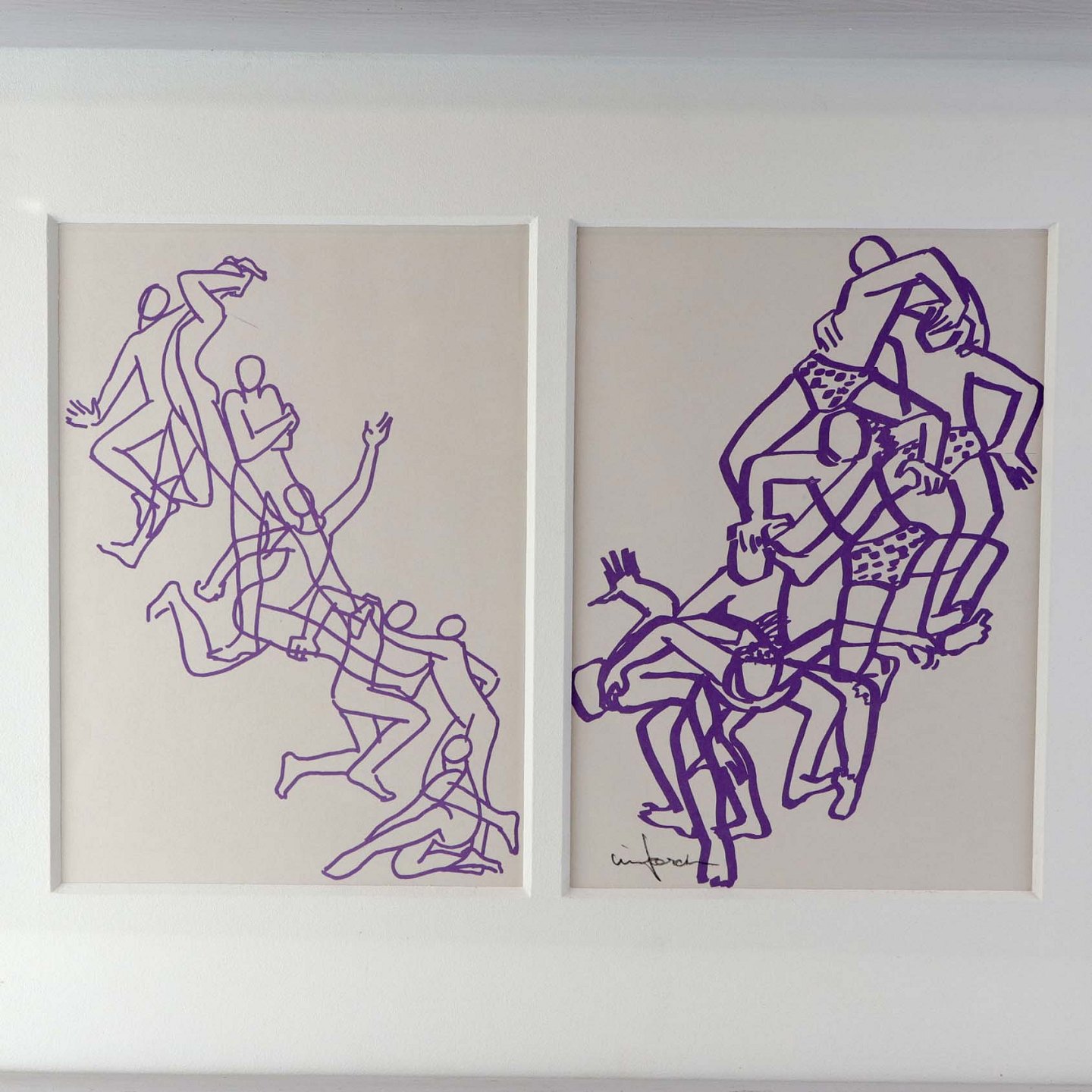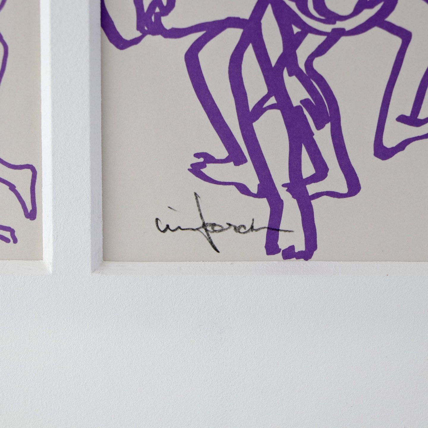 Litografi med passepartout i gråmalet træramme og motiv af mennekser i bevægelse i lilla streg.Kunstner Lise Færch (1918-99)