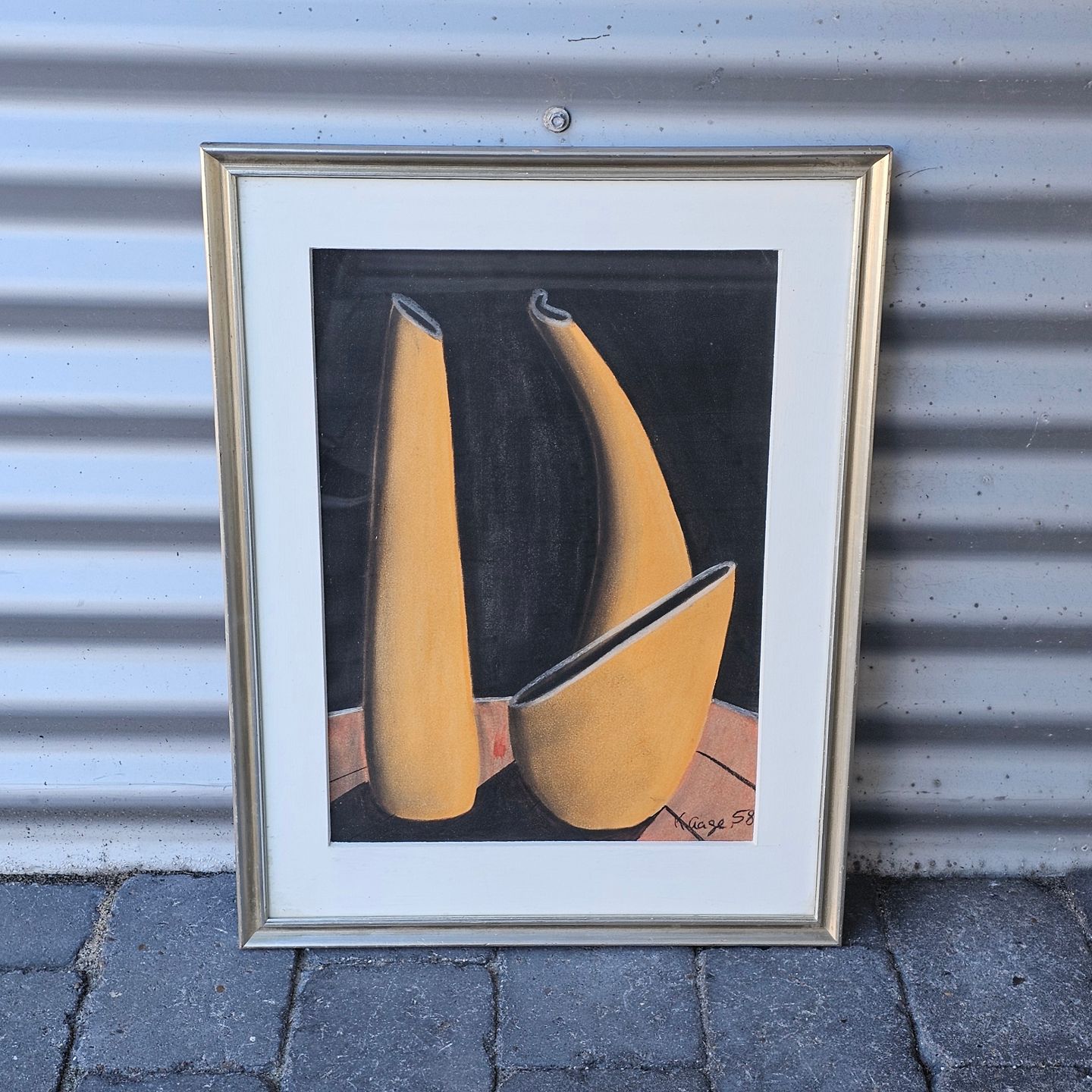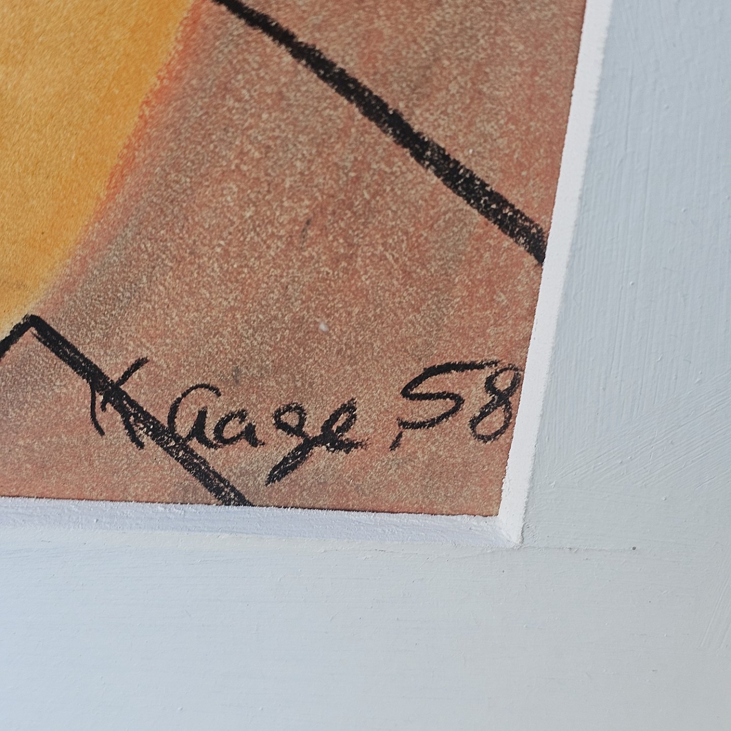 Tryk på papir monteret i hvid ramme med abstrakt motiv af gule former på sort baggrundKunstner ukendt, signeret K. Aage 58