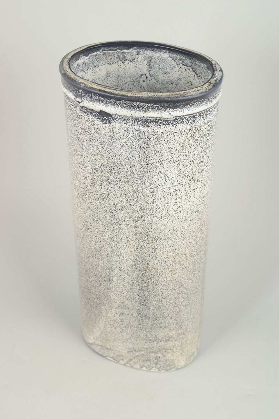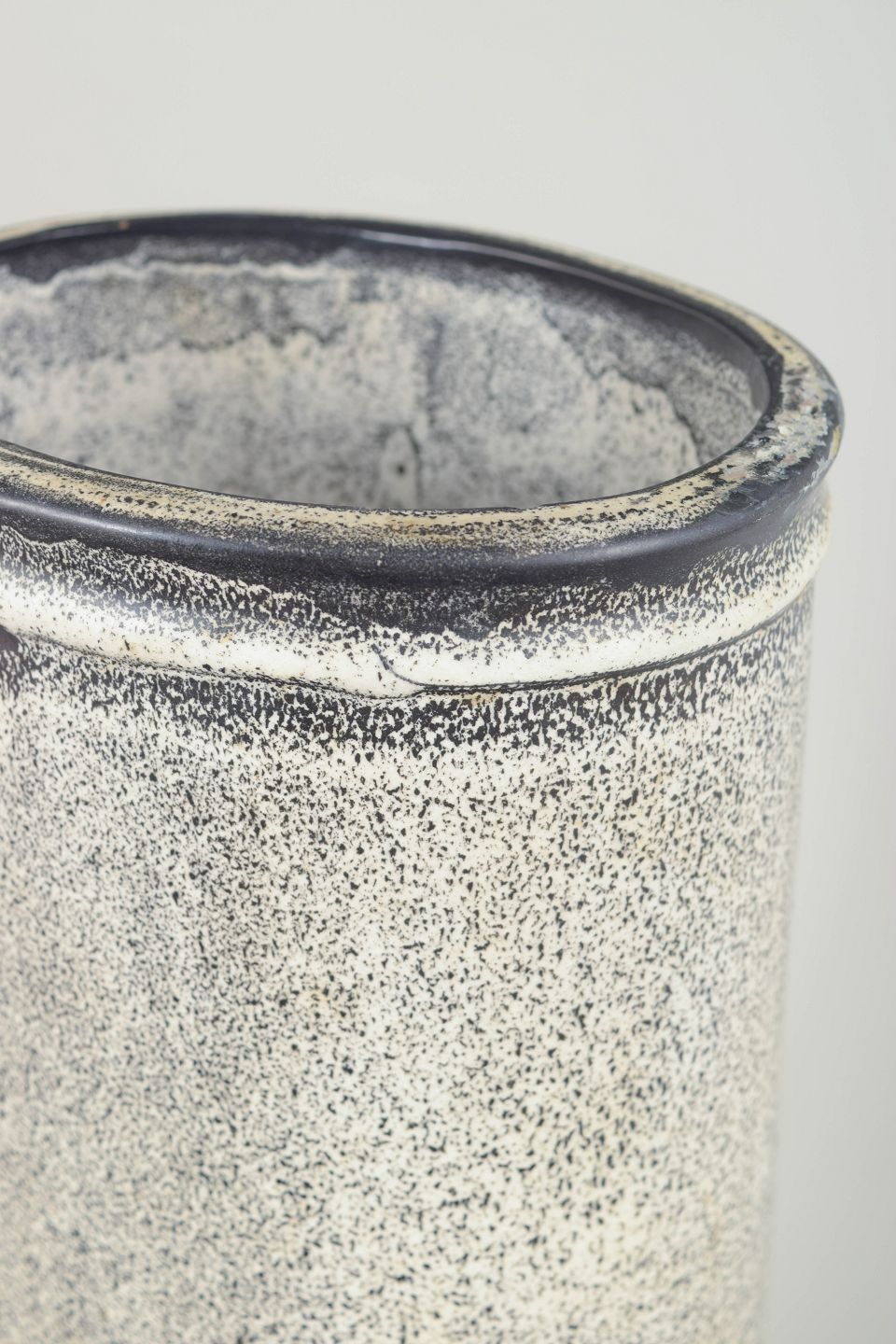 Svend Hammershøi for Kähler, large vase.Large stoneware vase with a cylindrical form and characteristic double glaze in black and grey tones with a lively, lightly crackled surface. A strong example of Hammershøi’s monumental design language and experimental glaze work from the 1930s. Marked on the base.