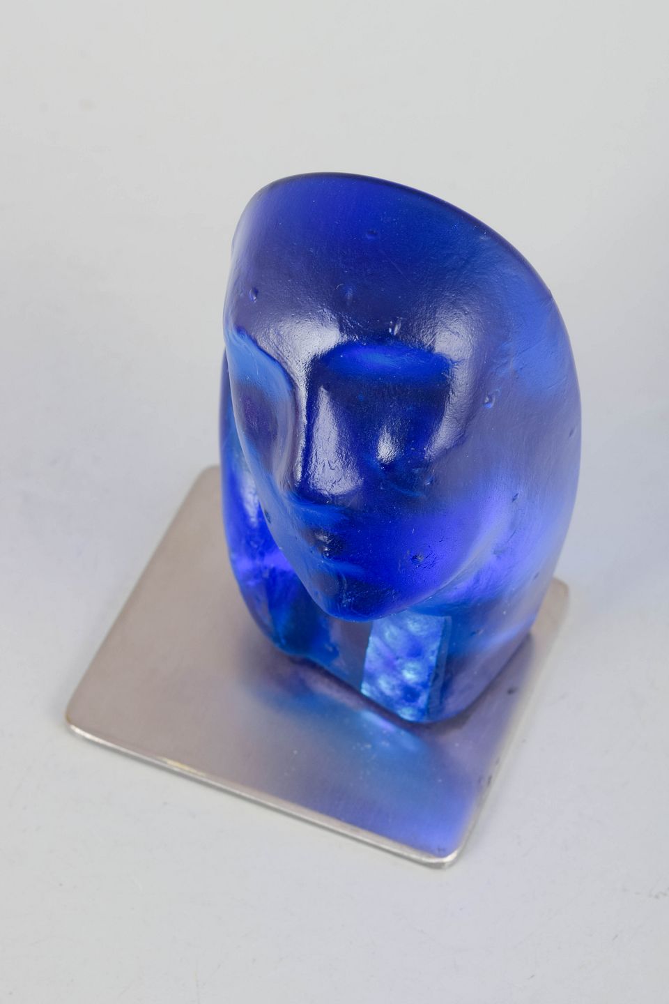 Georgianna Kralli, unique studio glass sculpture "Ung II".Organically shaped sculpture in mouth-blown glass with a deep blue tone and encapsulated figurative elements. Signed by the artist and produced in her own studio.