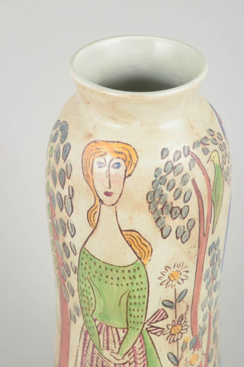 Carl-Harry Stålhane for Rörstrand, hand-painted vase.Slender stoneware vase with hand-painted figurative decoration in green, red and earthy tones, executed in a characteristic artistic style reflecting mid twentieth century Scandinavian ceramics.