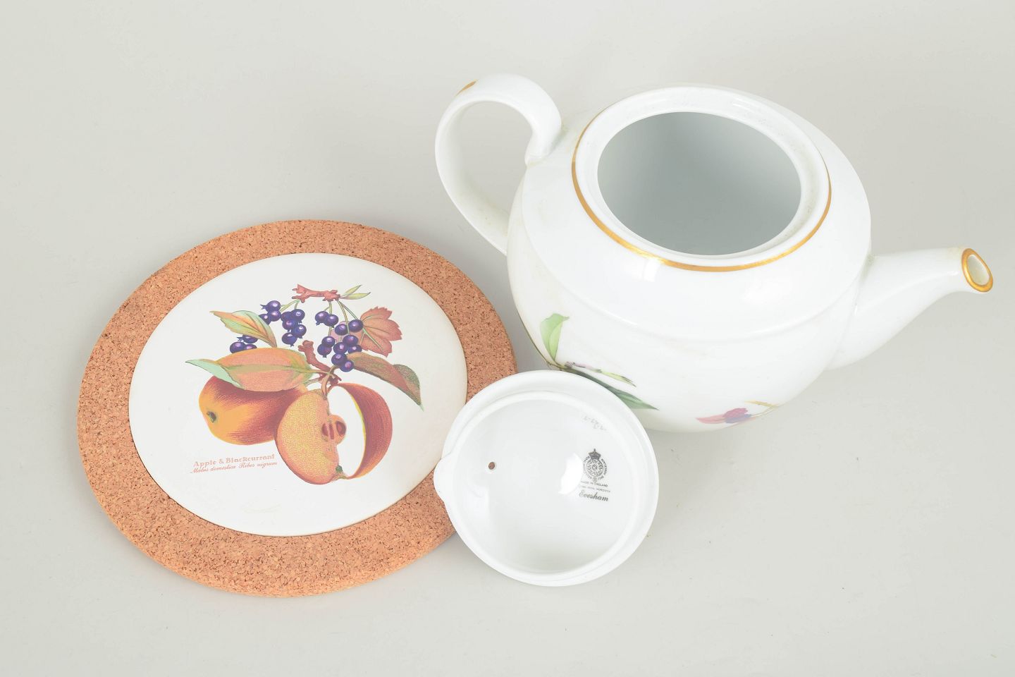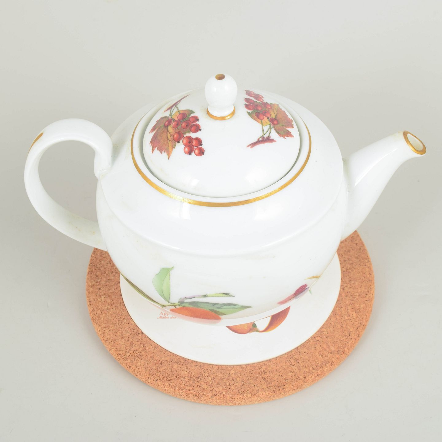 Royal Worcester Evesham, teapot with stand.Porcelain teapot with classic fruit decoration in warm tones and a gilt rim, with matching stand. Evesham model.