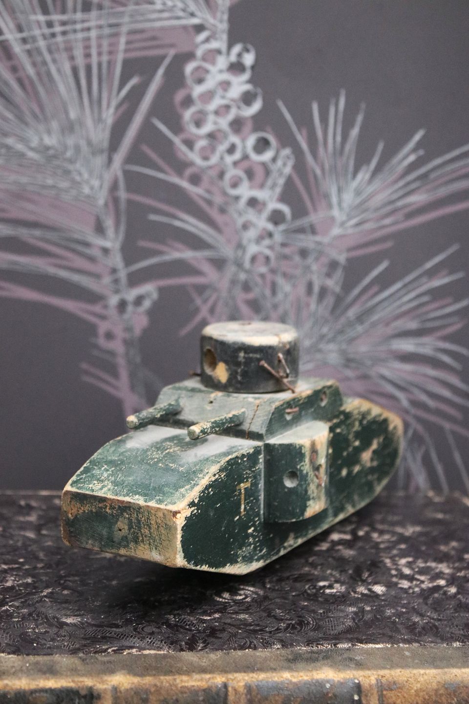 Decorative, old vintage tank in green painted wood with a nice old patina. H: 9.5cm. L: 20cm.Item number: Vintage kampvogn i træ