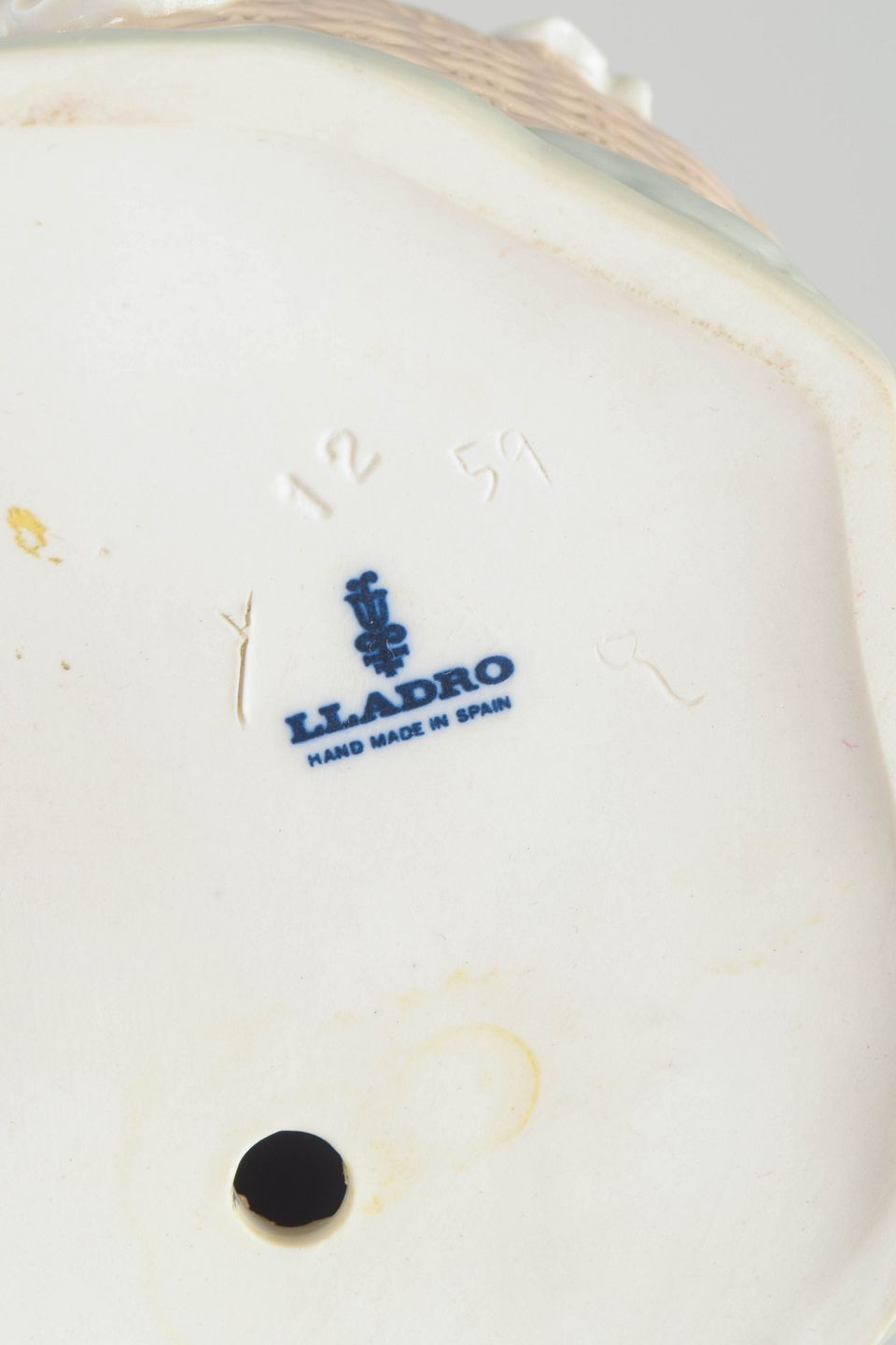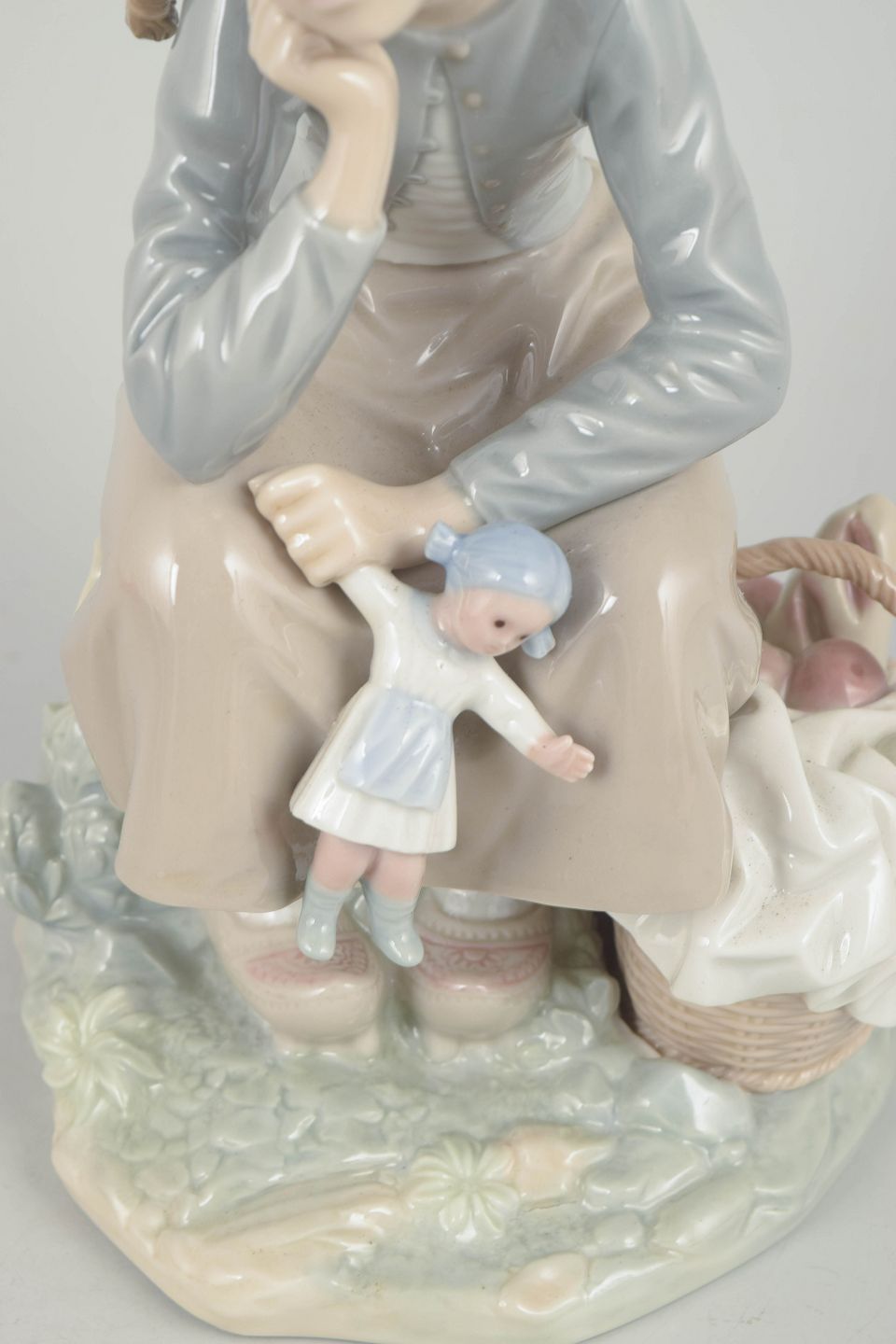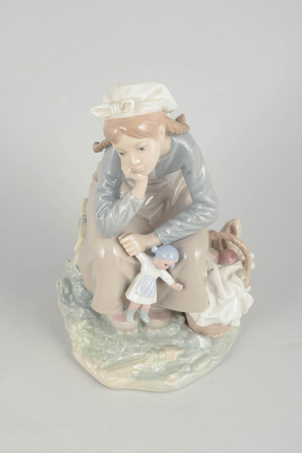 Lladró figurine, seated girl with doll.Fine porcelain figurine depicting a contemplative girl seated with a doll at her side and a basket. Executed in soft pastel tones with characteristic glaze and refined detailing.