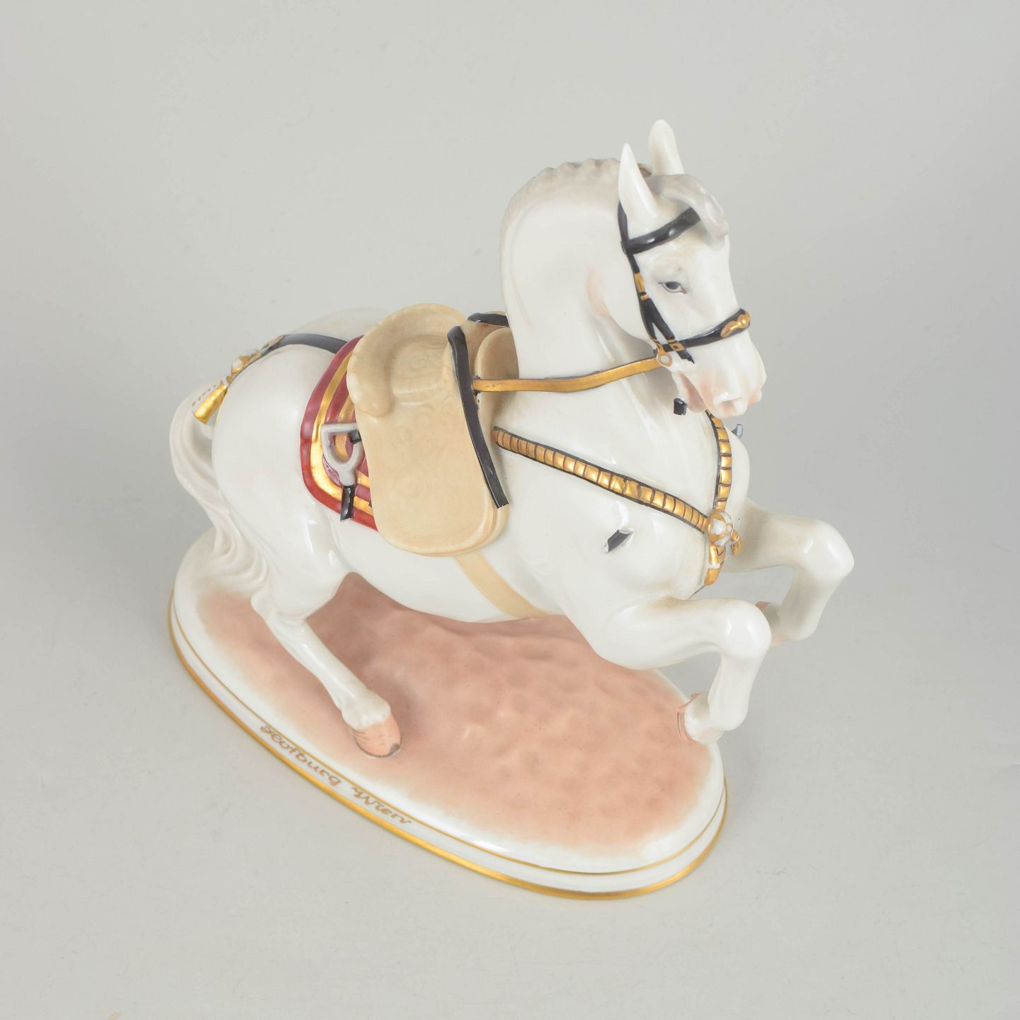 Augarten Vienna, horse figurine “Hofburg”.Finely modelled porcelain figure of a rearing horse with saddle and harness, decorated with delicate polychrome and gilt details. The “Hofburg” model, produced in Vienna and marked underneath.