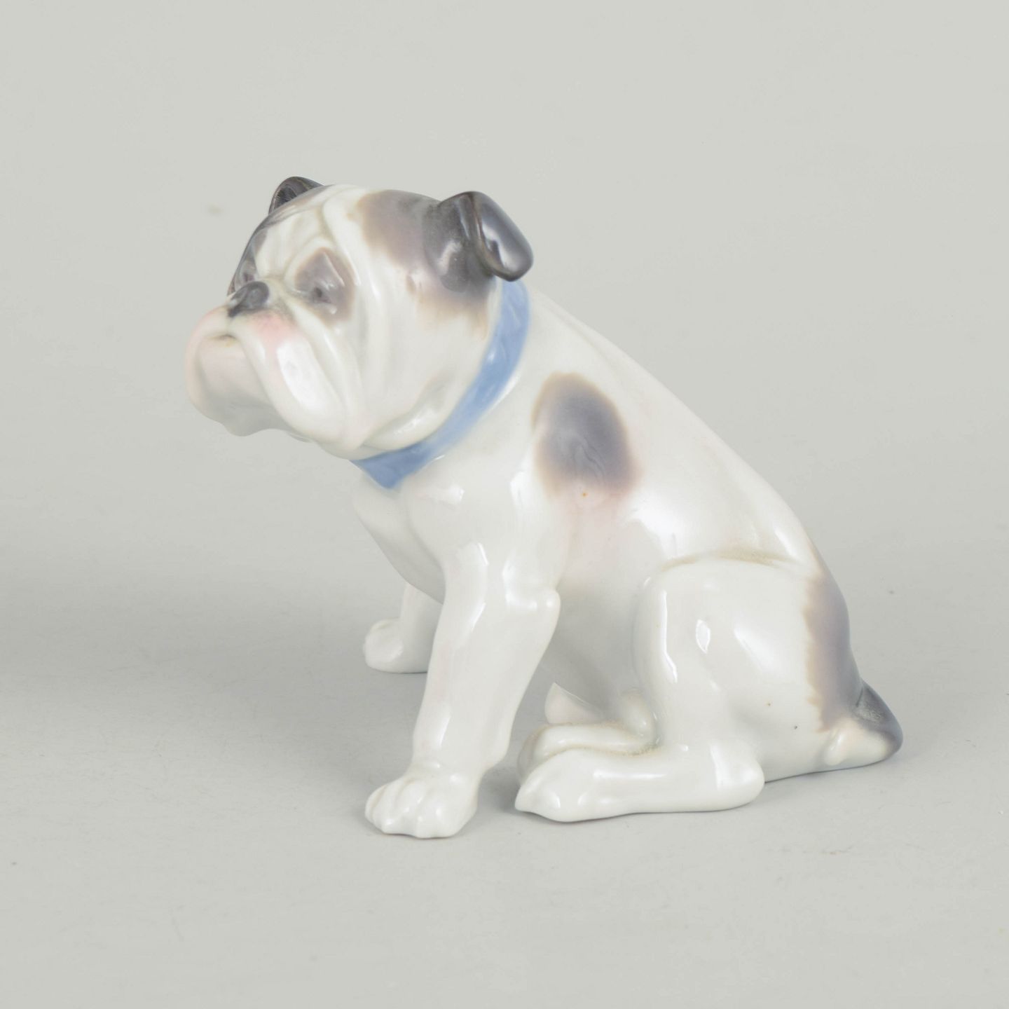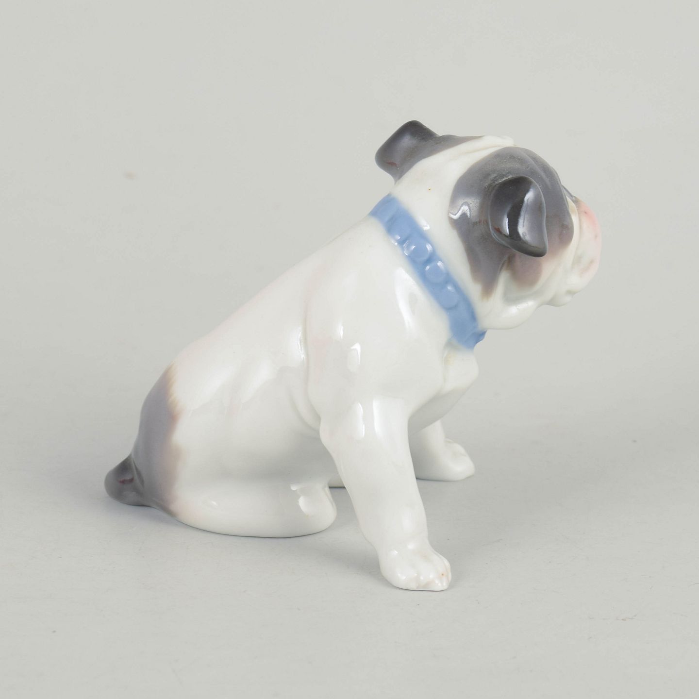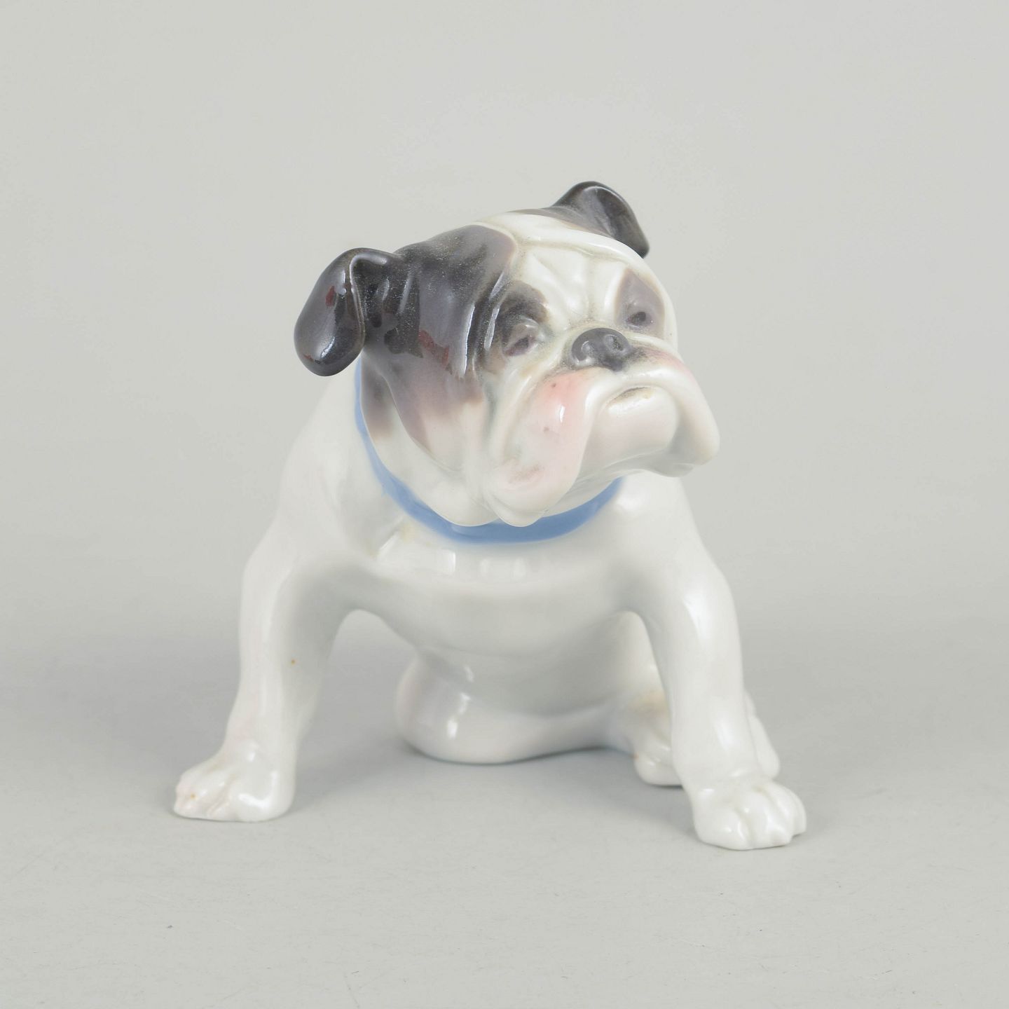 European porcelain figurine, French bulldog.Naturalistically modelled porcelain figure of a French bulldog with hand-painted details in grey, white and pink tones.