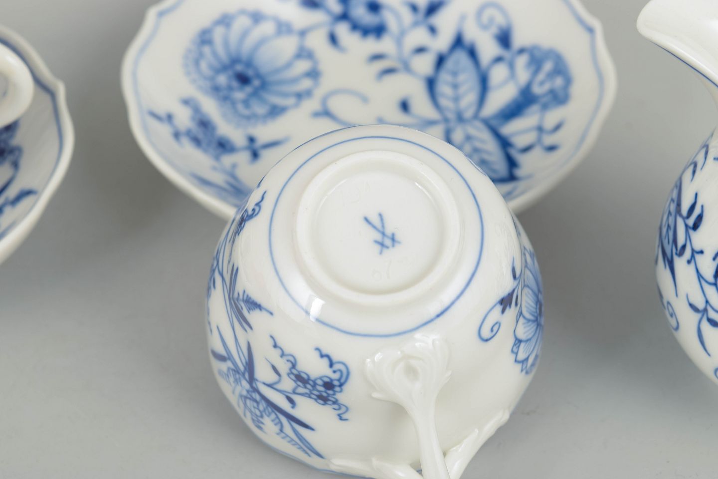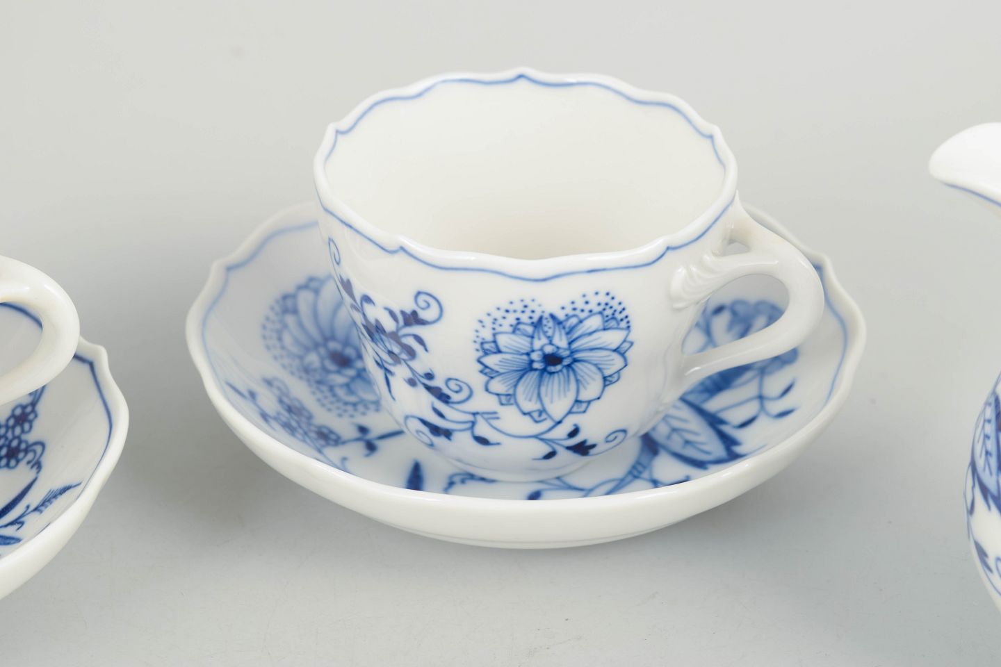 Meissen Blue Onion, set of two demitasse cups with matching saucers and creamer.Set consisting of two demitasse cups with matching saucers and a creamer in porcelain with hand-painted blue decoration in the classic Blue Onion pattern. Produced by Meissen in the mid 20th century and marked with Meissen crossed swords. Partly first factory quality and partly cancelled with two incised lines.
