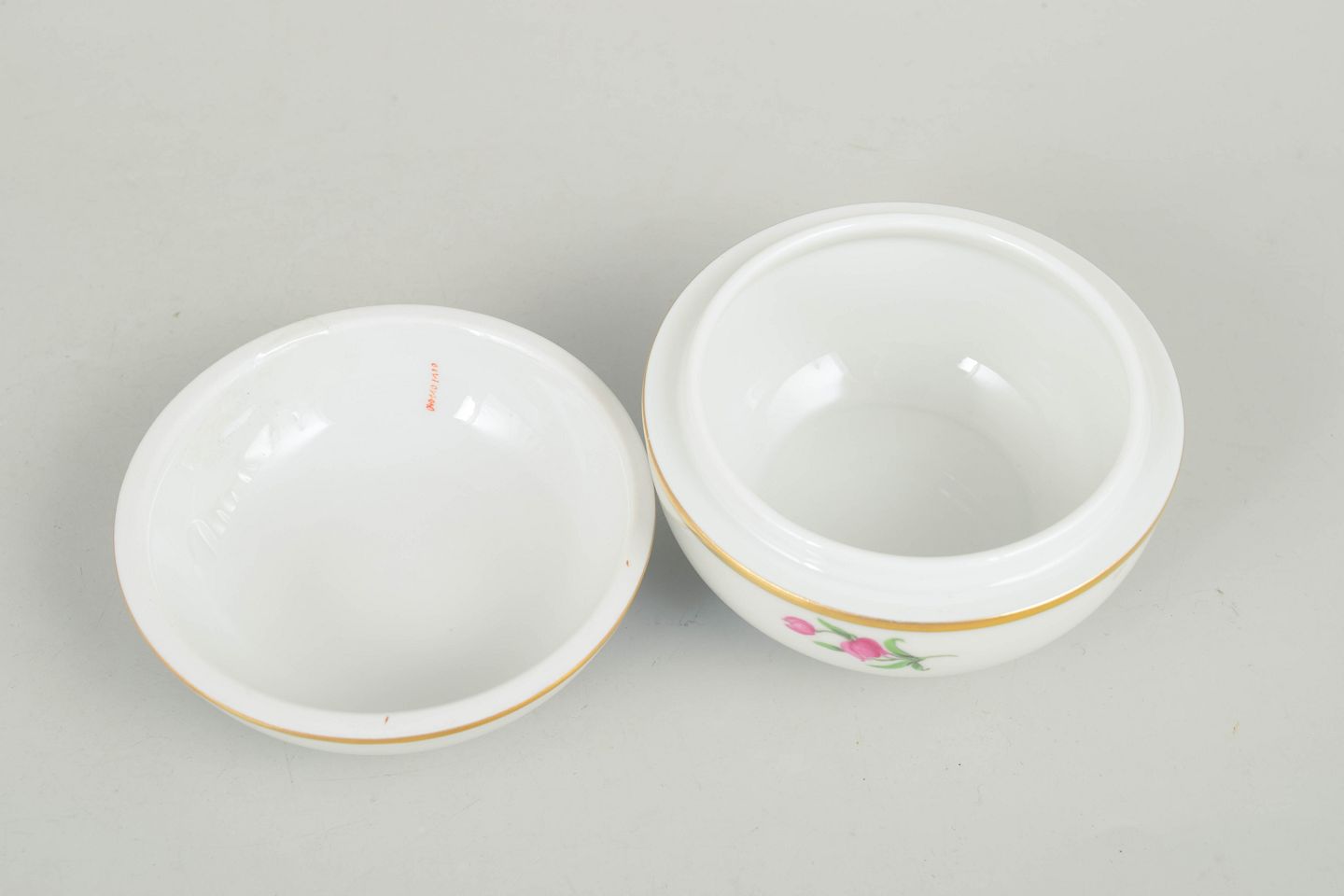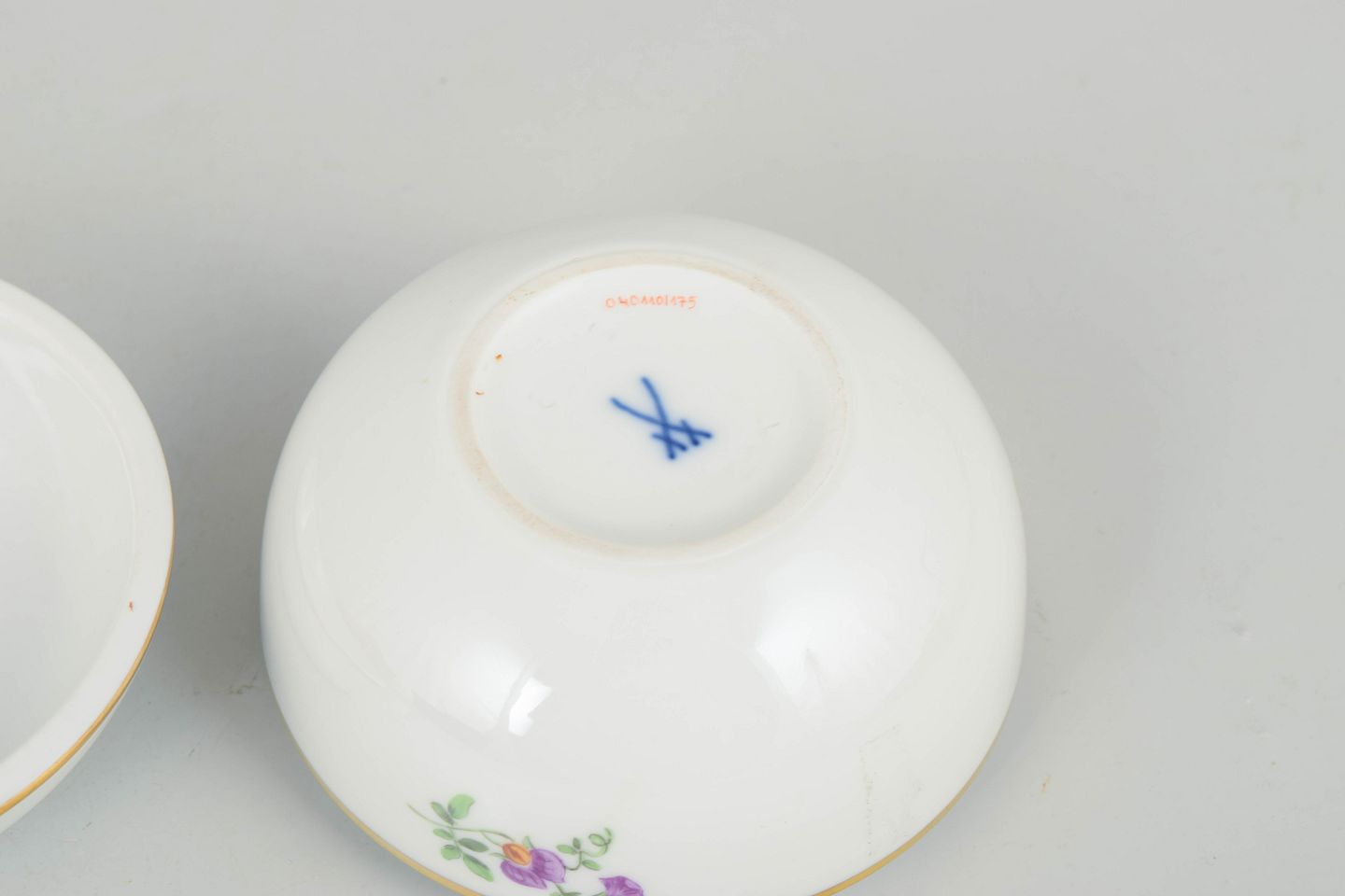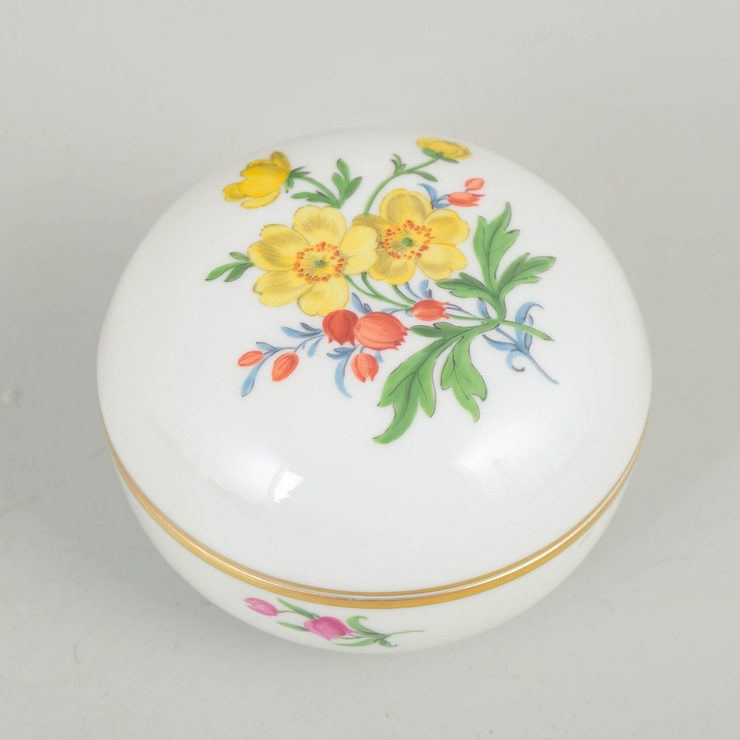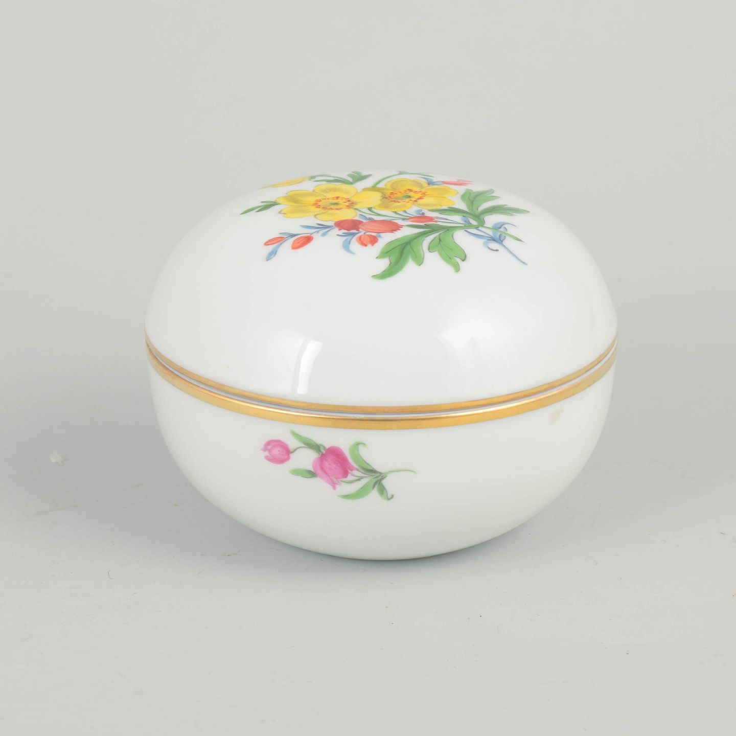 Meissen, lidded jar with polychrome flower decoration.Porcelain lidded jar hand painted with polychrome flowers and decorated with a gilt band. Harmonious rounded form with well-fitted lid and classic Meissen decoration from the mid 20th century. Marked on the base with Meissen crossed swords, first factory quality.