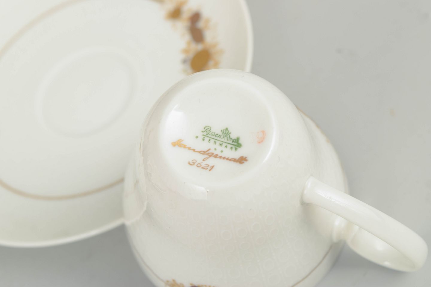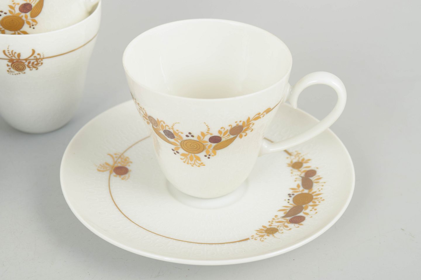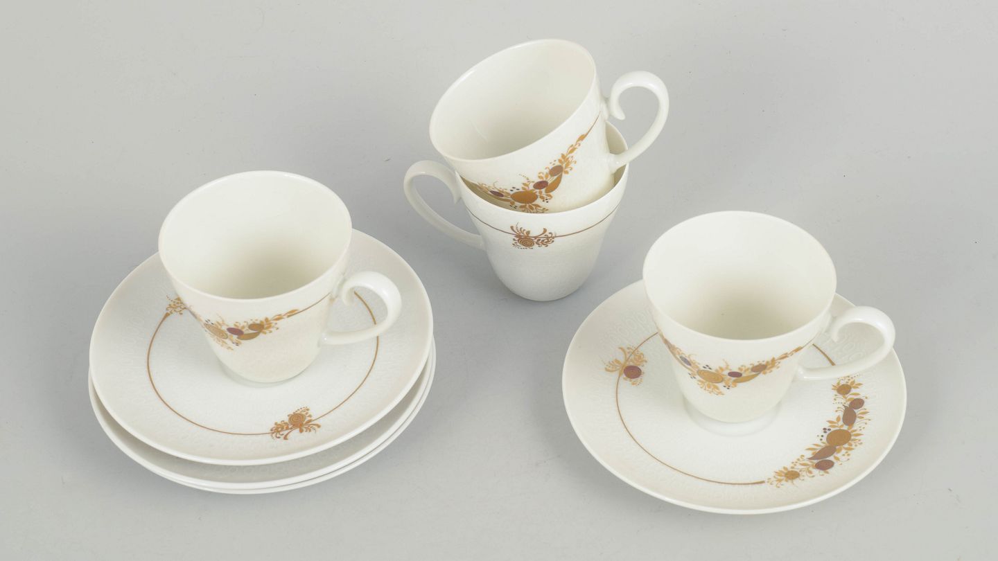 Bjørn Wiinblad for Rosenthal, set of four coffee cups with matching saucers.Set consisting of four coffee cups with matching saucers in porcelain decorated with the characteristic floral ornament from the Romanze series. The decoration appears in golden tones with fine detailing and an elegant, romantic expression, typical of Wiinblad’s design language in the 1970s.