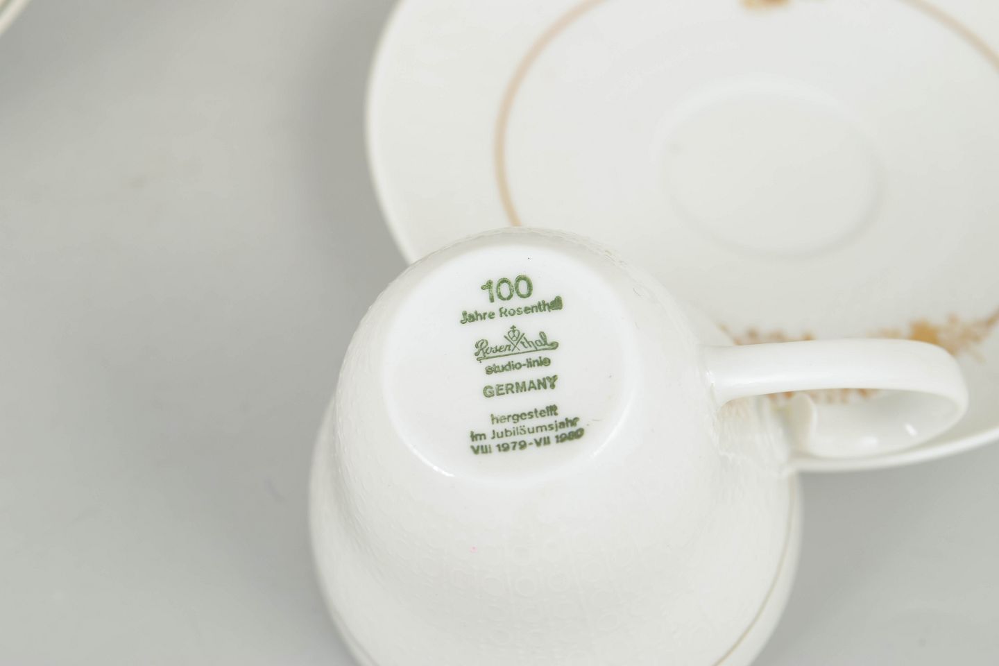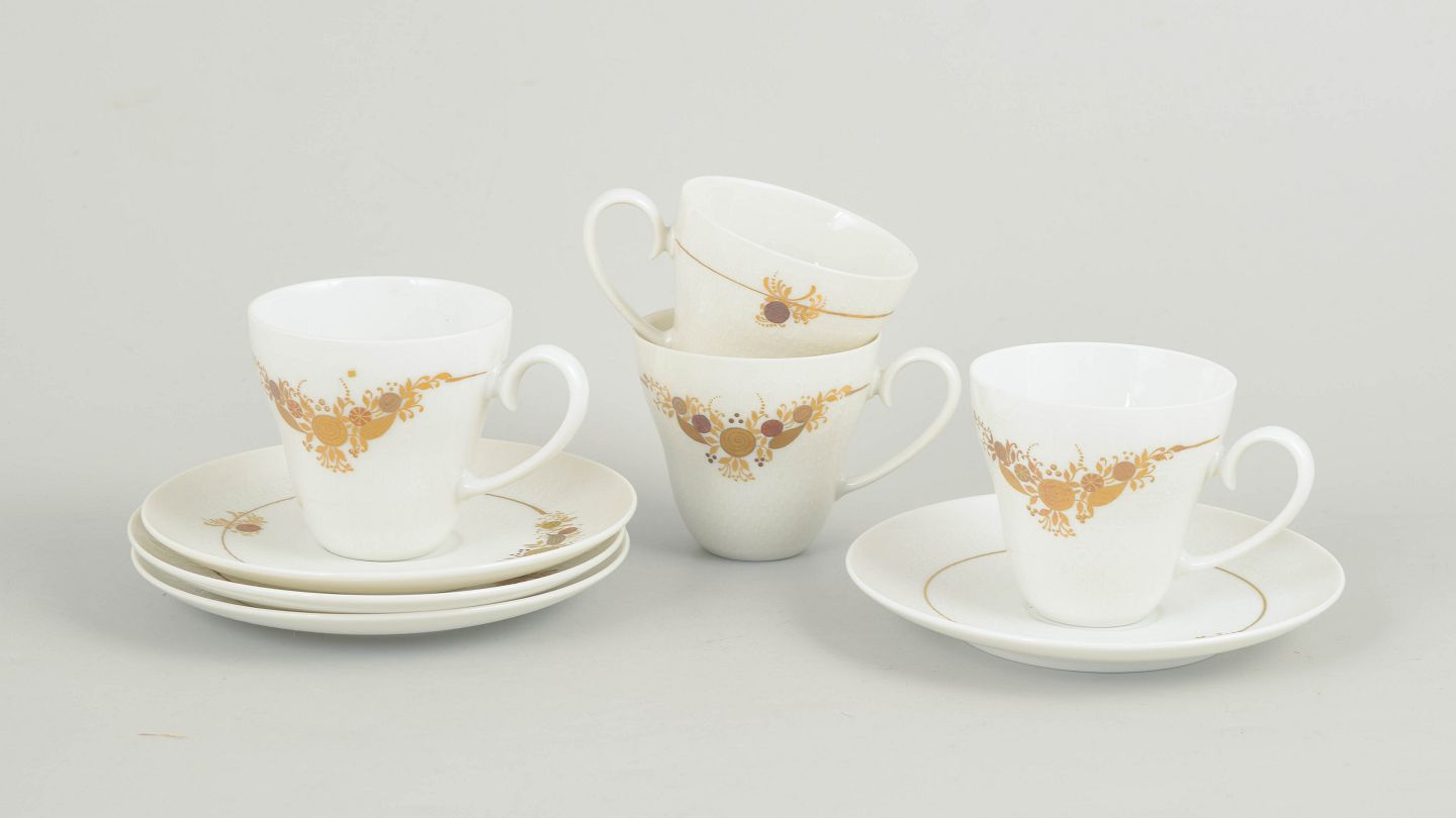 Bjørn Wiinblad for Rosenthal, set of four coffee cups with matching saucers.Set consisting of four coffee cups with matching saucers in porcelain decorated with the characteristic floral ornament from the Romanze series. The decoration appears in golden tones with fine detailing and an elegant, romantic expression, typical of Wiinblad’s design language in the 1970s.