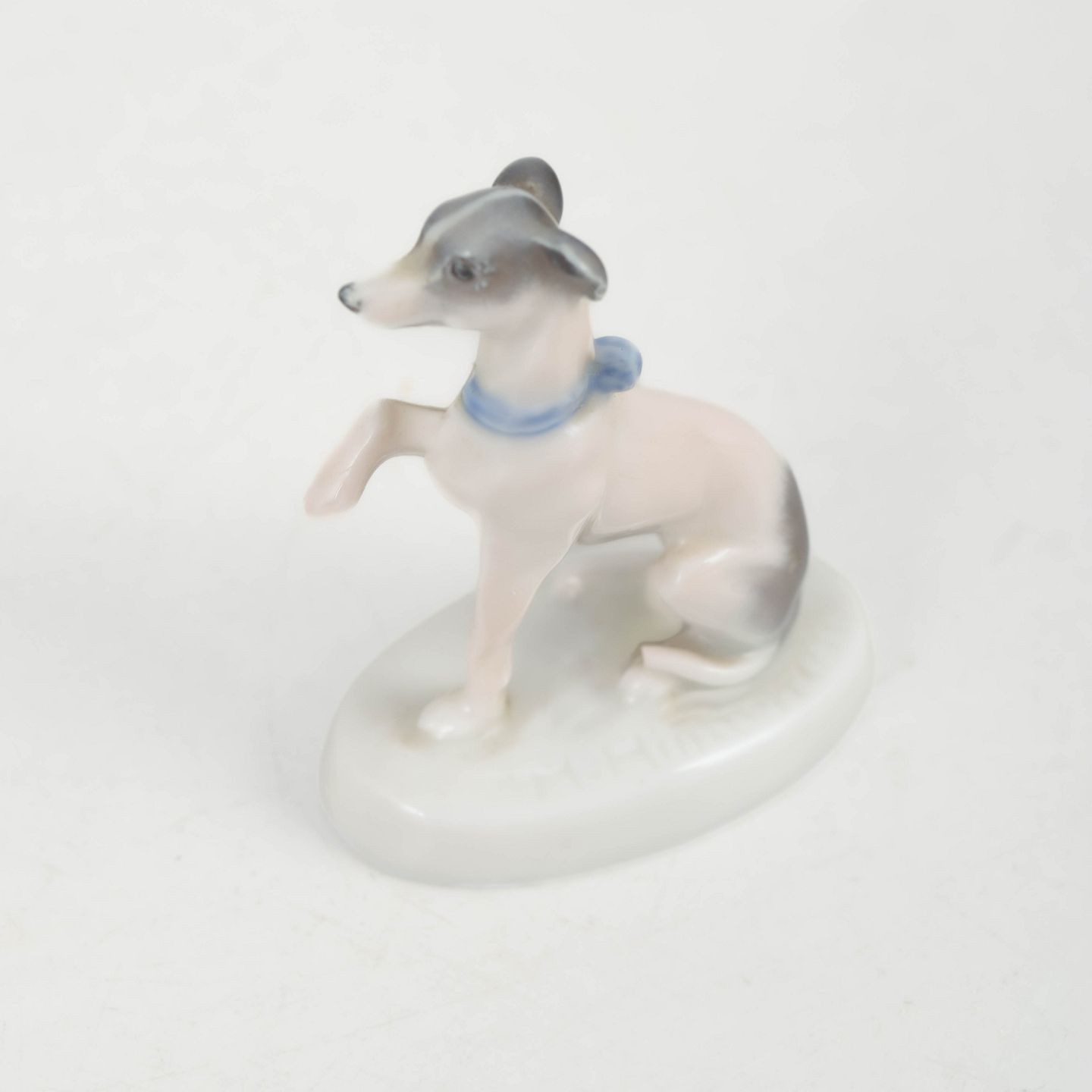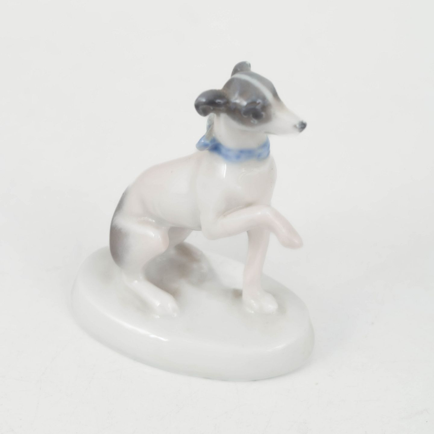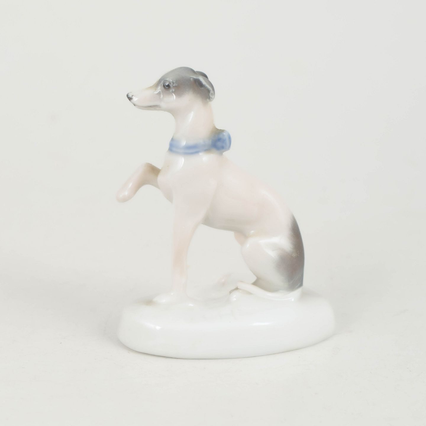 Rosenthal, greyhound figurine.Fine naturalistic porcelain figurine of a seated greyhound with raised paw and an elegant slender form. Executed with soft glaze transitions in light tones and signed R. Sh., produced by Rosenthal around 1927.