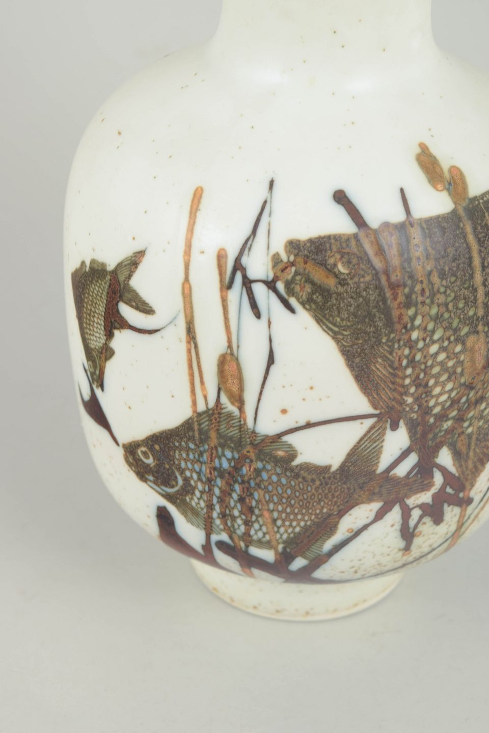 Large stoneware vase decorated with a stylised seabed motif featuring fish and aquatic vegetation in subdued brown, blue and green tones. Model number 1064 / 5363. First factory quality with original factory sticker.
