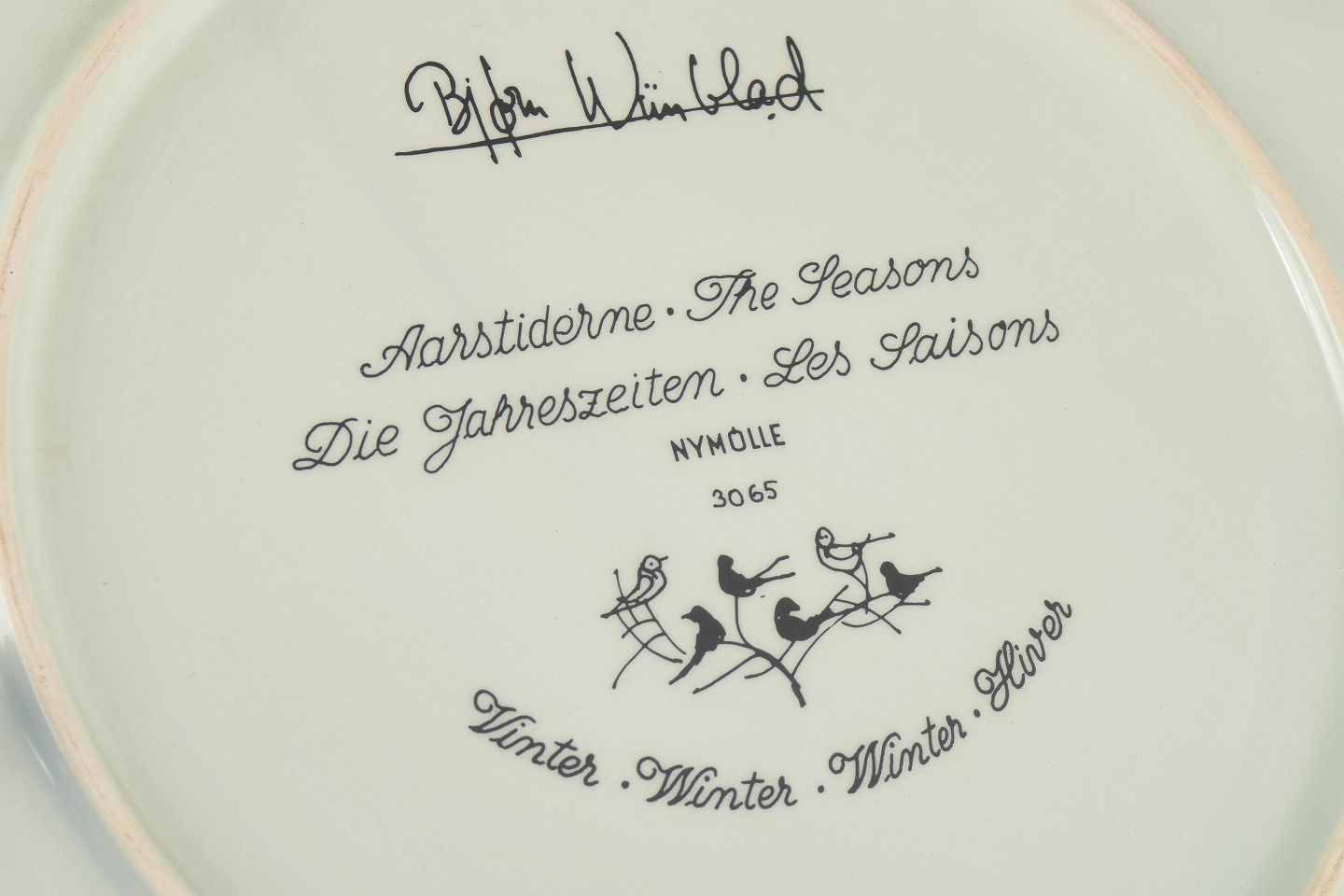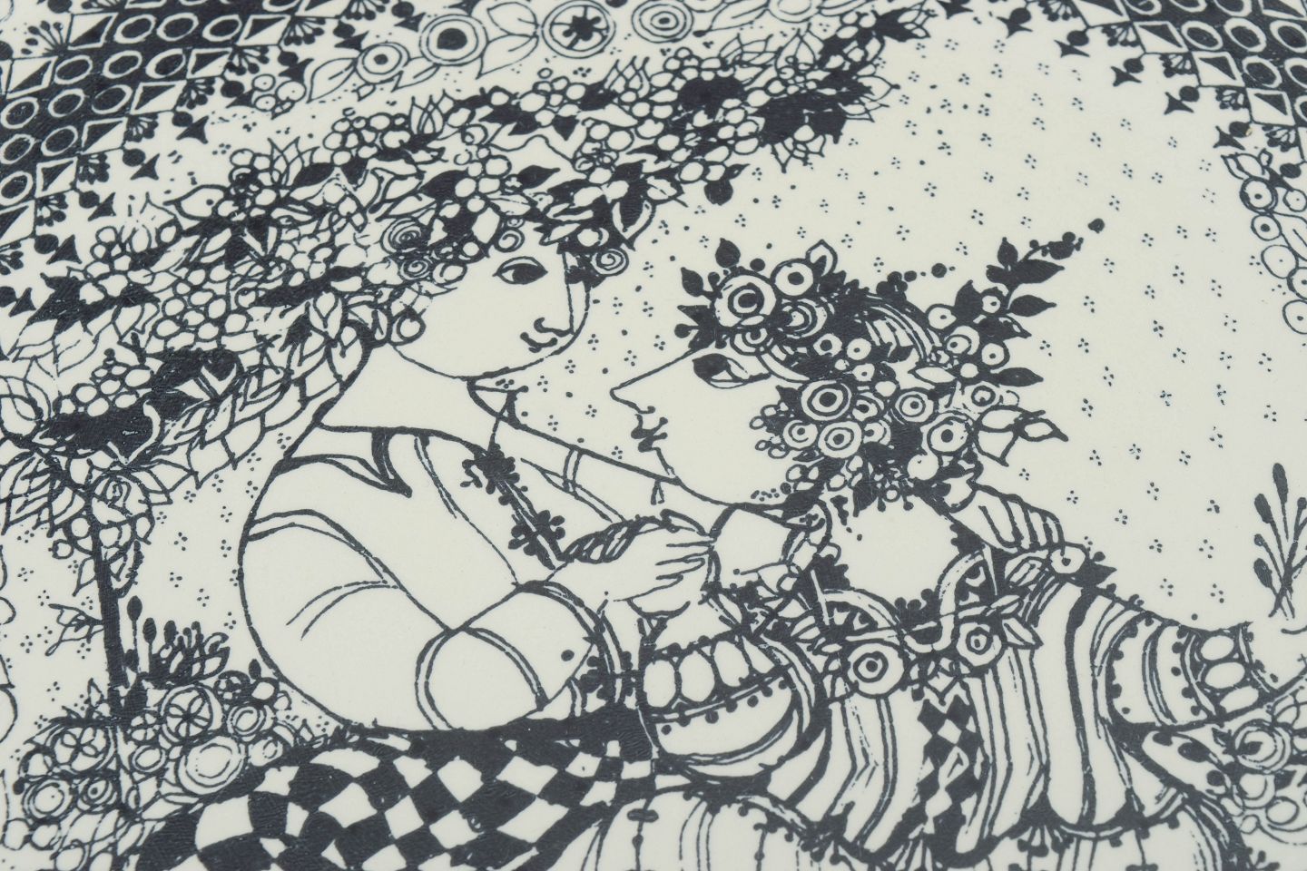 Bjørn Wiinblad for Nymølle, two large faience dishes “The Seasons” winter and spring.Decorative round faience dishes with black line decoration in Bjørn Wiinblad’s characteristic whimsical style, featuring figurative scenes and ornamental borders. The motifs represent the seasons winter and spring.