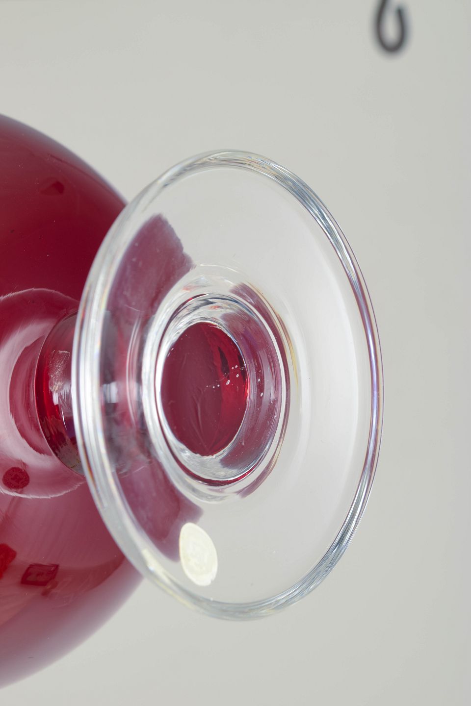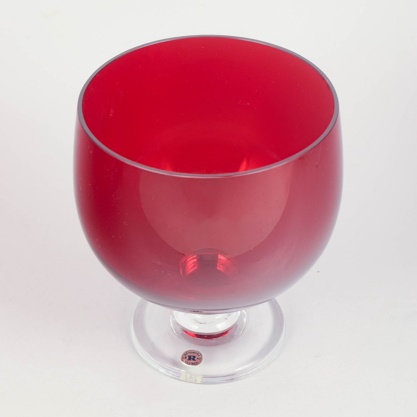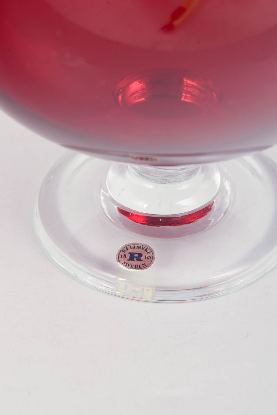 Reijmyre, large footed glass.Mouth-blown glass in clear and red tones with a rounded bowl and short stem on a wide foot. Original Reijmyre Glasbruk sticker preserved.