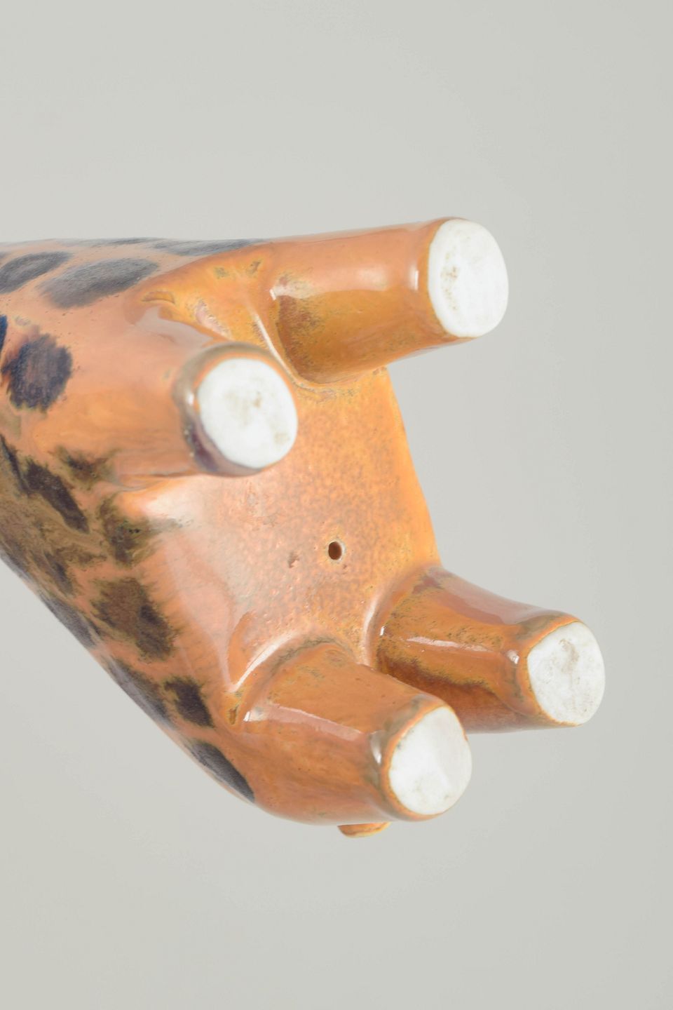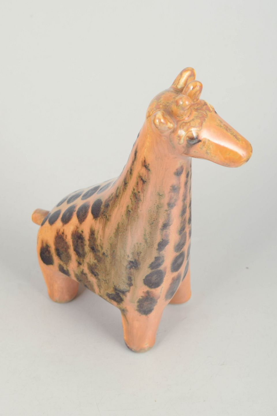 Brita Mellander-Jungermann for Karlskrona, giraffe figure.Decorative ceramic figure shaped as a giraffe with a stylised form and hand-painted dark spots on a warm orange glaze. A characteristic example of Swedish design from the period.