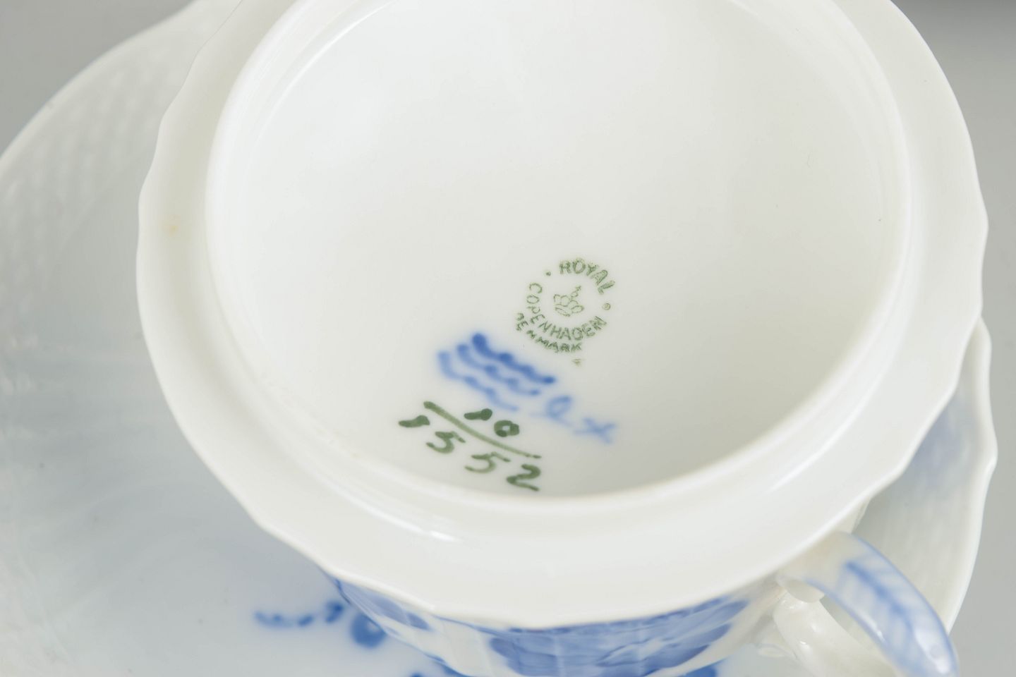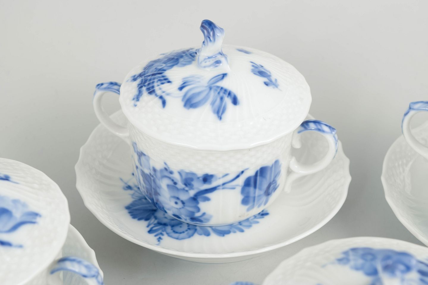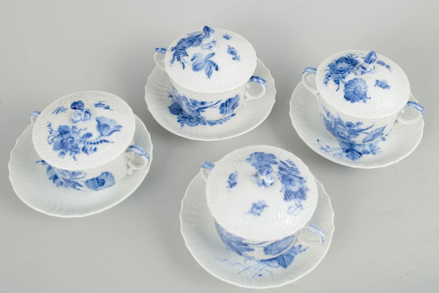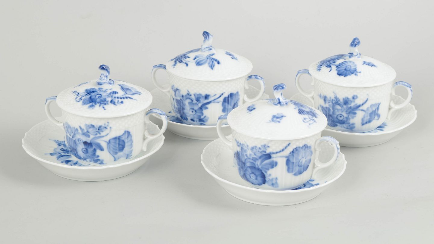 Royal Copenhagen Blue Flower Curved, set of four bouillon cups with matching saucers.Rare set of lidded bouillon cups in porcelain, decorated in the classic hand-painted Blue Flower Curved pattern. Model 10/1552, first factory quality, dated 1962.