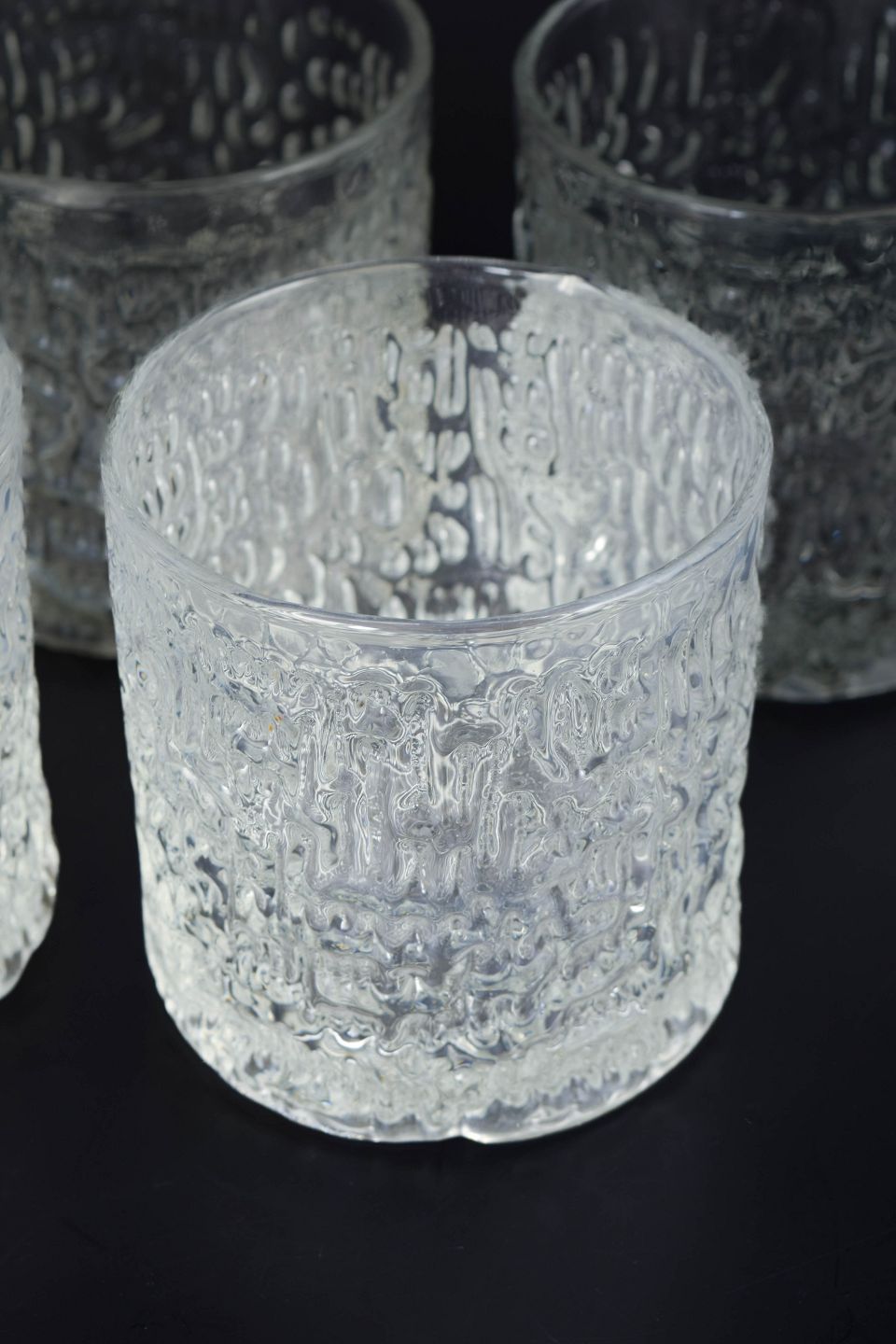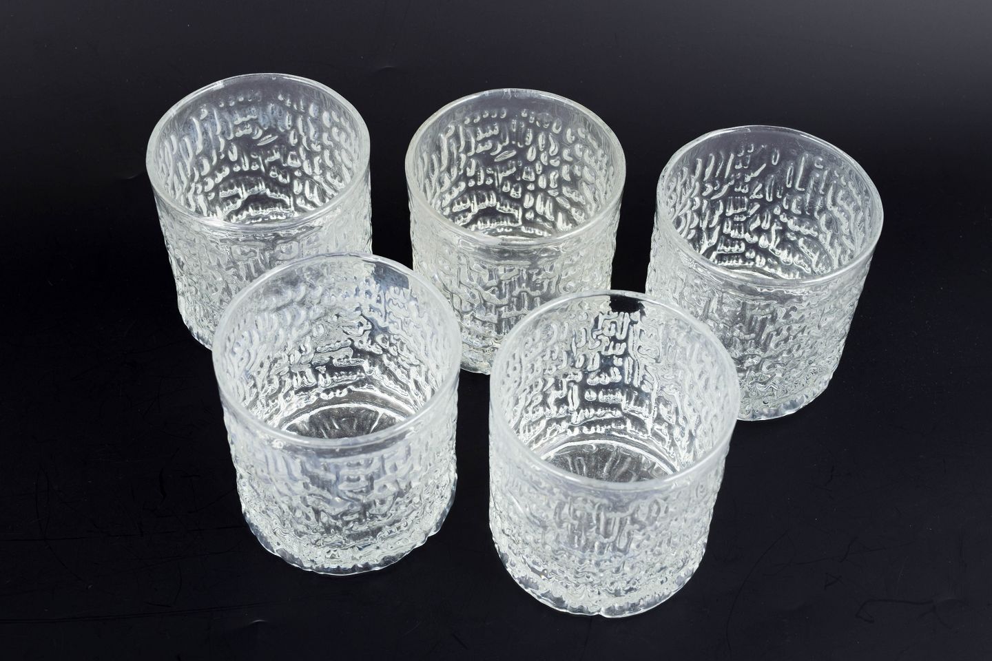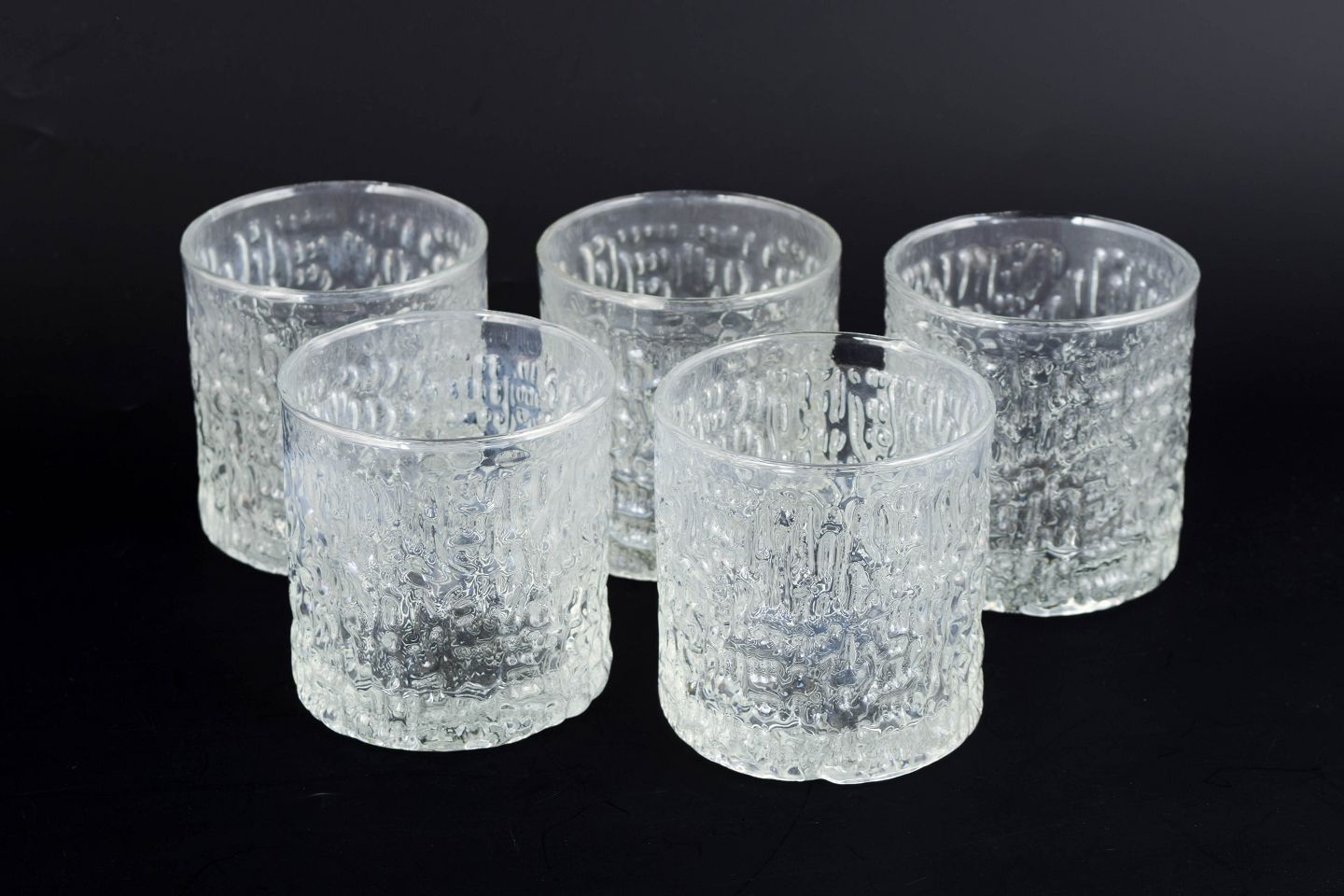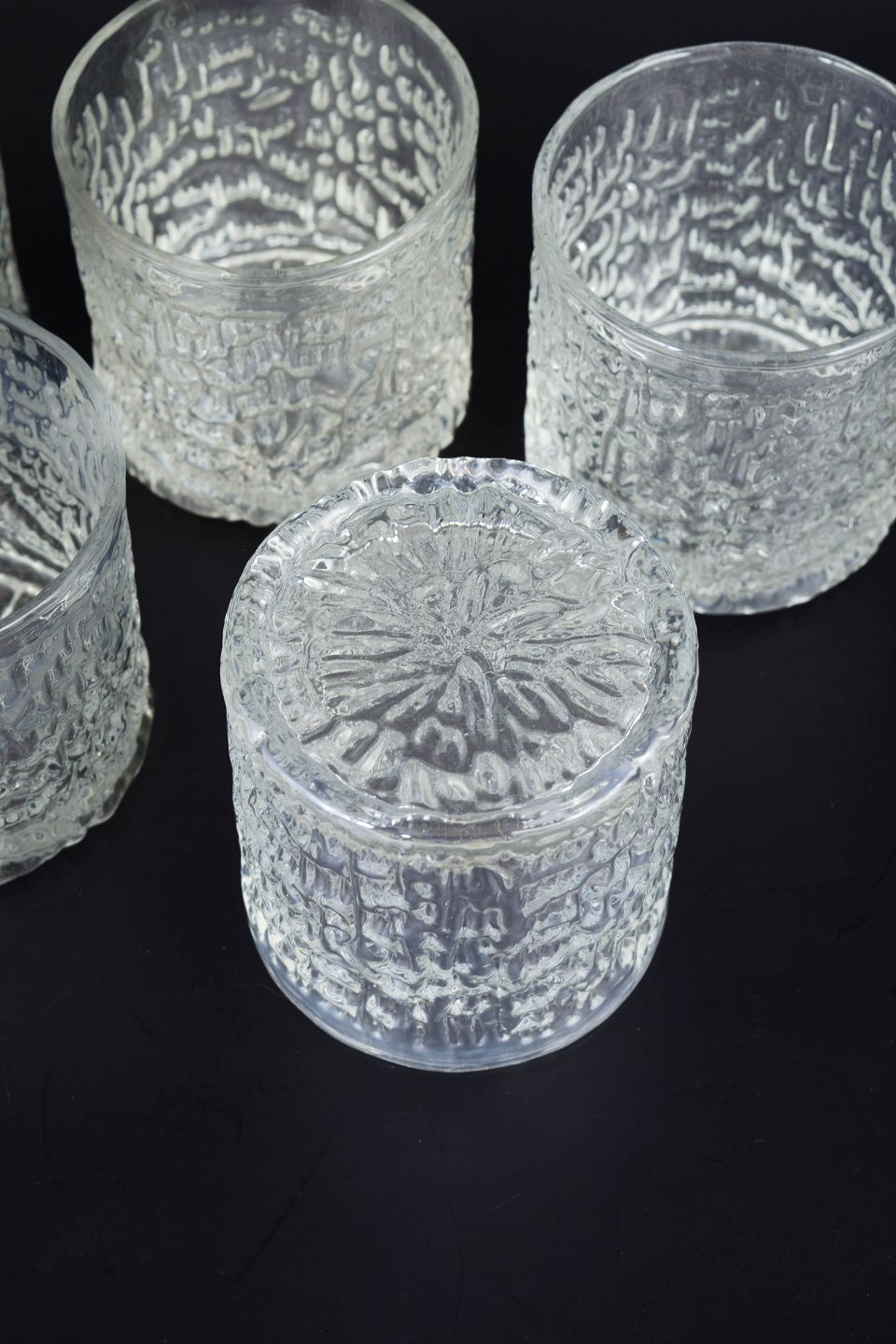 Ravenhead, set of five whisky glasses “Siesta”.Classic whisky glasses in clear pressed glass with decorative texture and solid base, model “Siesta”. Produced in England in the 1980s.