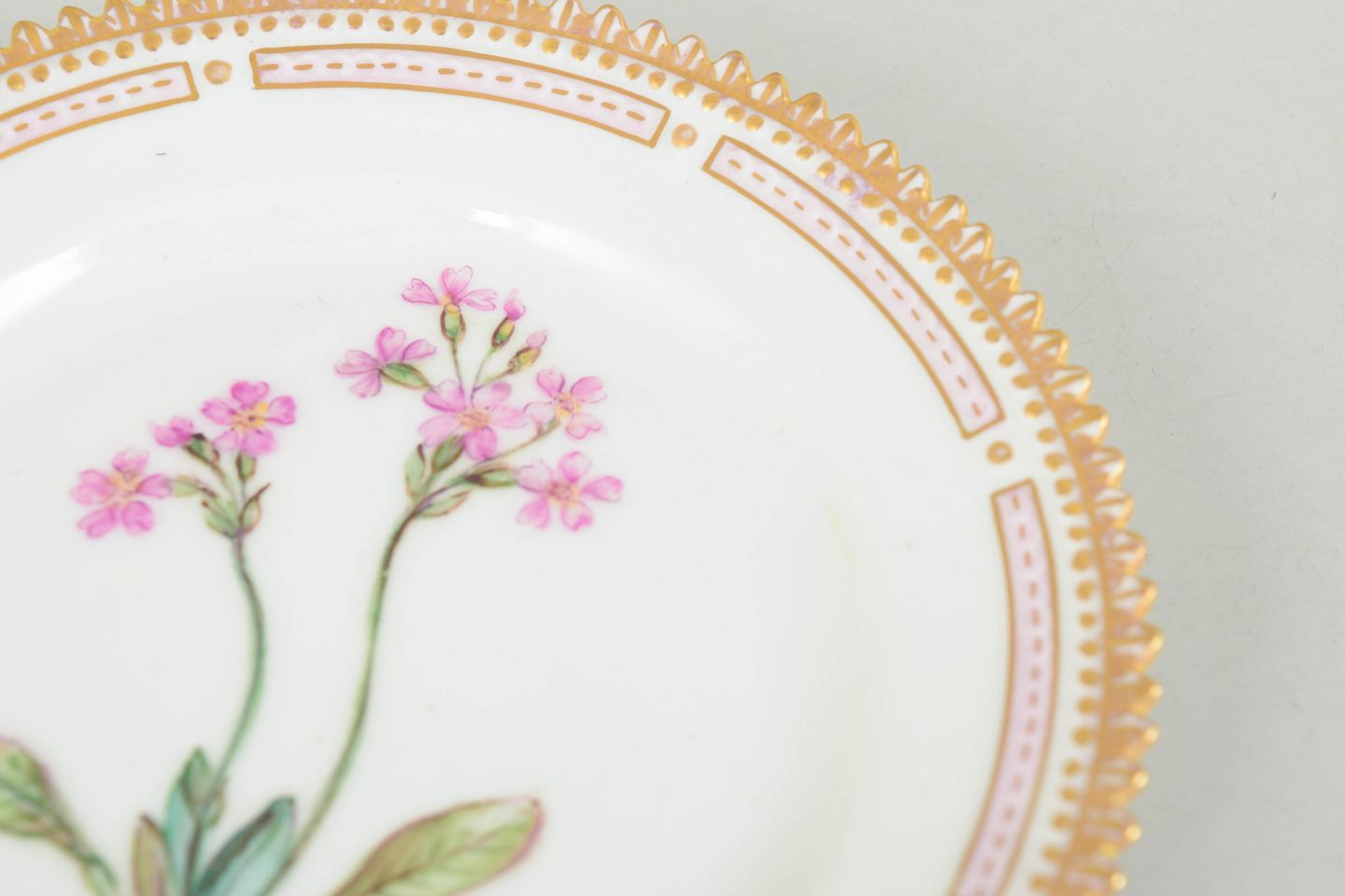 Royal Copenhagen Flora Danica, side plate.Hand-decorated porcelain plate with botanical motif from the Flora Danica series, decorated outside the factory, finely executed with gilded rim and highly detailed plant illustration.