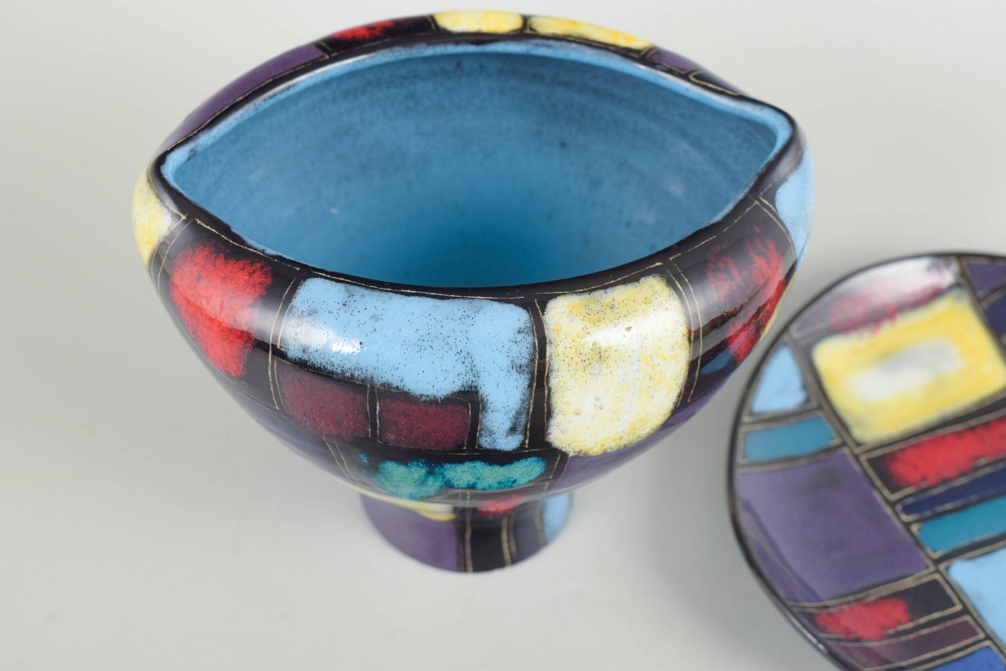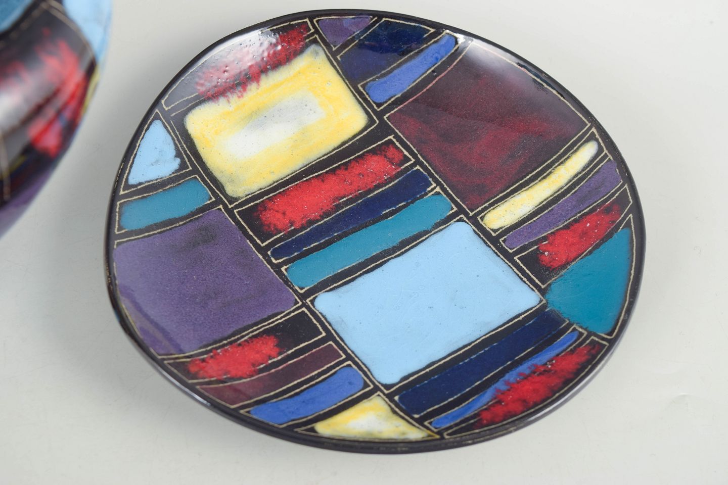 Ludwig Klopfer for Johann Lipp, vase and dish.Decorative ceramic vase with integrated foot and matching dish, featuring a multicoloured glaze with abstract fields in blue, red, yellow, and violet tones. A characteristic example of mid-20th century German art pottery.
