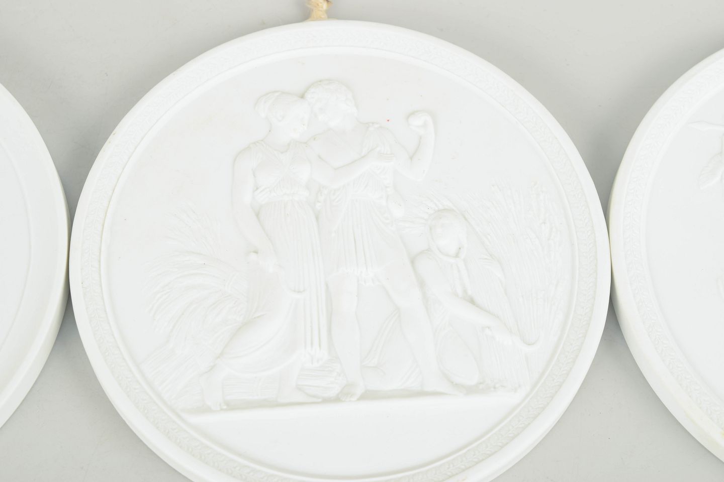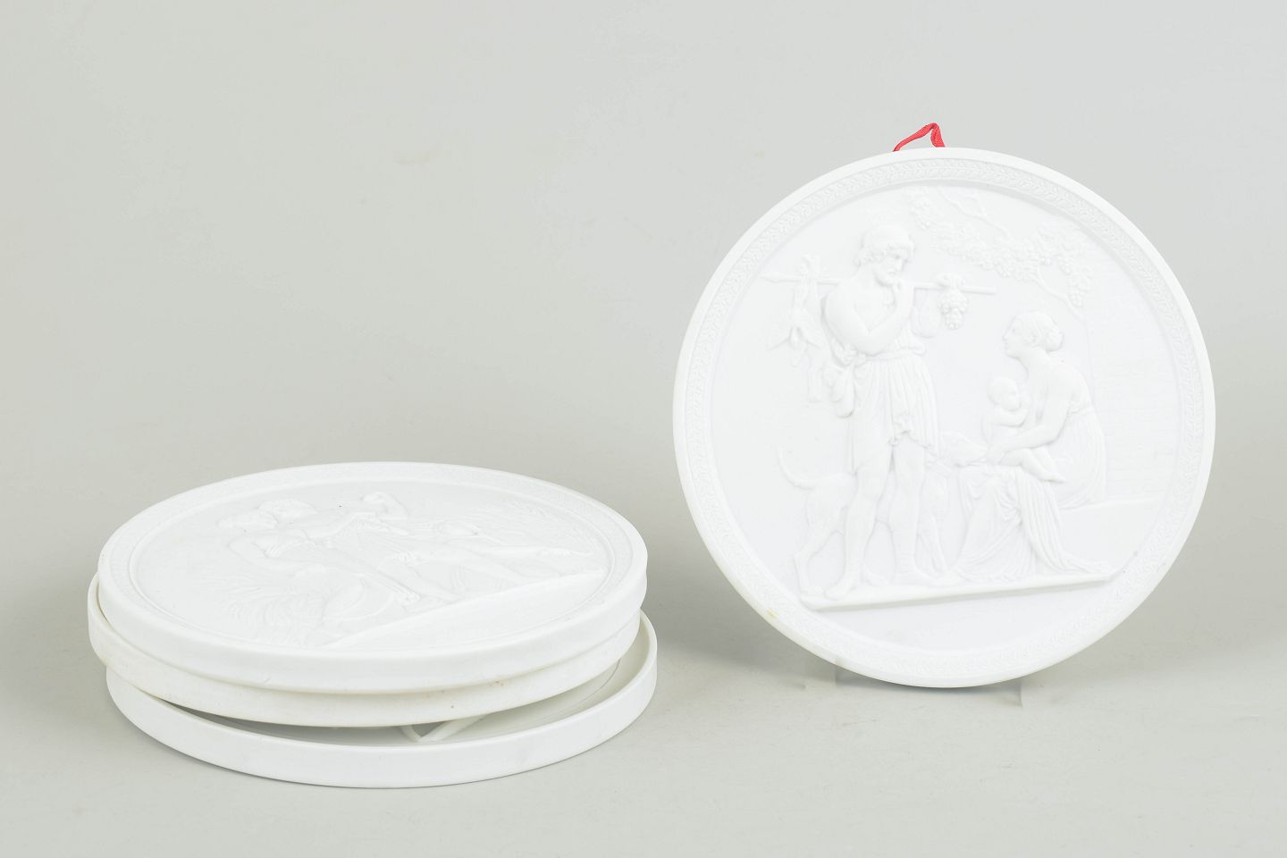 Royal Copenhagen, set of four biscuit wall plaques after Thorvaldsen.White unglazed porcelain reliefs with classical motifs after Bertel Thorvaldsen, executed in fine biscuit with detailed figural decoration and suspension mounts on the reverse. First and third factory quality.