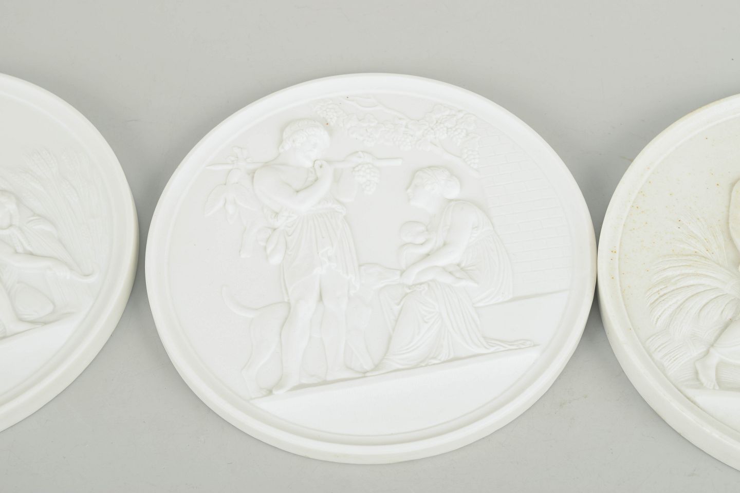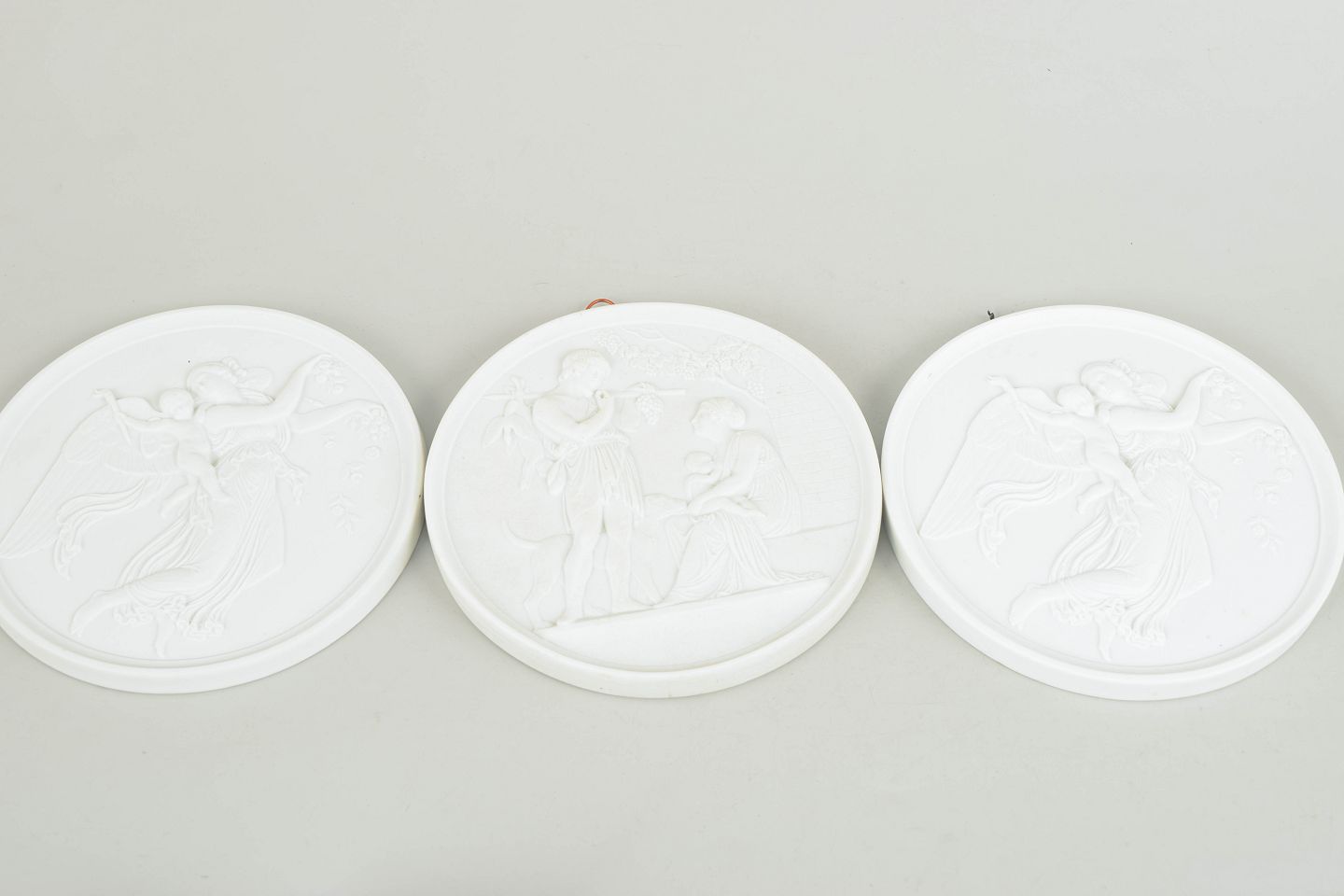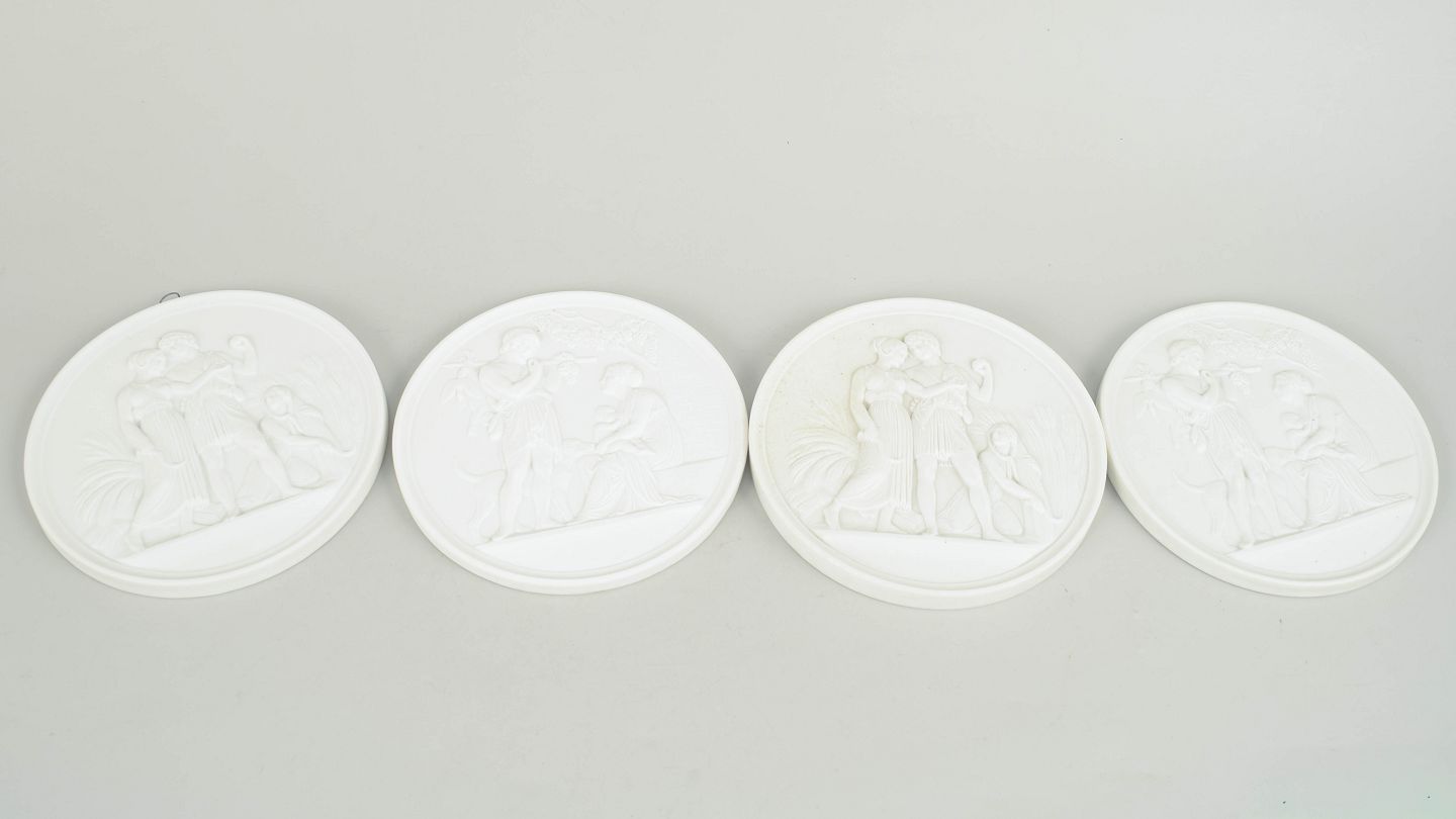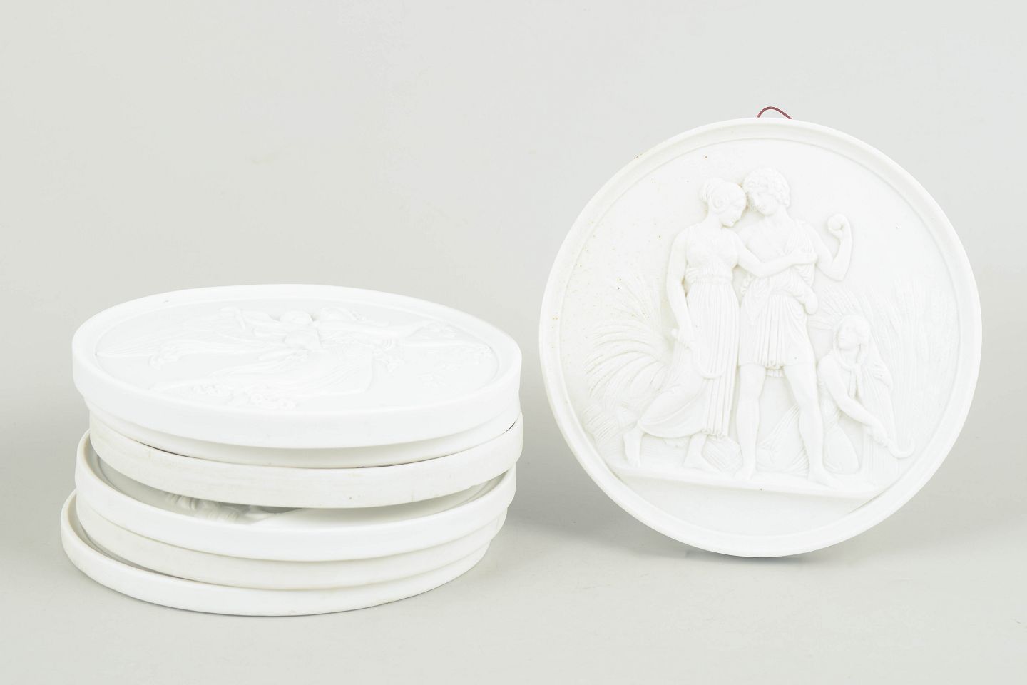 Bing & Grøndahl, set of seven biscuit wall plaques after Thorvaldsen.White unglazed porcelain reliefs with classical motifs after Bertel Thorvaldsen, executed in fine biscuit with detailed figural decoration and suspension mounts on the reverse. First factory quality.