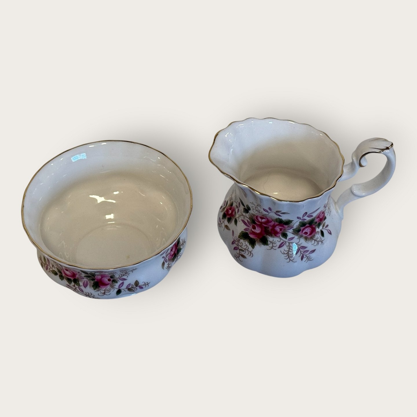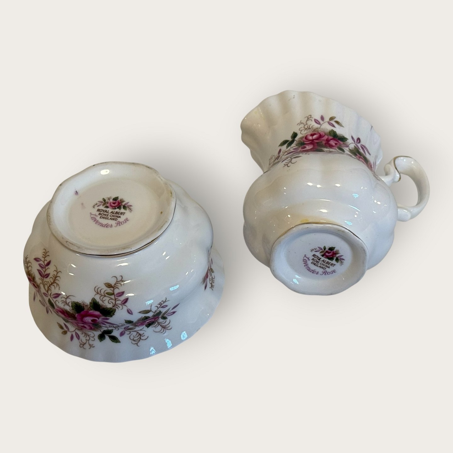 Royal Albert, Bone China, Lavender Rose, Sugar and cream set, sugar bowl height 5.5cm, diameter 9.5cm, creamer approx. hxwxl 9x10x7cm *Perfect condition*Stock: 1