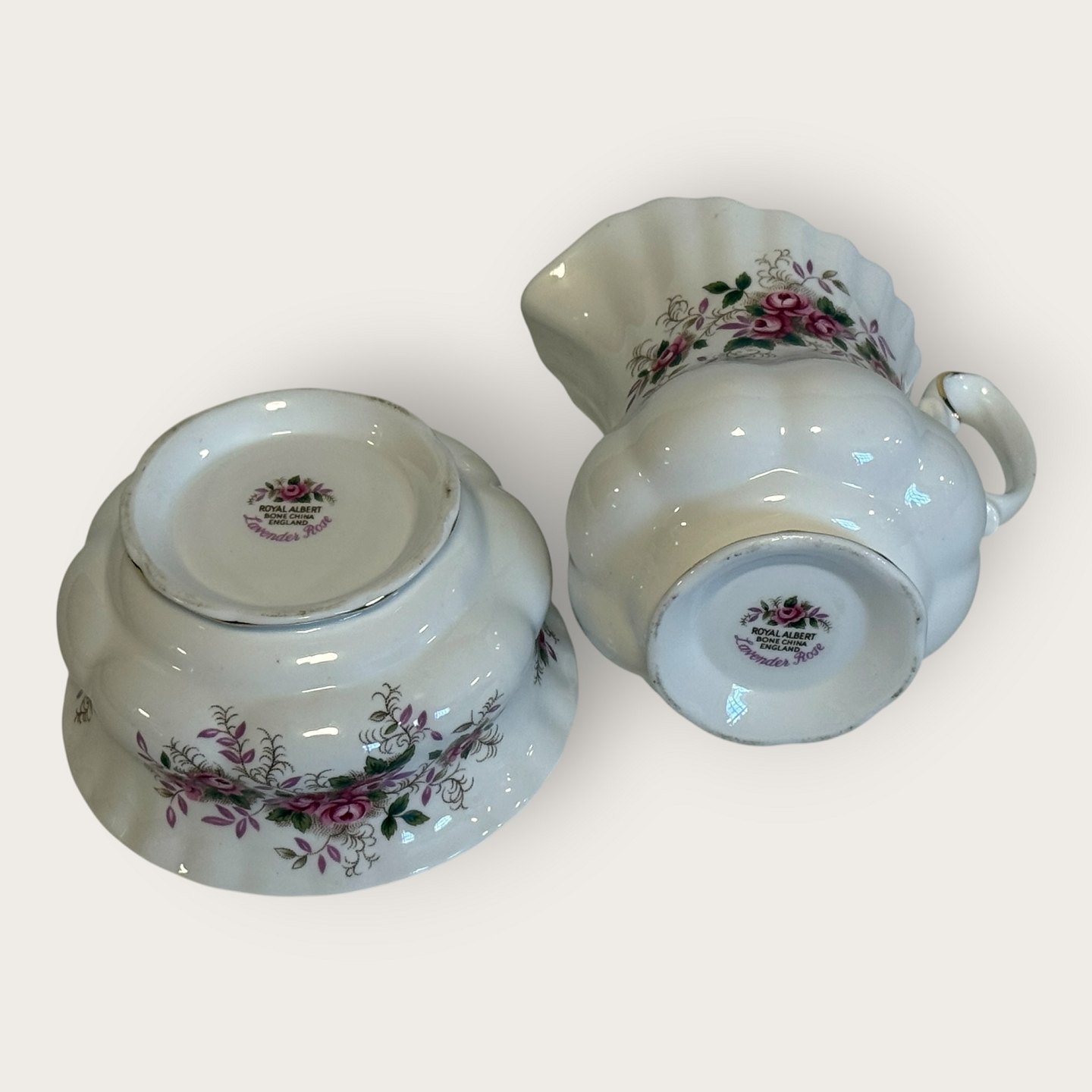 Royal Albert, Bone China, Lavender Rose, Large Sugar and Cream Set, sugar bowl height 6cm, diameter 11cm, creamer approx. hxwxl 10.5x12x8.5cm *Perfect condition*Stock: 1