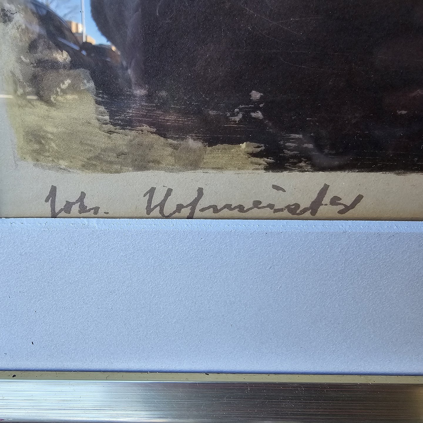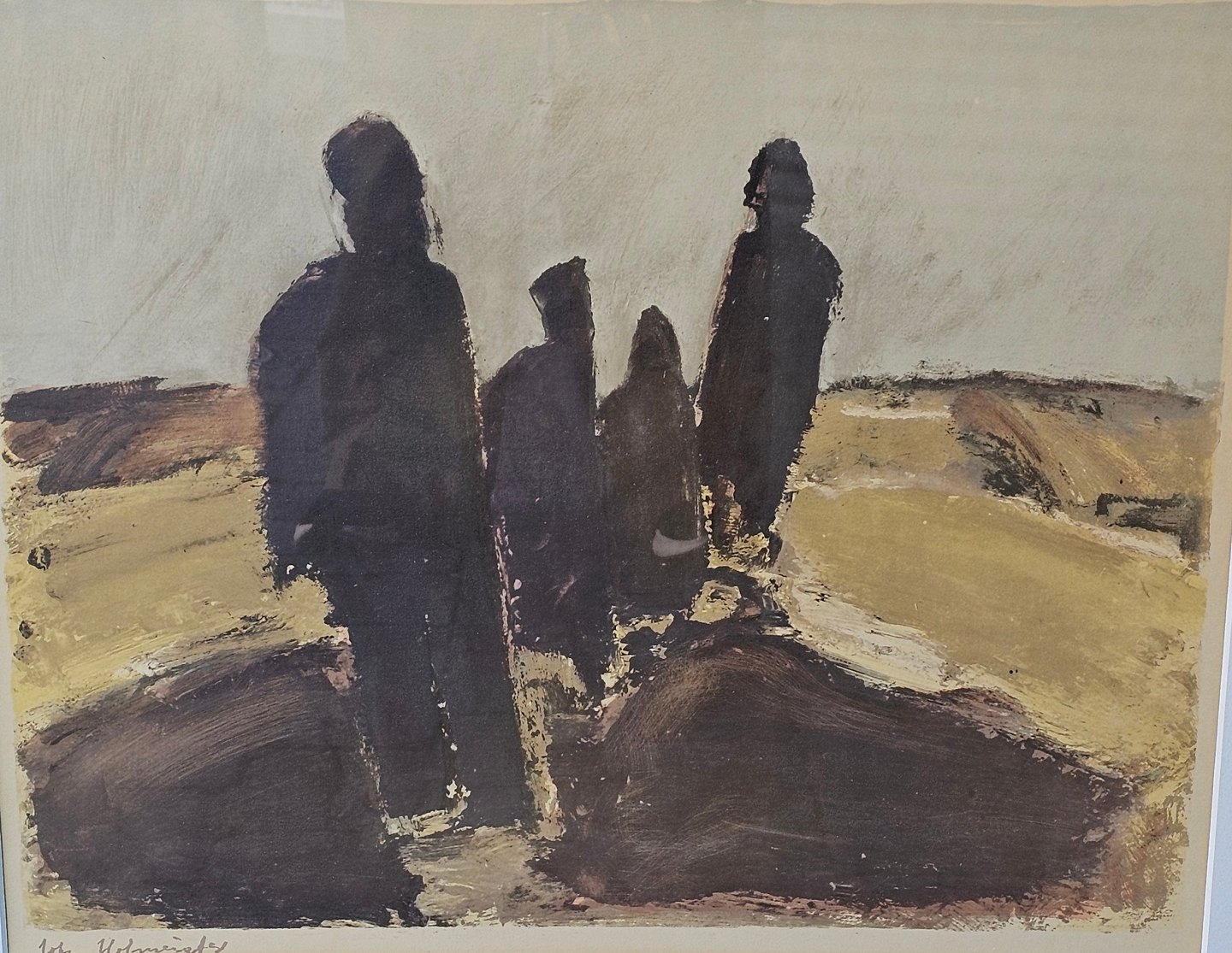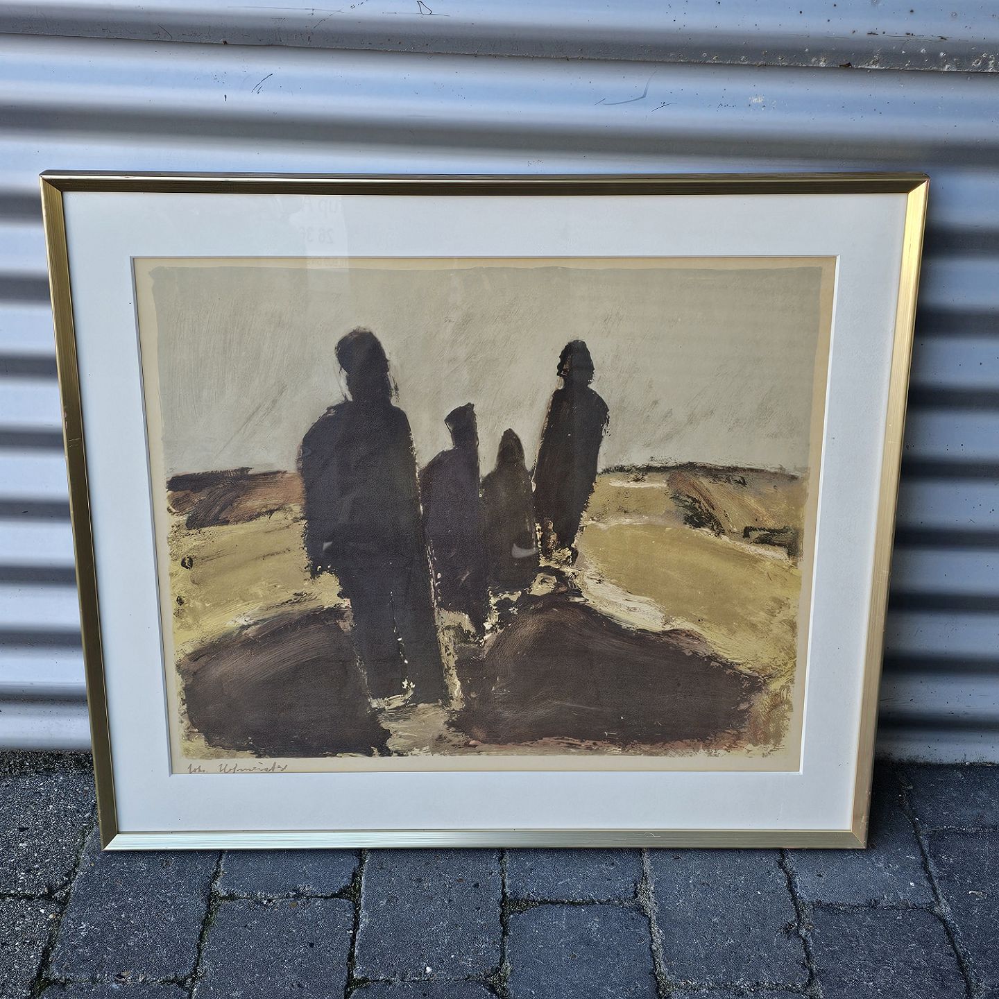 Litografi med motiv af mennesker på en hede monteret i guldmalet trærammeKunstner Johannes Hofmeister (1914-1990), signeret