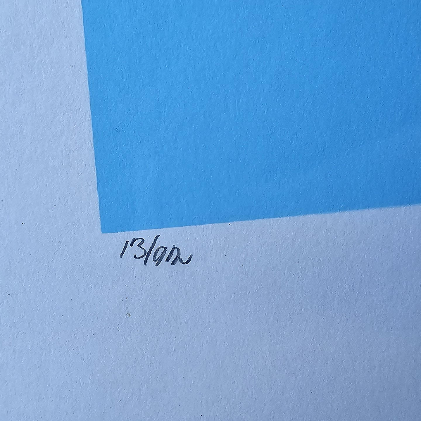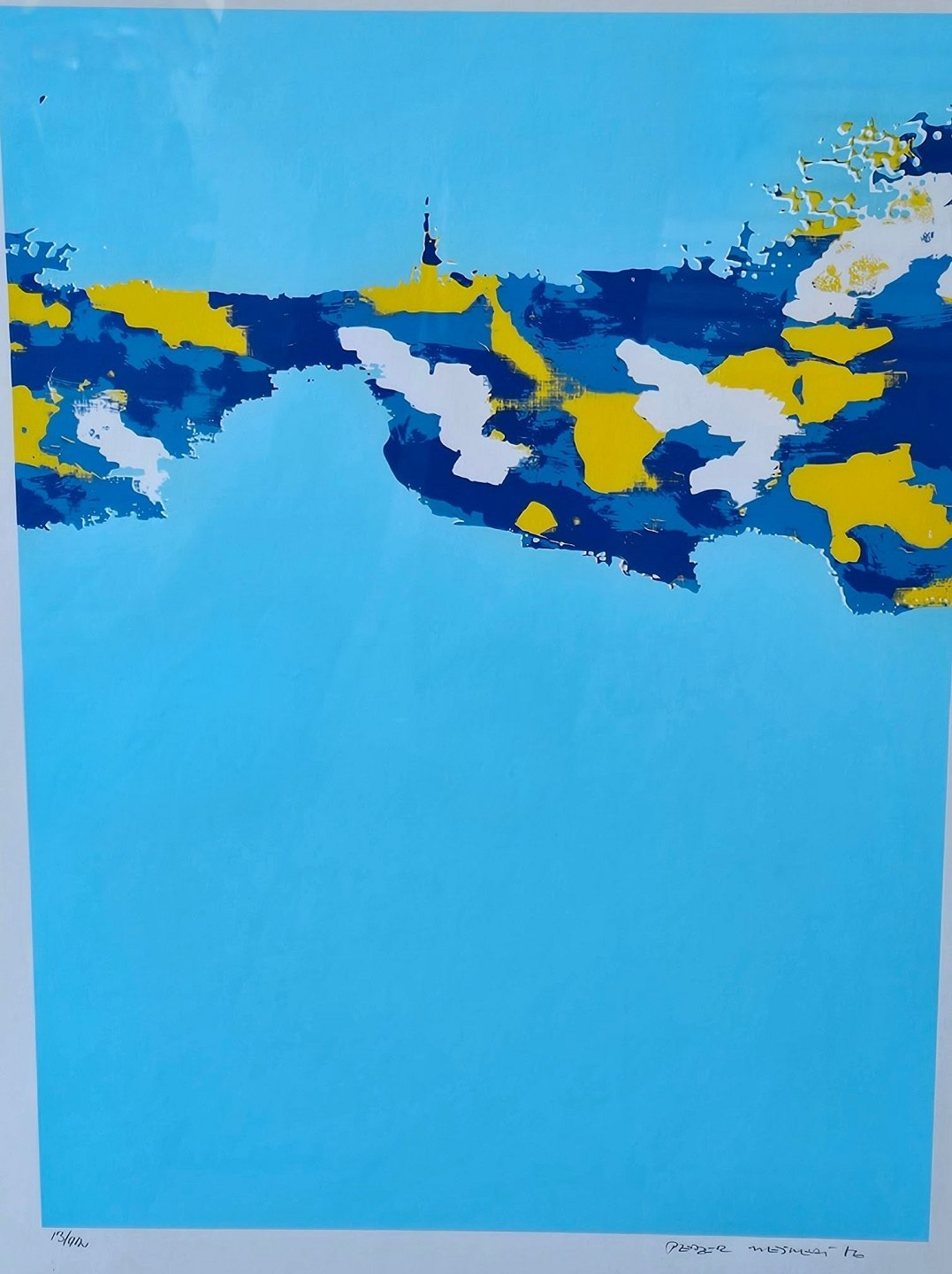 Litografi med abstrakt motiv af Kalvehave og Møensklint i blå, gul og hvid på lyseblå baggrund i metal ramme. 13/45Signeret Peder Meinert 85