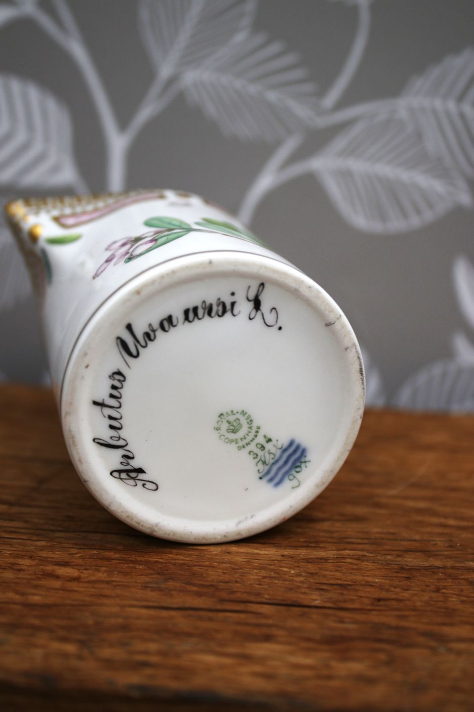 Creamer in Flora Danica set produced by Royal Copenhagen in Denmark. H: 7cm. Dia: 5.5cm. The motif is a hand-painted botanical illustration of the plant Arbutus Uva-ursi. (Mispelris)It is one of the world's most prestigious porcelain series.