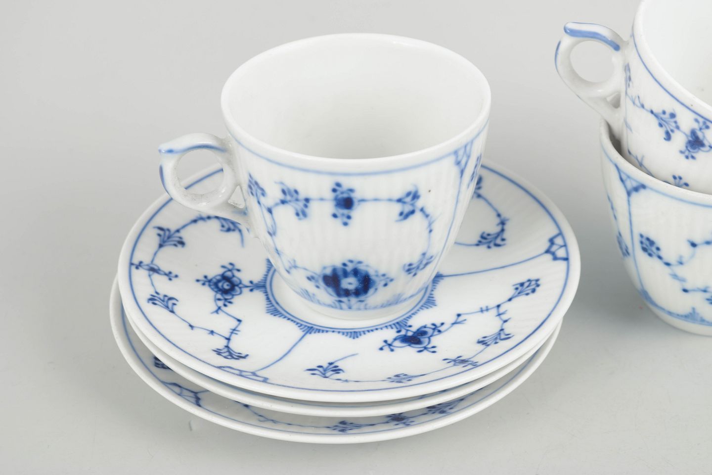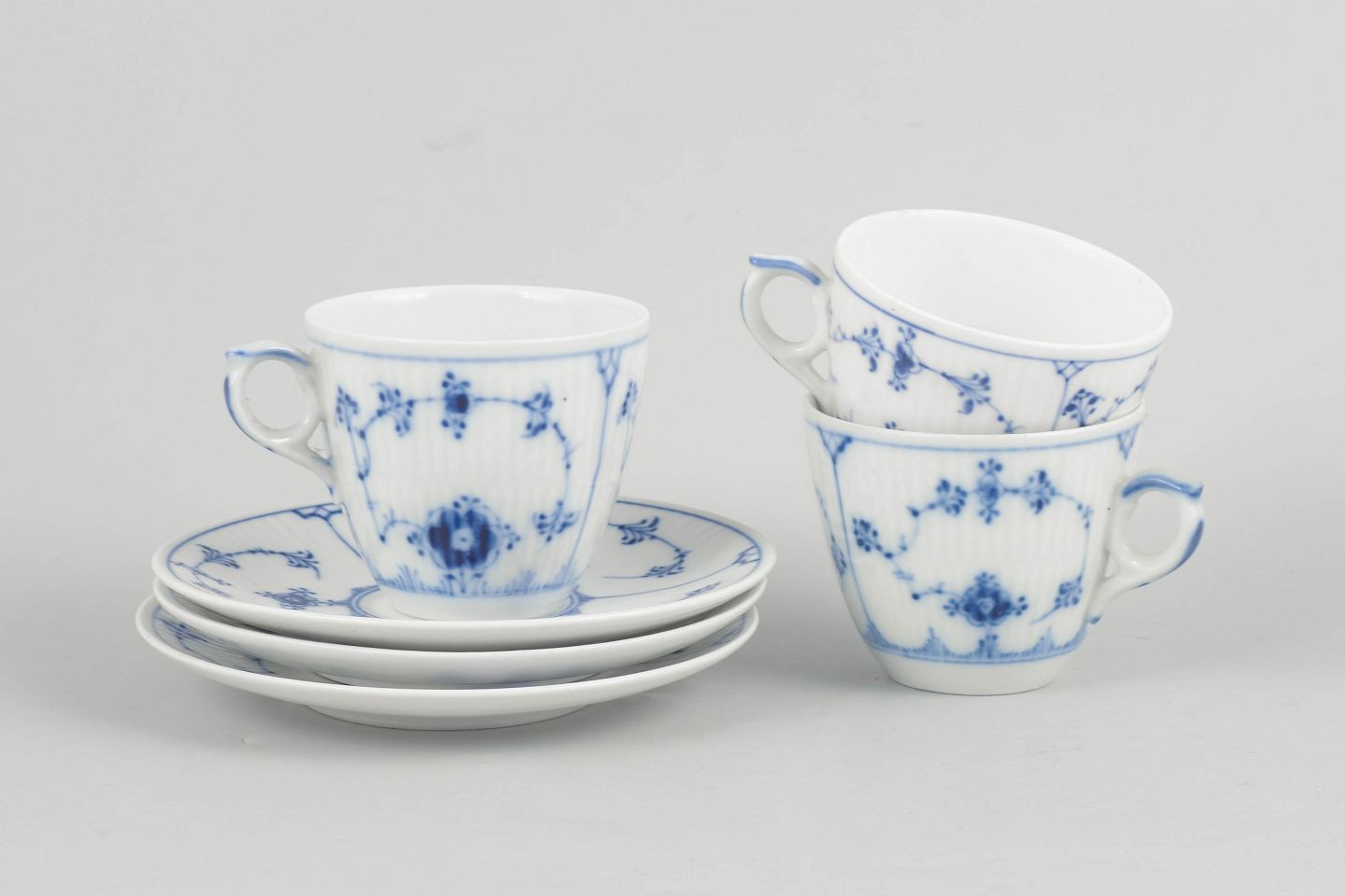 Royal Copenhagen Blue Fluted Plain, set of three coffee cups with saucers.Three coffee cups with matching saucers in porcelain, hand-painted in underglaze blue in the classic Blue Fluted Plain pattern. Model 1/80. Some first factory quality, some factory seconds marked with one or two incised lines.