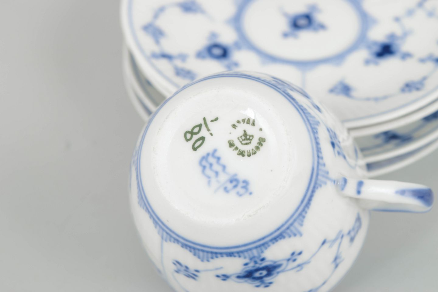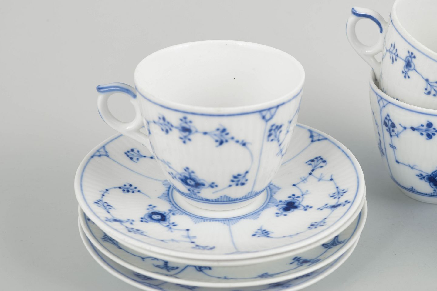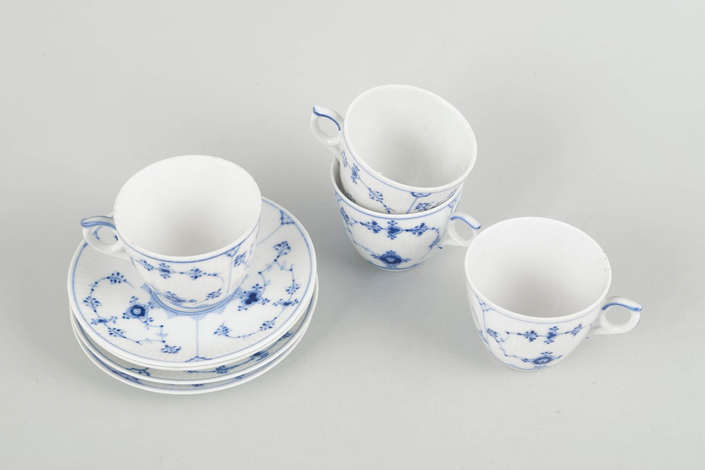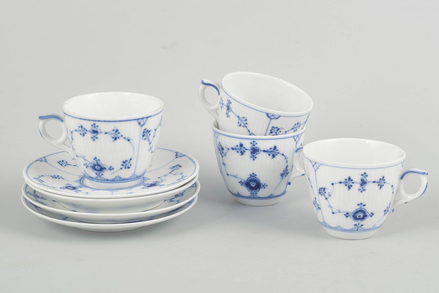 Royal Copenhagen Blue Fluted Plain, set of four coffee cups with saucers.Four coffee cups with matching saucers in porcelain, hand-painted in underglaze blue in the classic Blue Fluted Plain pattern. Model 1/80. Some first factory quality, some factory seconds marked with one or two incised lines.