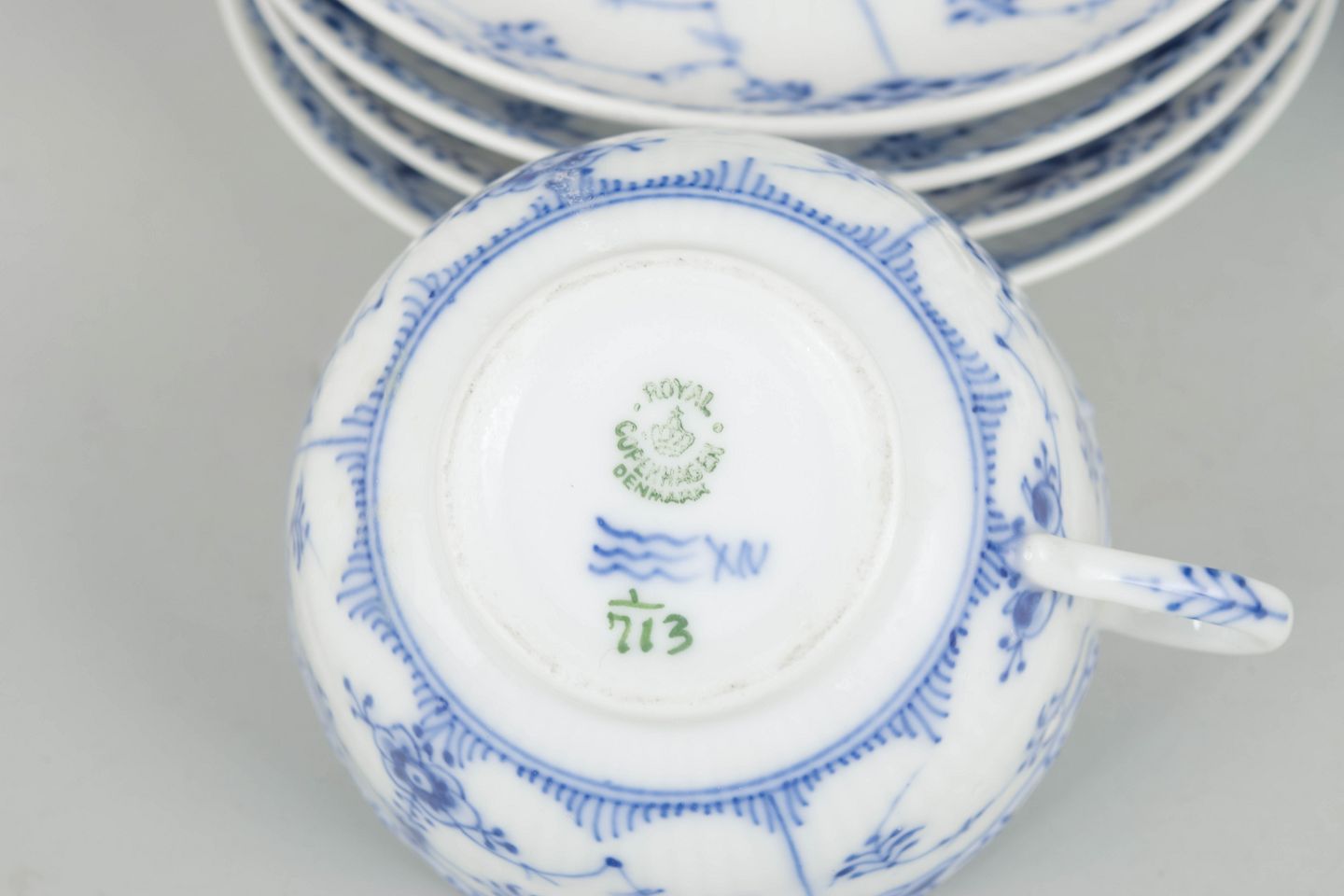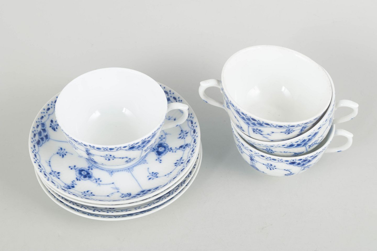 Royal Copenhagen Blue Fluted Half Lace coffee cups with saucers, set of four.Coffee cups with matching saucers in porcelain, hand-painted in underglaze blue in the classic Blue Fluted Half Lace pattern. Model 1/713. First factory quality.