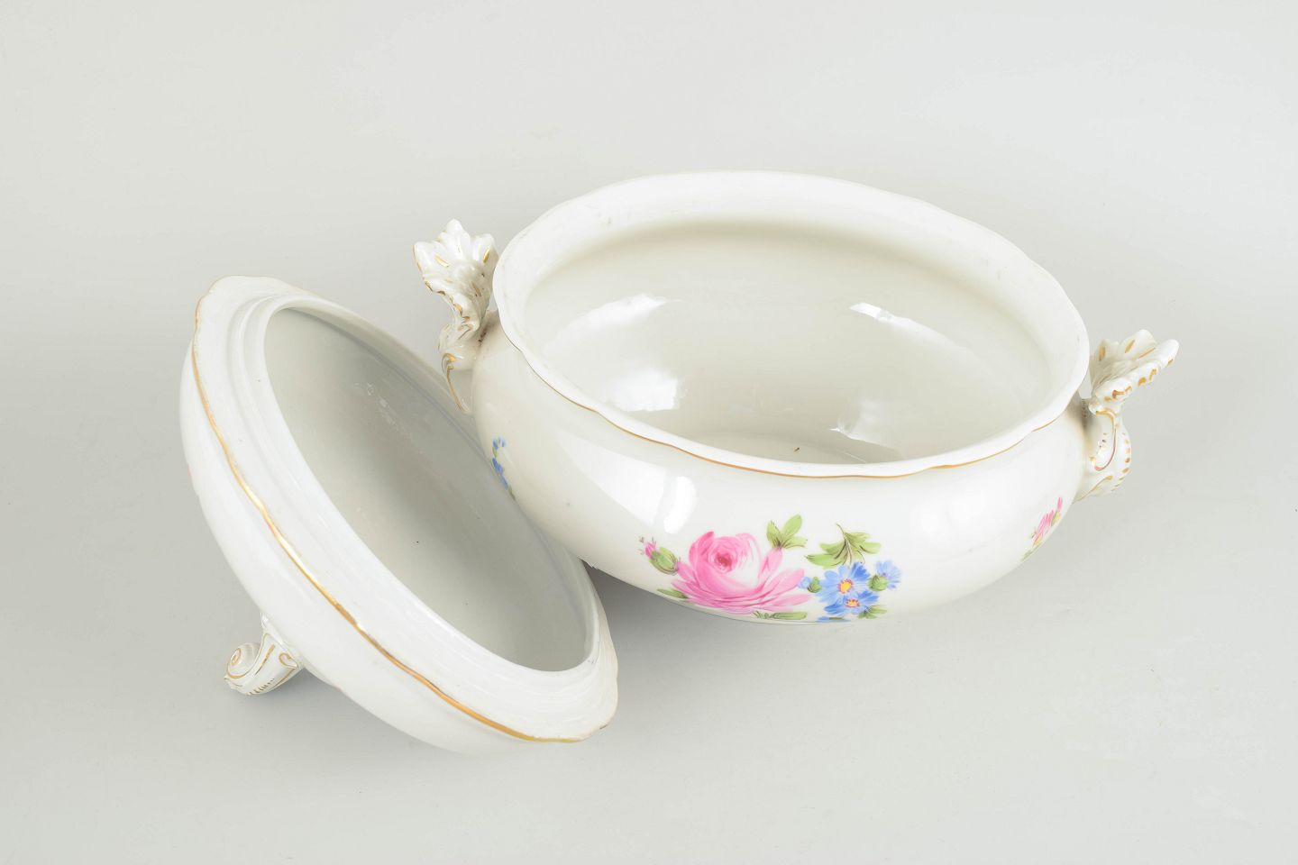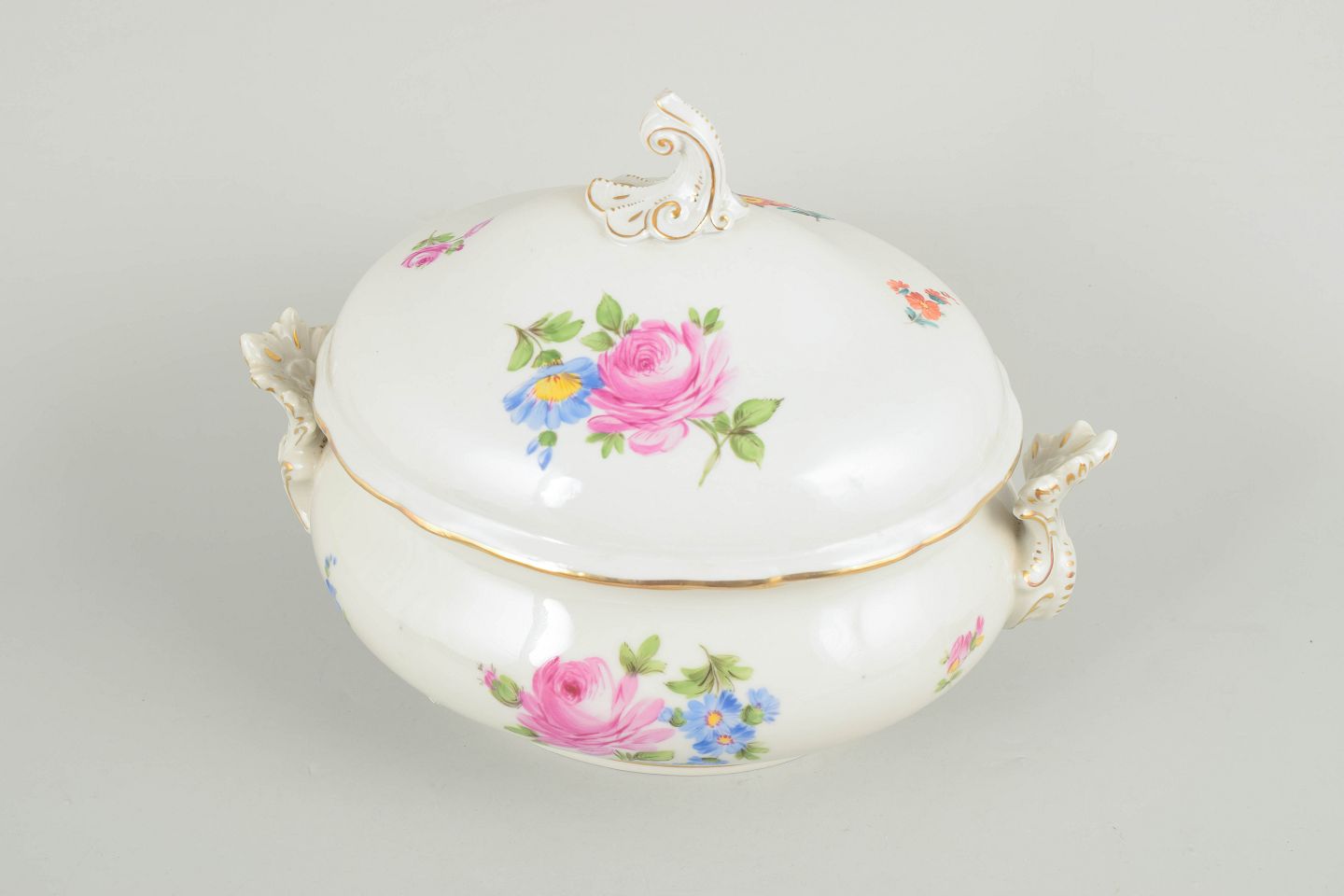 Meissen large lidded tureen, Saxon flower.Large hand-painted porcelain tureen with polychrome floral decoration and gilt detailing, executed in the classic Saxon flower pattern. Unmarked.