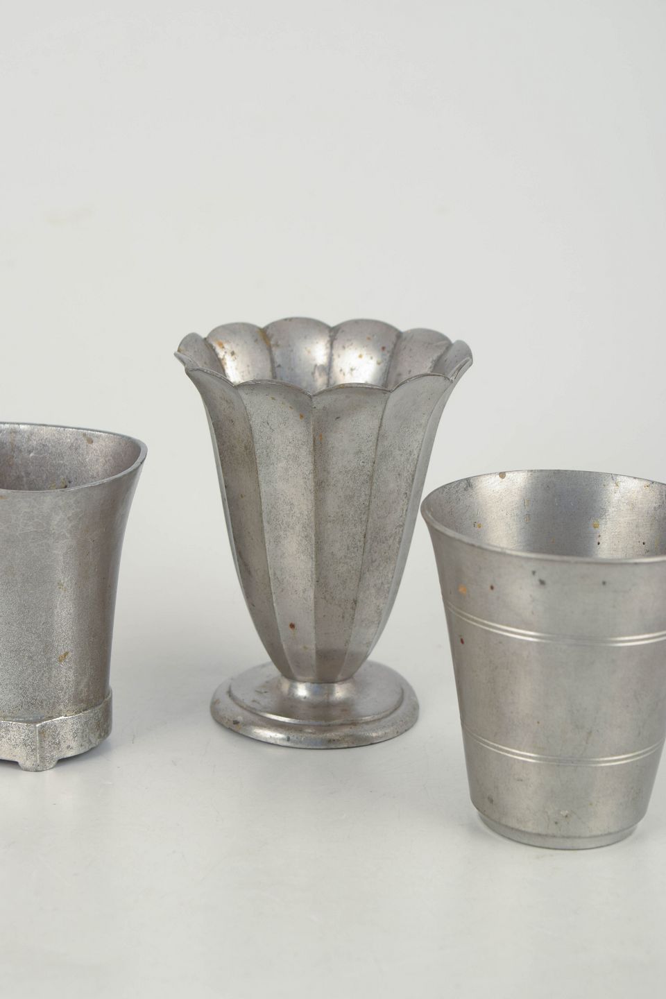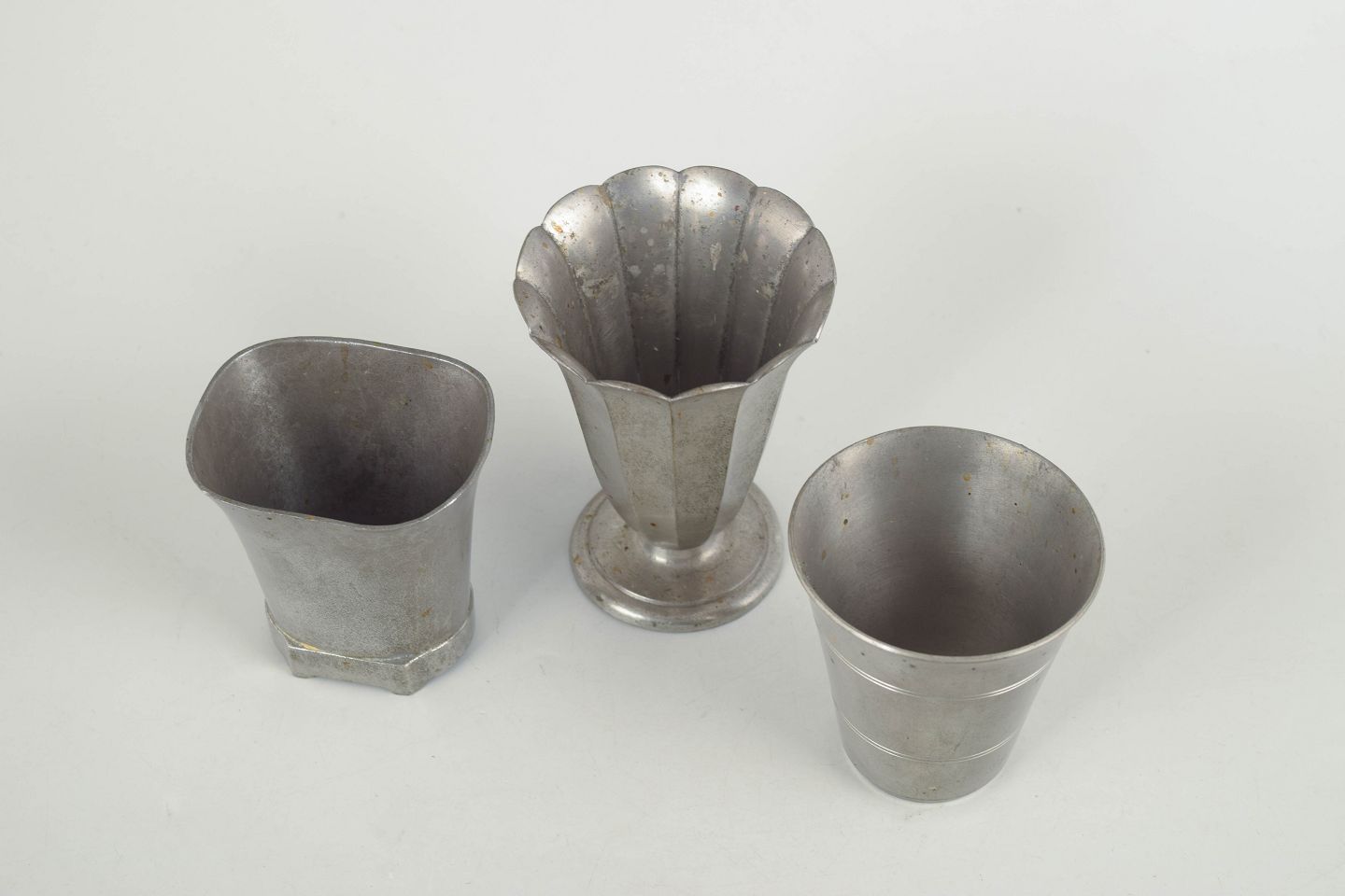 Three small vases in pewter, executed in varied and elegant art deco designs. Models 2549, 1313 and 1123.