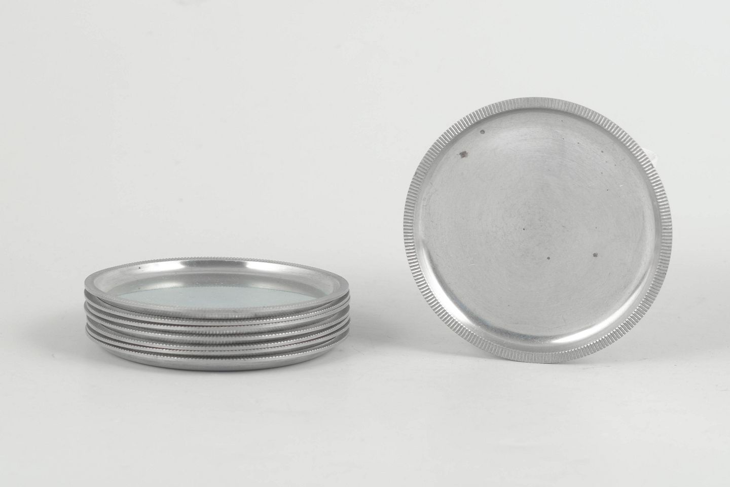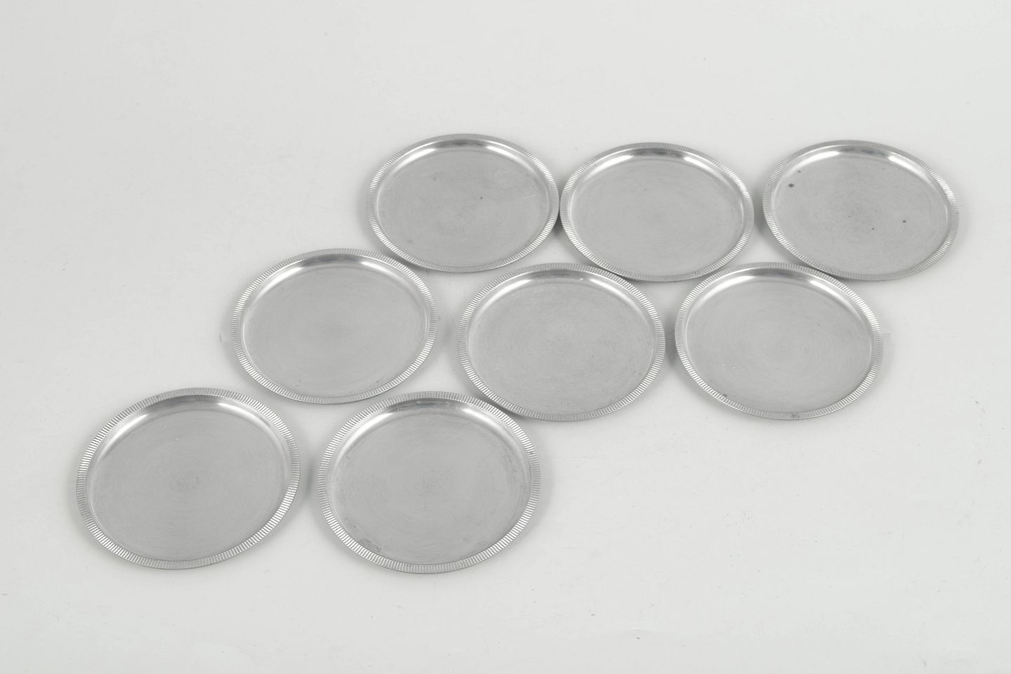 Just Andersen, set of eight coasters in pewter.Set of eight coasters in pewter with a fluted rim and a simple art deco design. Model 2634.