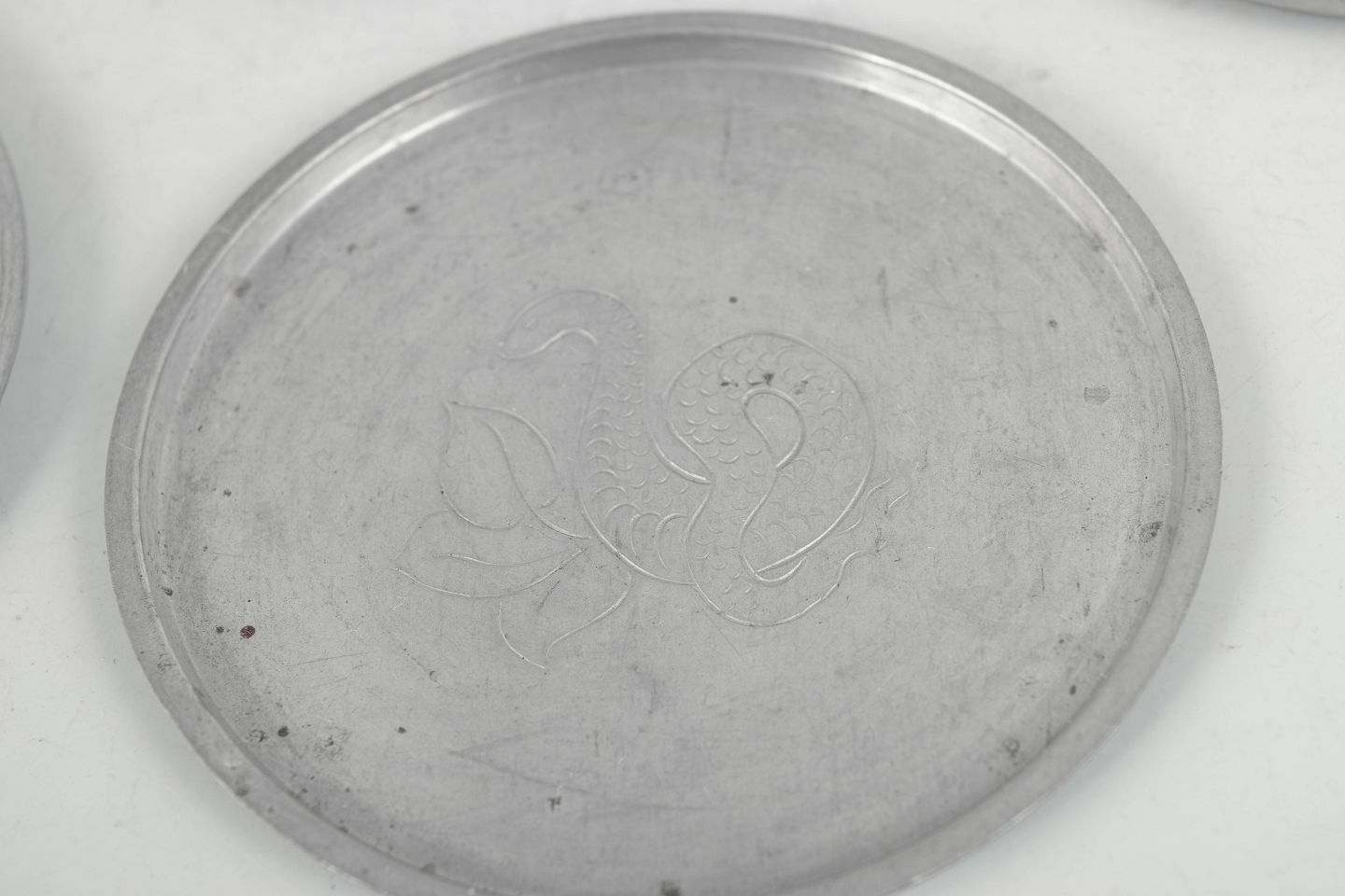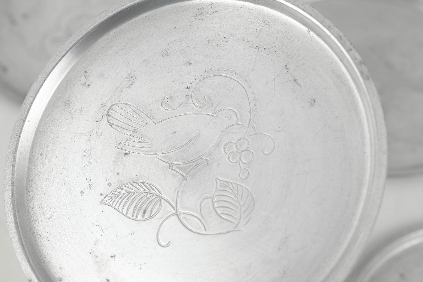 Just Andersen, set of five coasters in pewter.Set of five coasters in pewter with engraved animal motifs in a stylised art deco design. Model 1176.