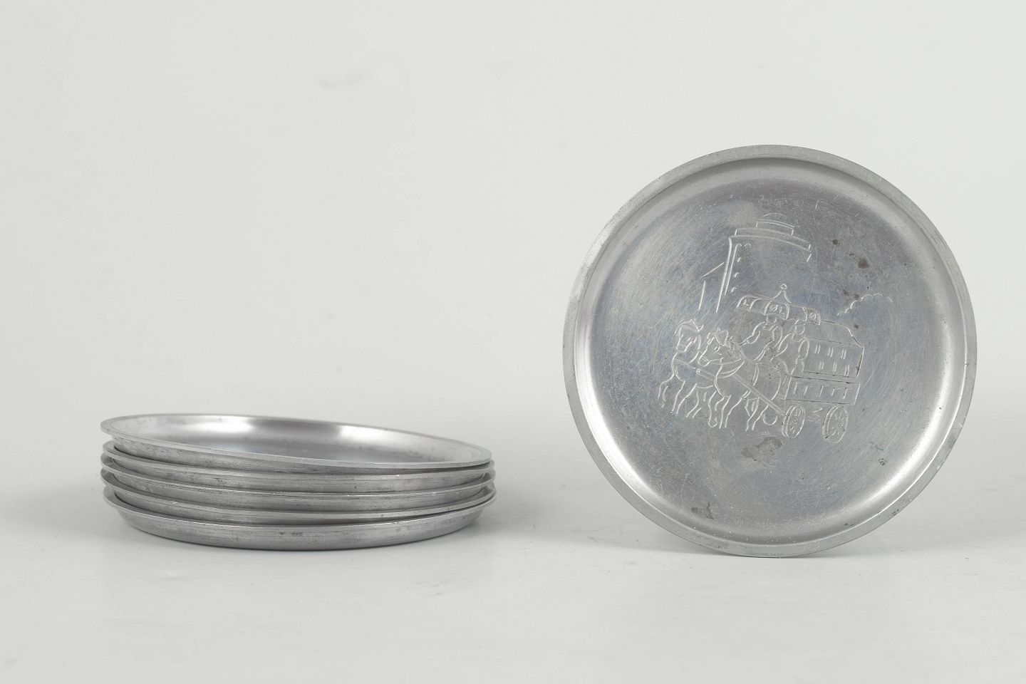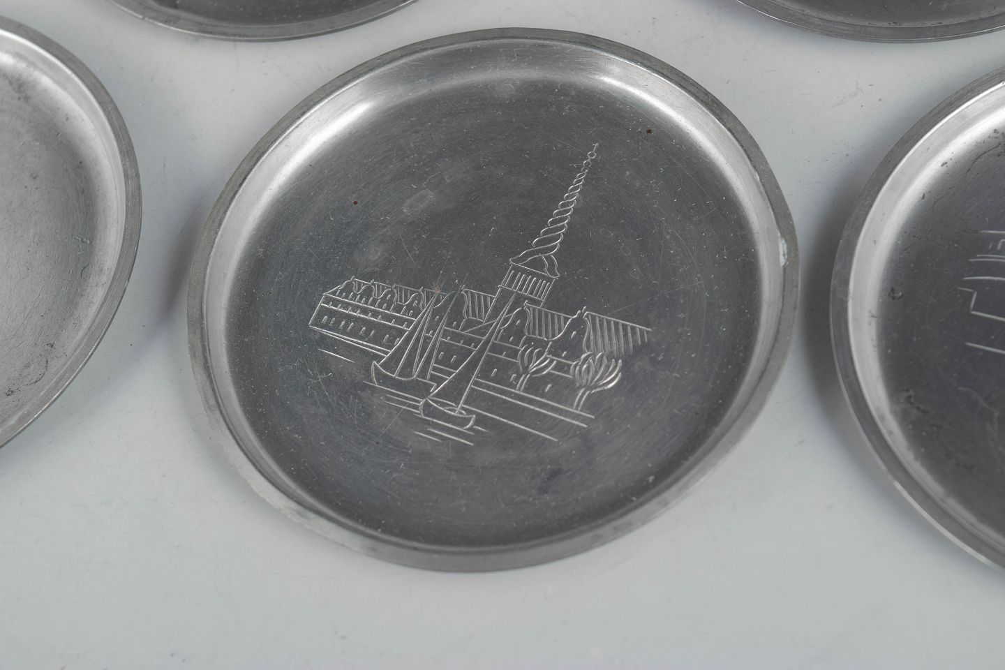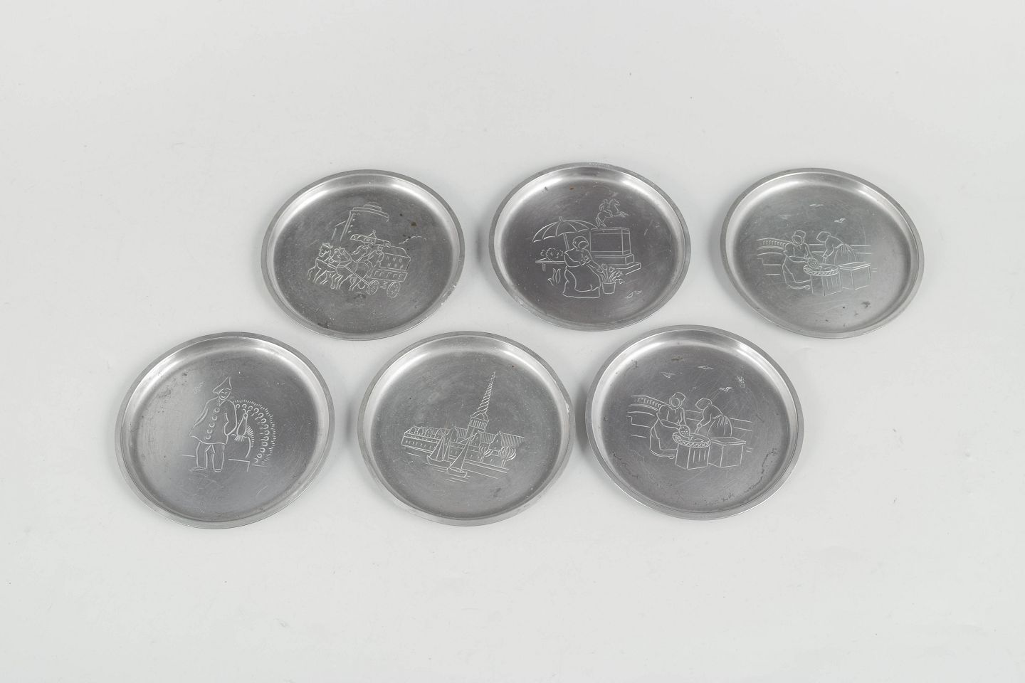 Just Andersen, set of six coasters in pewter with Copenhagen motifs.Set of six coasters in pewter with engraved Copenhagen motifs in a decorative art deco design. Model 2387.