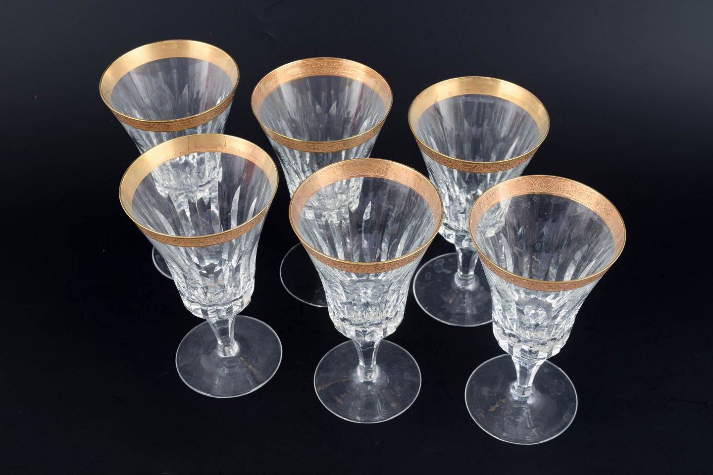 Artemisia, set of five red wine glasses.Elegant red wine glasses in cut crystal with 24 carat gold decoration along the rim, executed in a classic mid 20th century style.