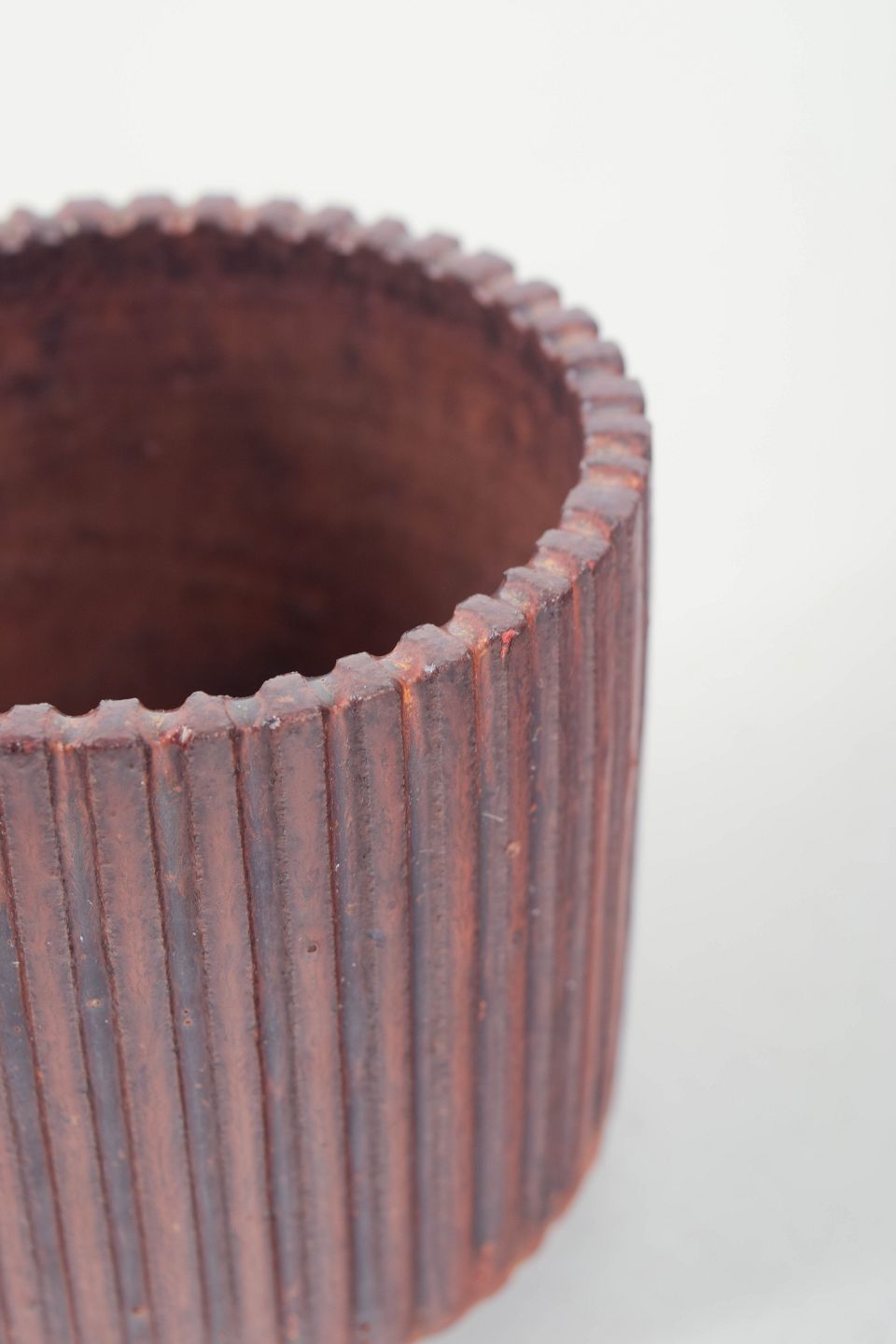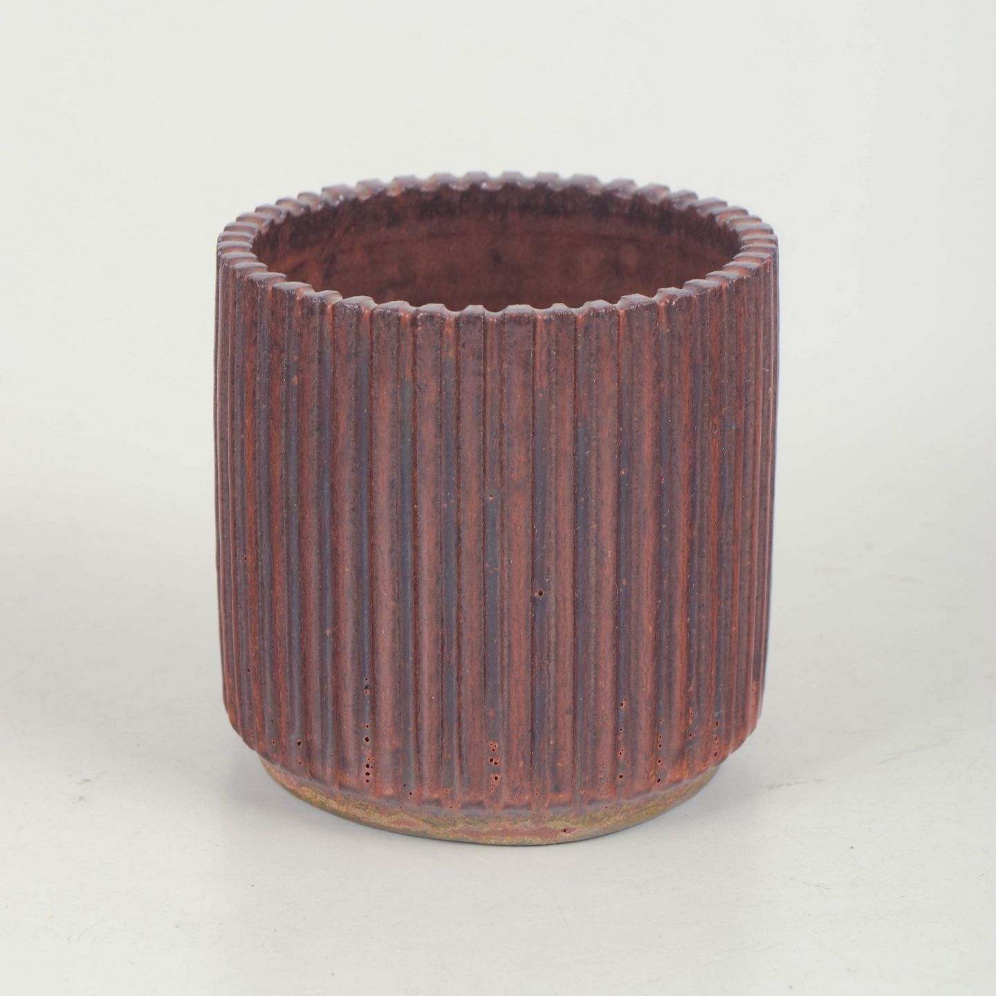 Arne Bang, art deco vase.Cylindrical stoneware vase with vertical fluting and a deep brown-purple glaze with warm tonal variations.