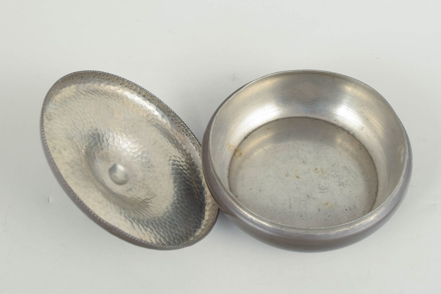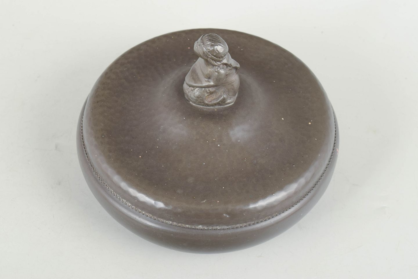 Chr. R. Kunst tin, lidded bowl with figural finial.Art deco pewter lidded bowl with a rounded, soft form and lid topped with a decorative figural finial.