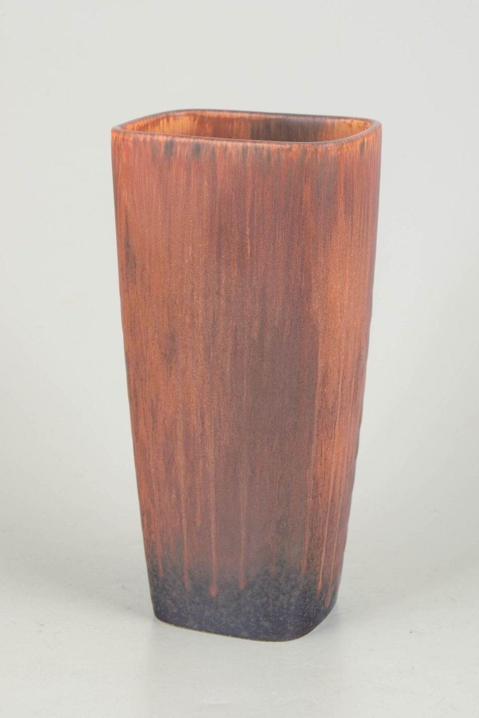Carl-Harry Stålhane for Rörstrand, large vase.Large angular stoneware vase with a distinctive rectangular form and softly rounded corners. Decorated with flowing glaze in warm brown and copper tones, deepening into darker hues toward the base. A bold and decorative example of Stålhane’s work in larger formats.