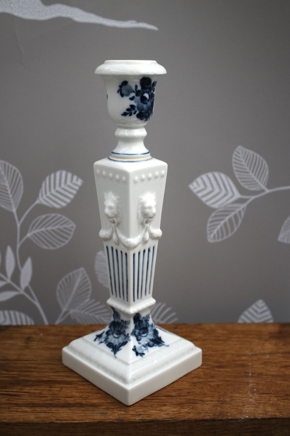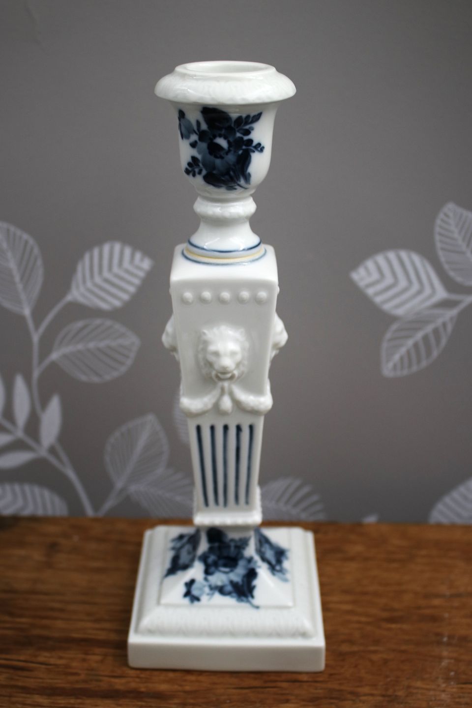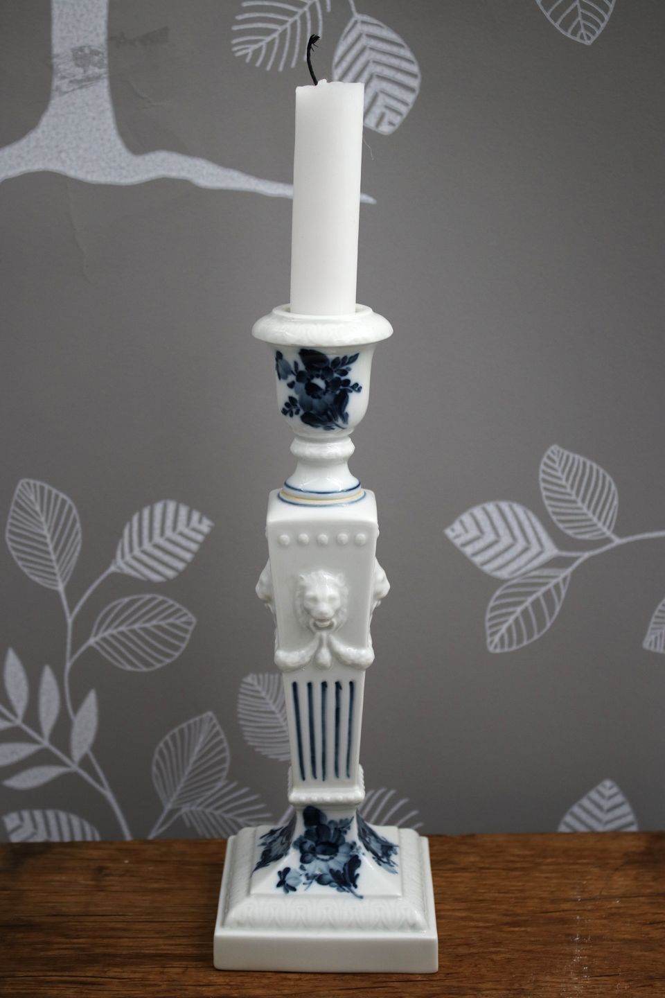 Lion candlestick in Blue Flower from Royal Copenhagen, with lion heads on the side. H: 22.5cm. Decoration number: 45/15. 1.sorting.Is in fine condition.