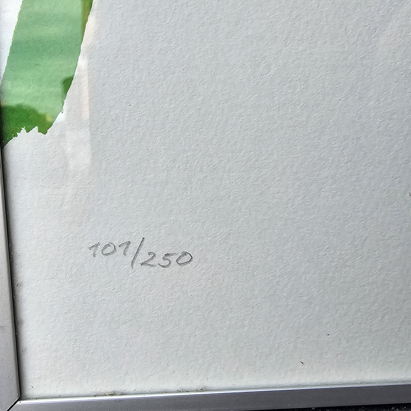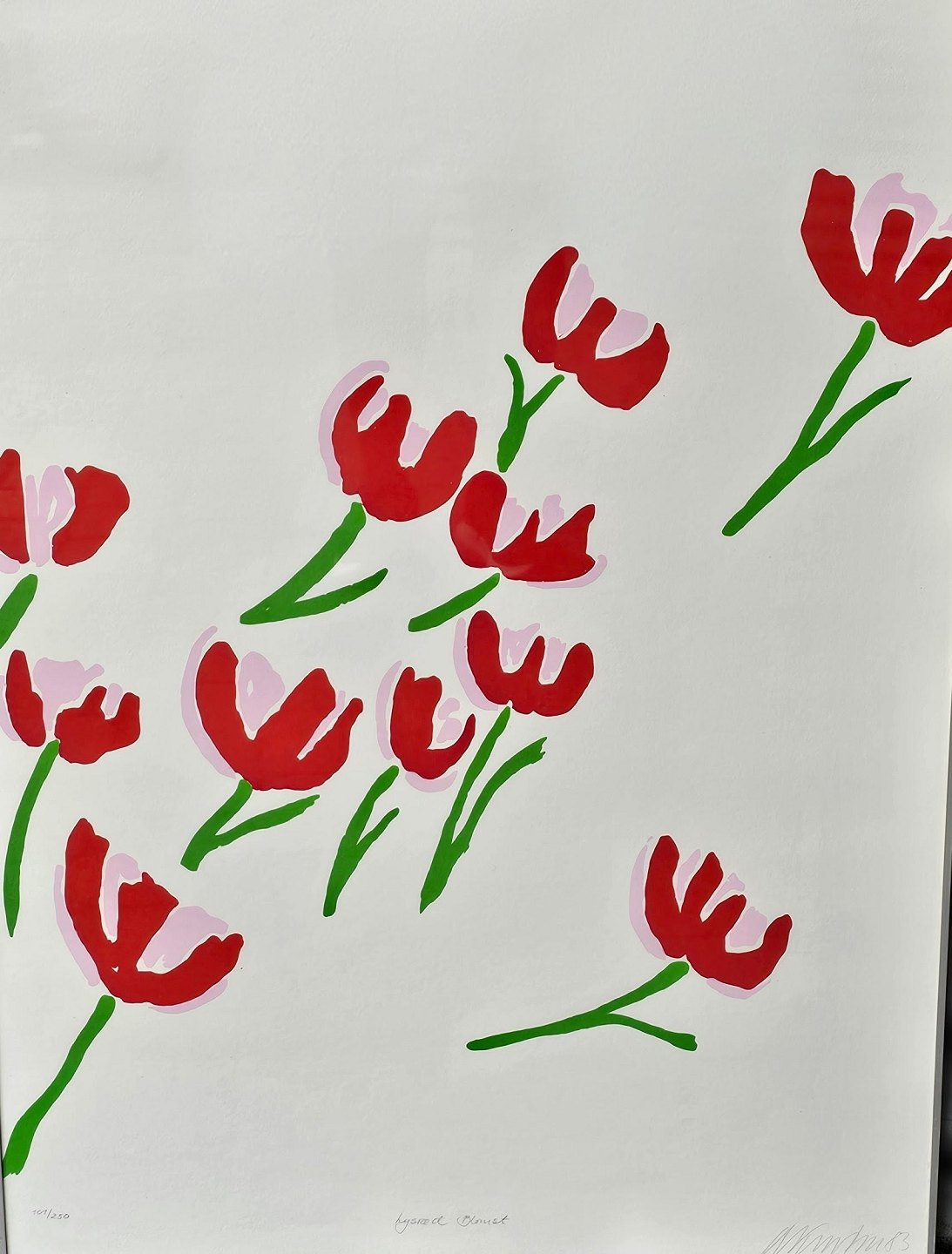 Litografi med motiv af lyserøde blomster monteret i metal rammeNr. 101/250