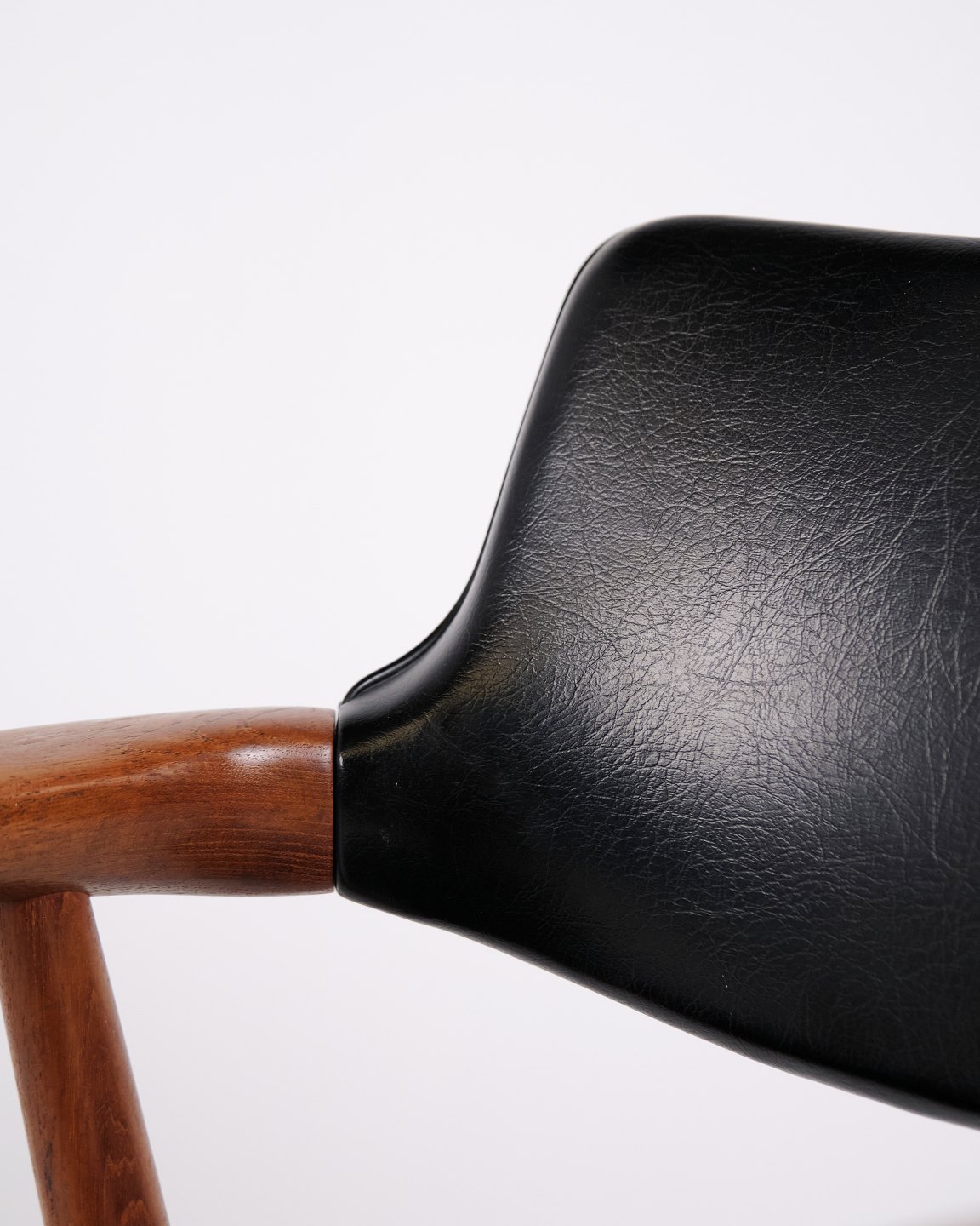 Satz von 6 GM11 Esszimmerstühlen, entworfen von Svend Aage Eriksen für Glostrup Møbelfabrik in den 1960er Jahren. Aus massivem Teak gefertigt mit Sitz- und Rückenflächen aus schwarzem Leder. Das Modell GM11 ist bekannt für organische Linien, leicht geschwungene Armlehnen und hohen Sitzkomfort. Ein klassisches Beispiel für dänisches Mid-Century Design mit hochwertiger Tischlerarbeit und eleganten Proportionen. Wird nur als komplettes Set verkauft.— Herkunft: Dänemark